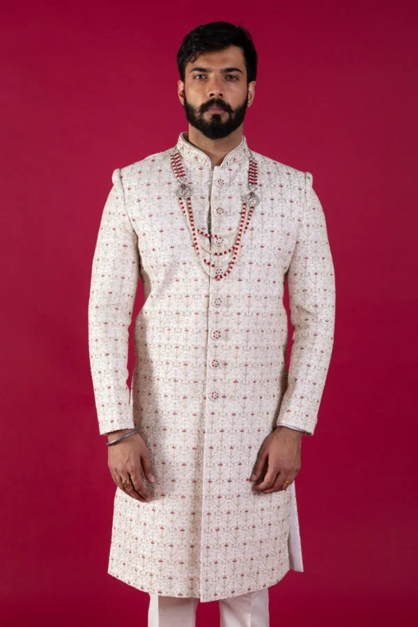 Men’s embroidered sherwani with layered mala
