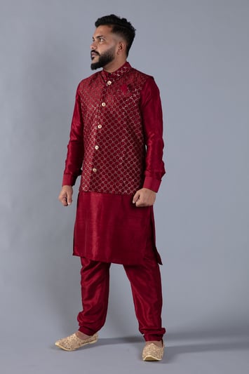 3 Piece men’s waistcoat kurta pyjama – Maroon