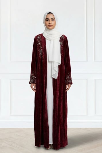 Roza collection velvet embellished open Abaya – Maroon