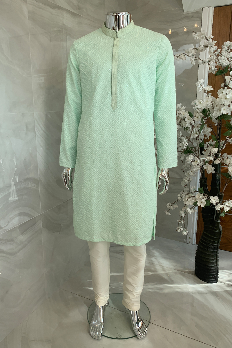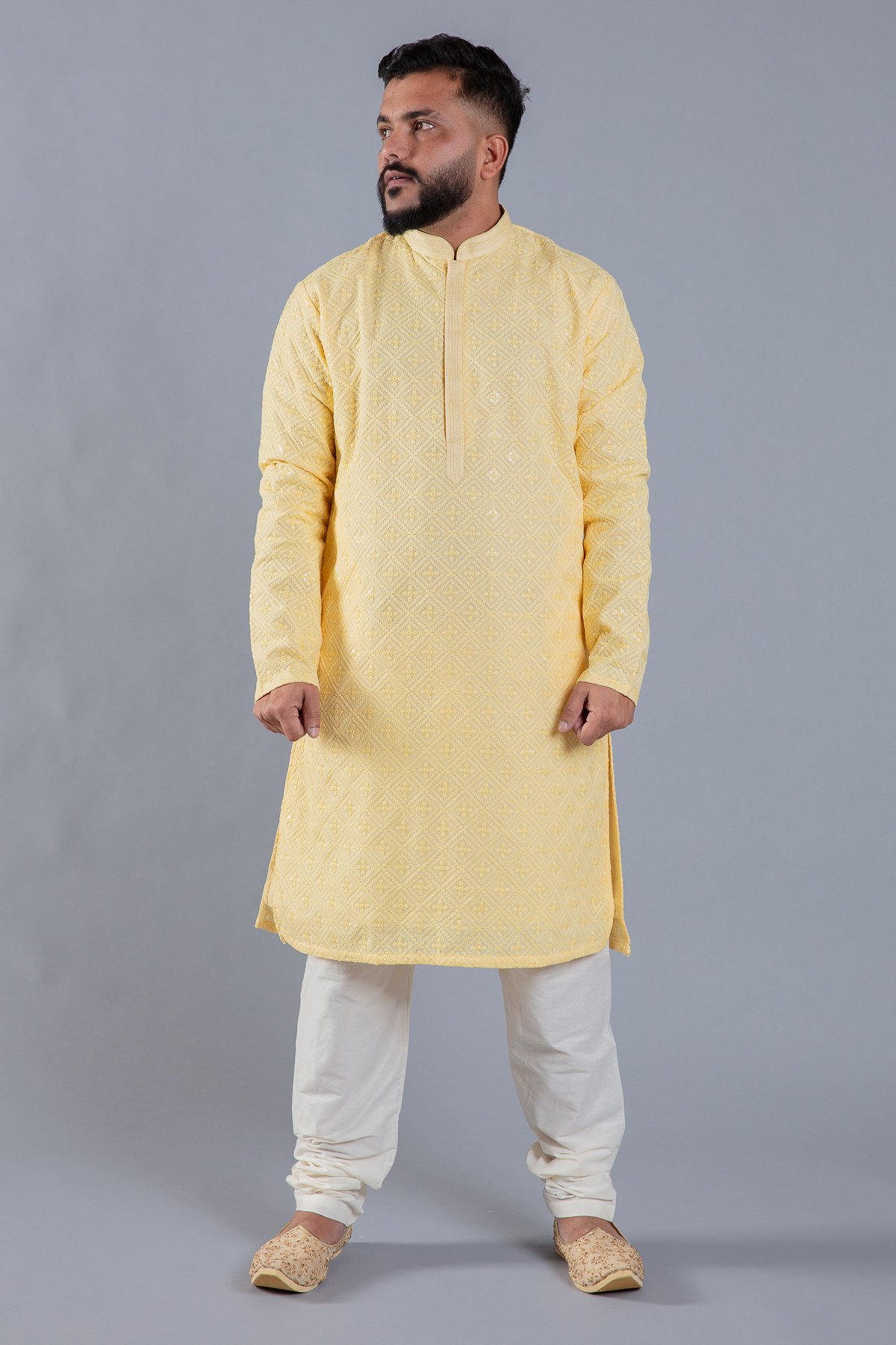 This beautiful 3 piece men’s suit features a straight shirt with thread-work embroidery throughout. It comes with a mandarin embroidered collar with full length embroidered sleeves and it’s finished with contrasted trousers.