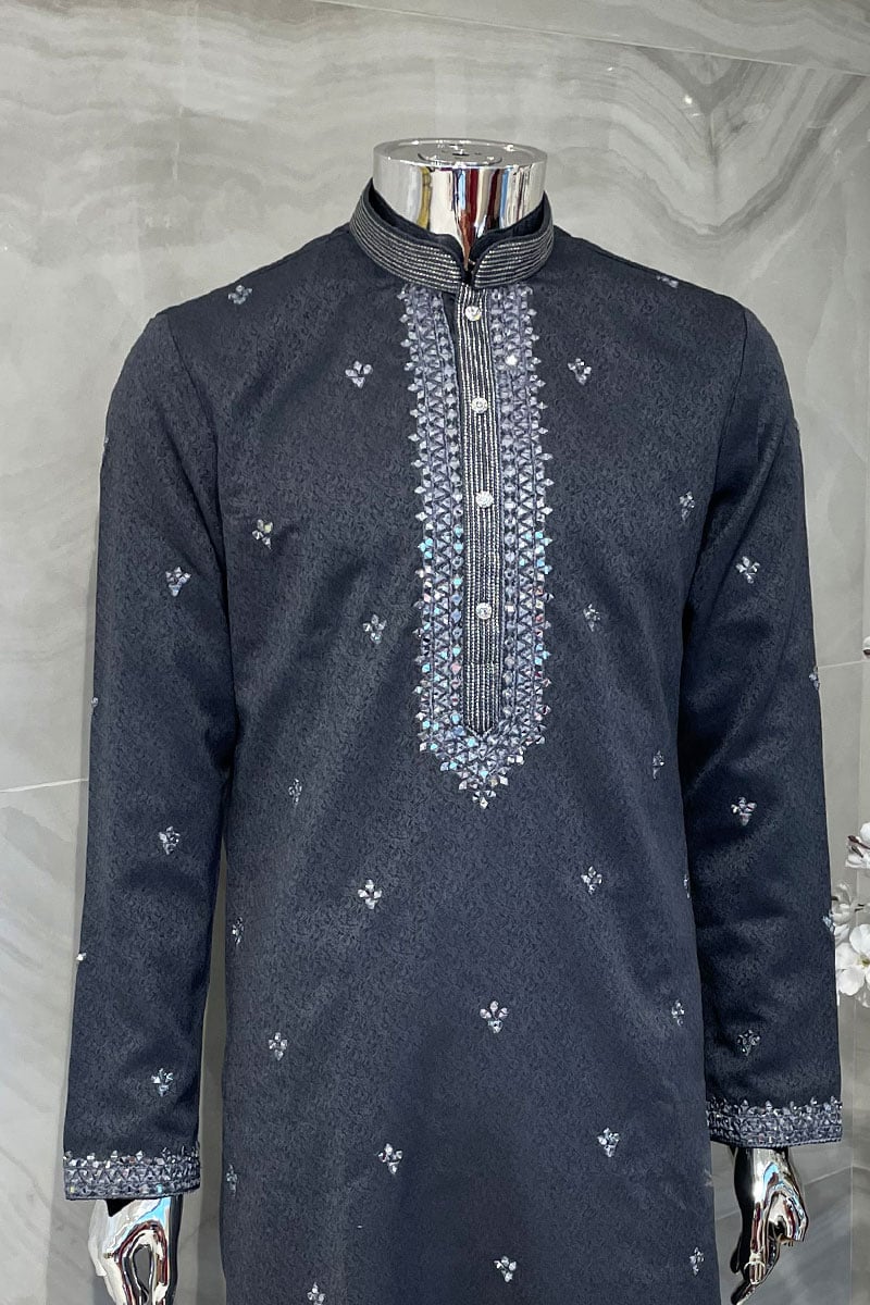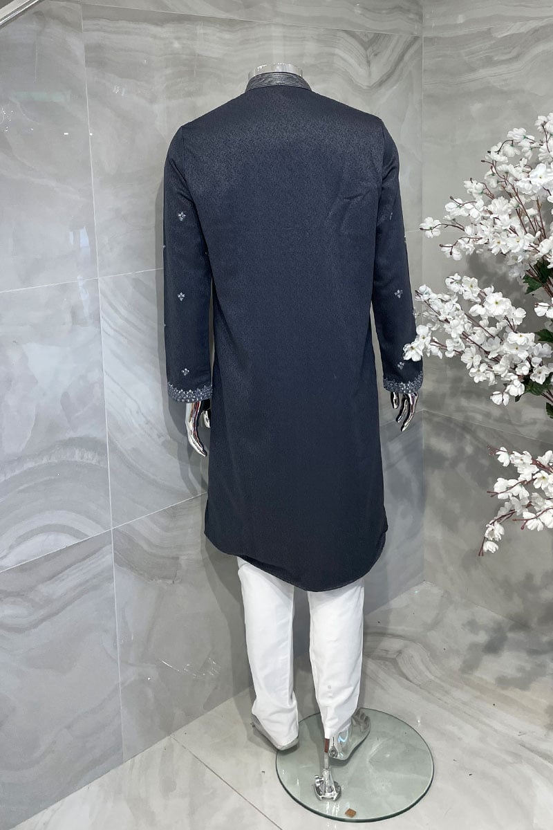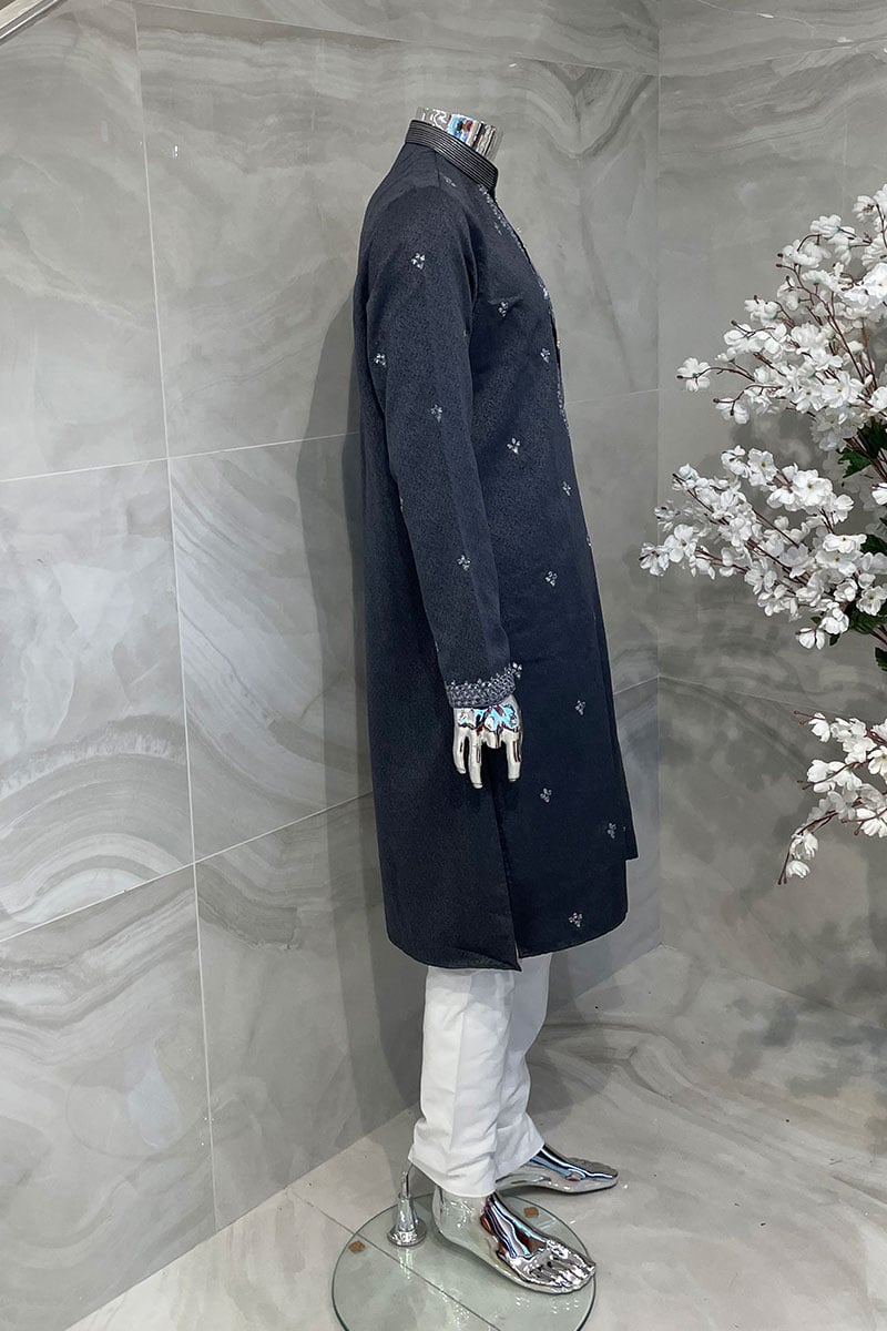 This 2 piece men’s jacquard suit features a straight shirt with luxury thread-work embroidery on the front, back and full length sleeves. It comes with an embroidered collar with button embellishments below it. Contrasted trousers are also included.