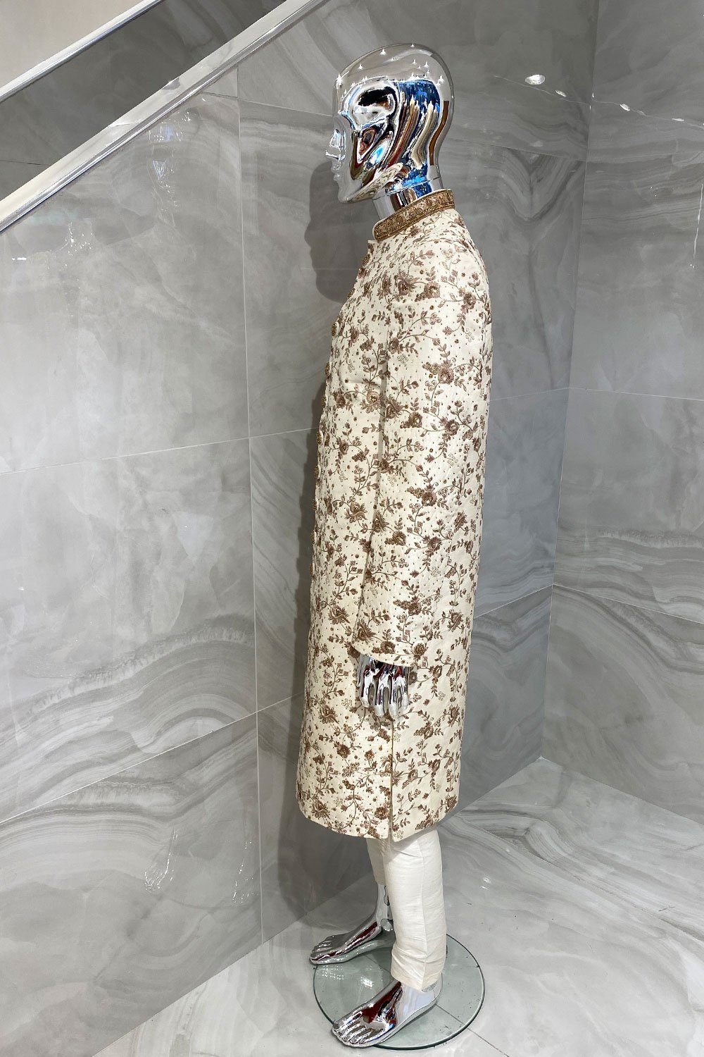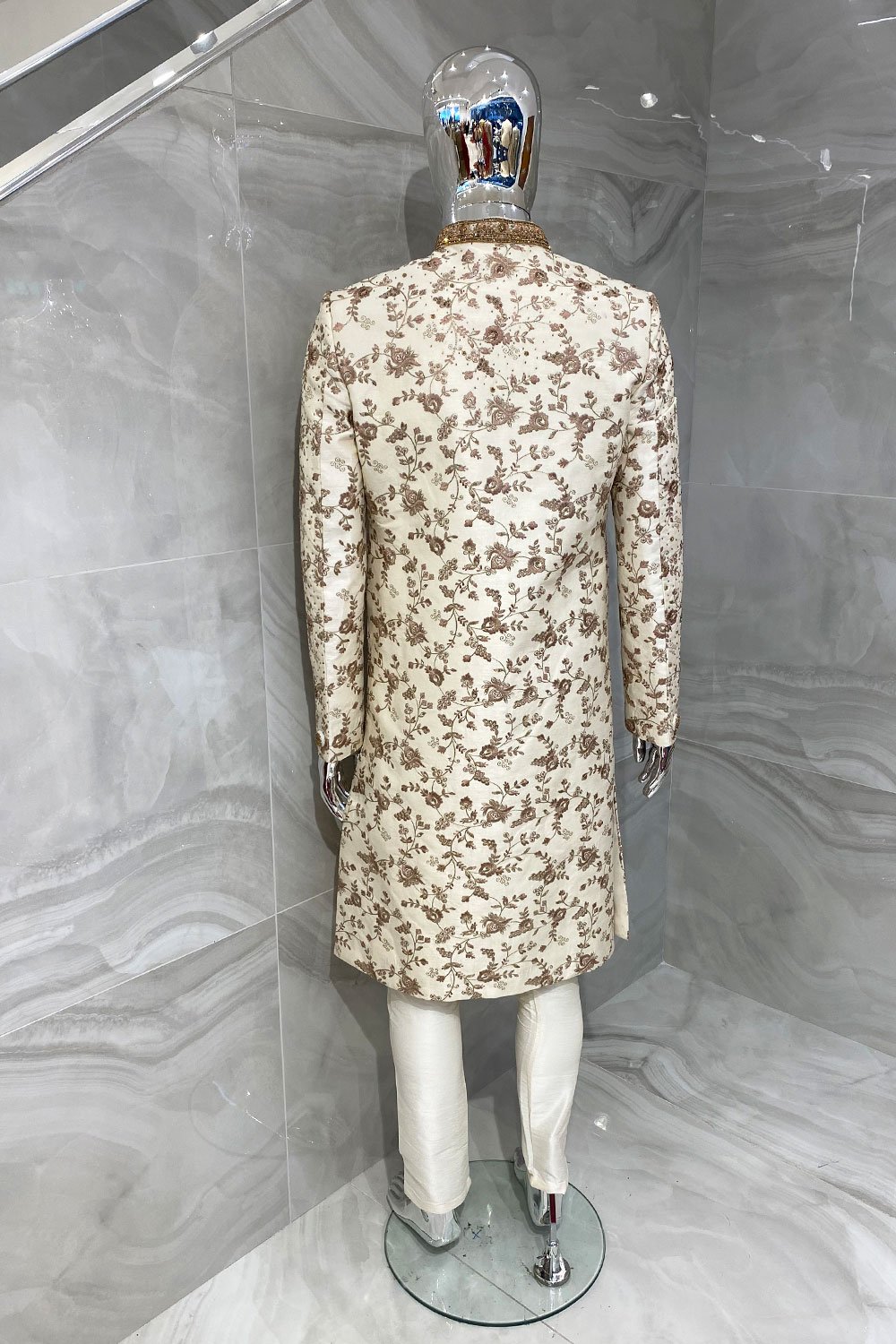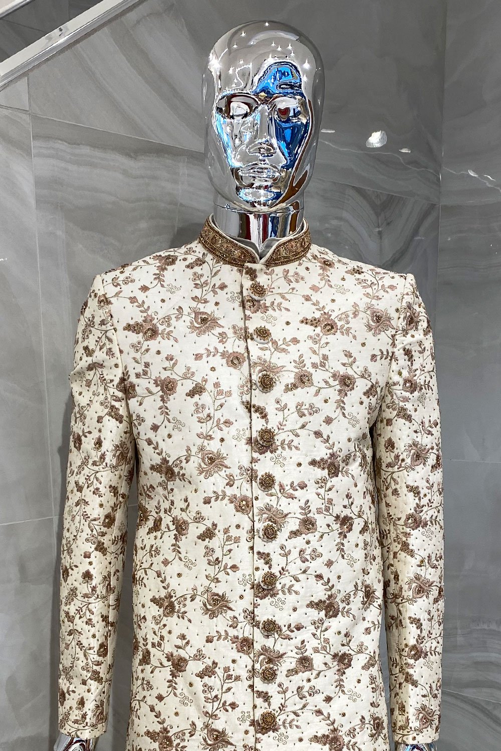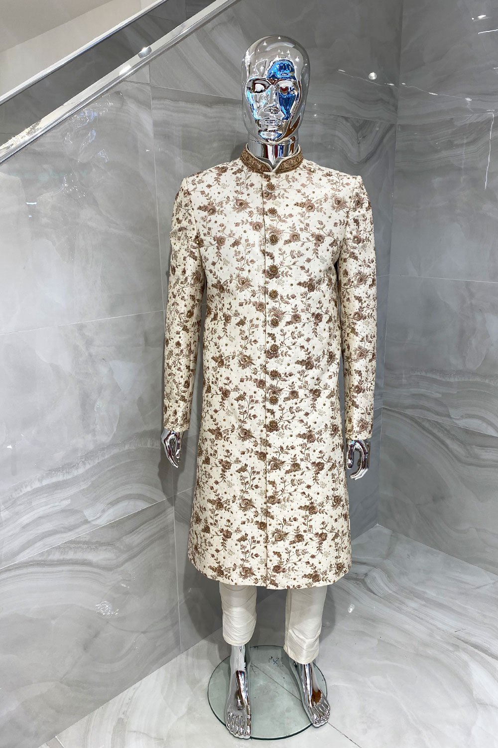 This beautiful mens sherwani features a long coat all closed up to the collar and below the knee lengthwise. It is designed with multi coloured thread-work embroidered detailing all over the front and full length sleeves. It comes with an embroidered mandarin collar and button embellishments on the front. It comes with a plain dupion silk trouser.