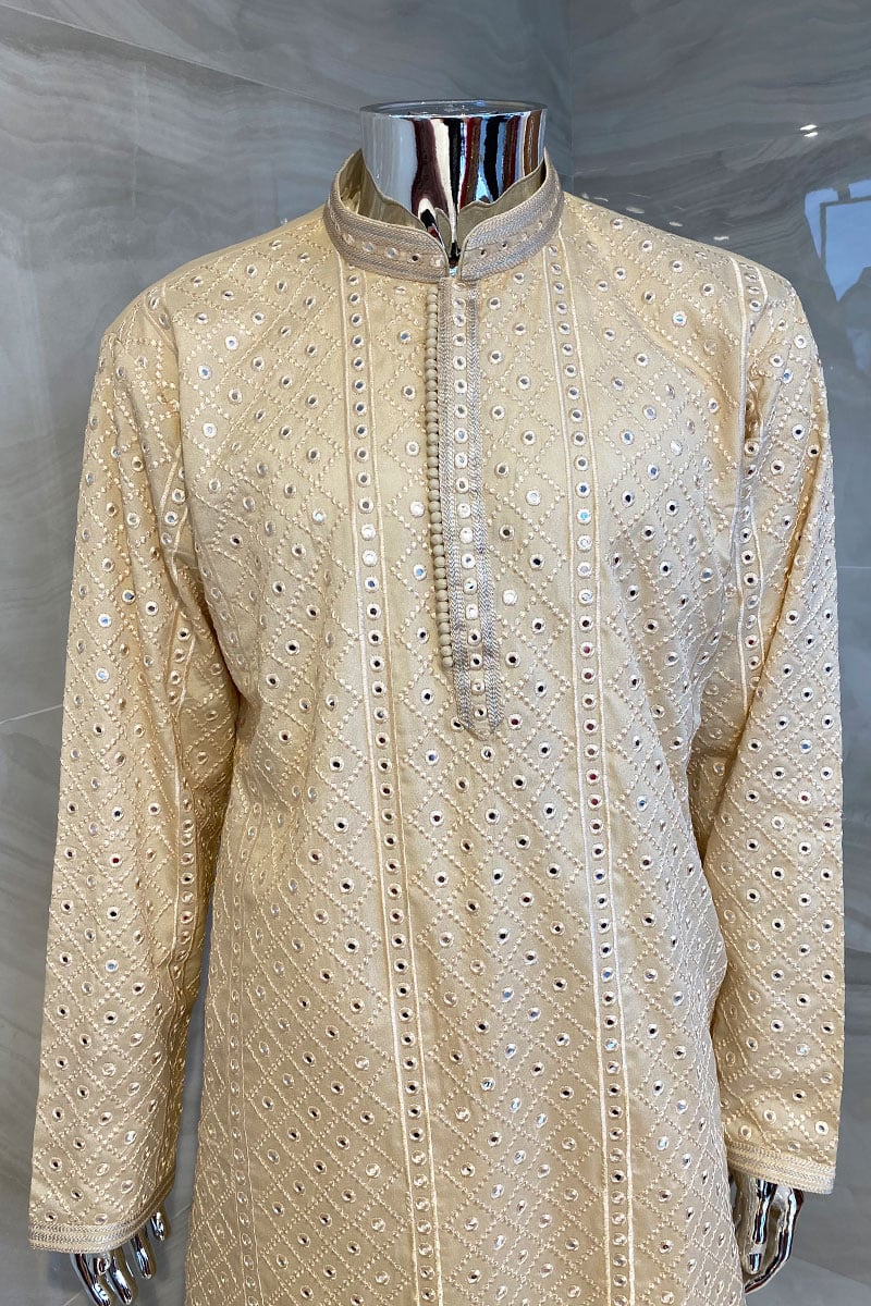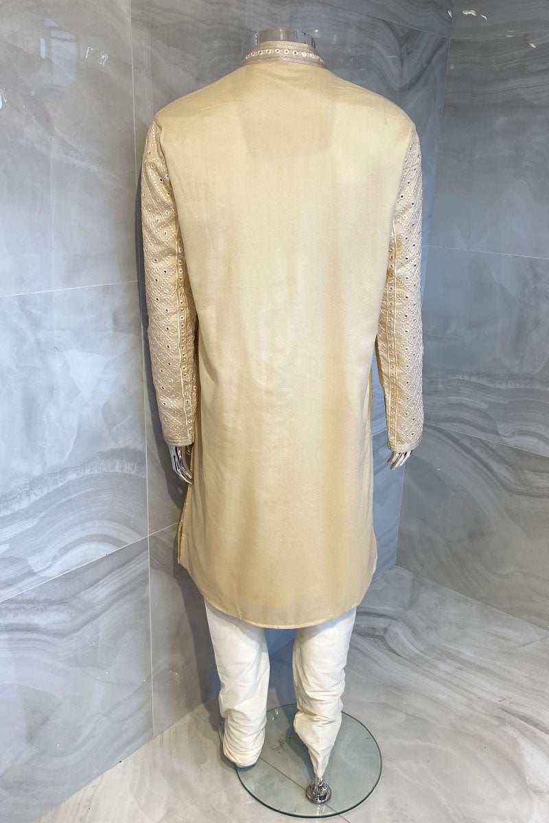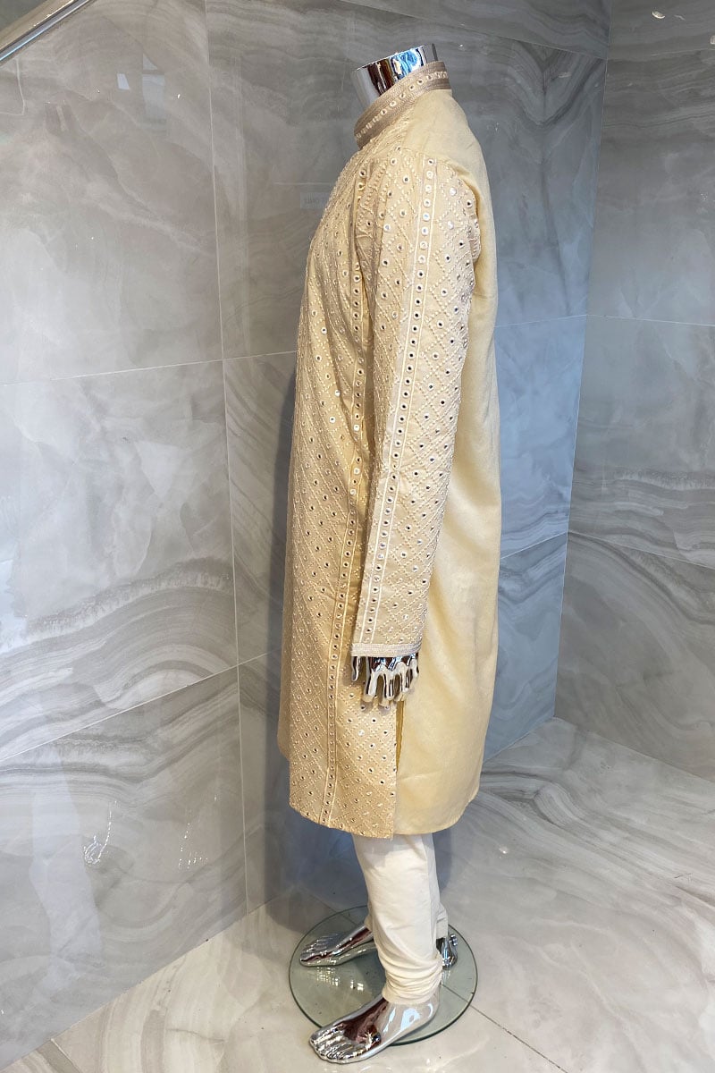 This beautiful 3 piece men’s suit features a straight shirt with thread-work embroidery throughout along with mirror embellishments. It comes with a mandarin embroidered collar with button embellishments. It comes with full length embroidered sleeves and it’s finished with straight churidaar trousers.