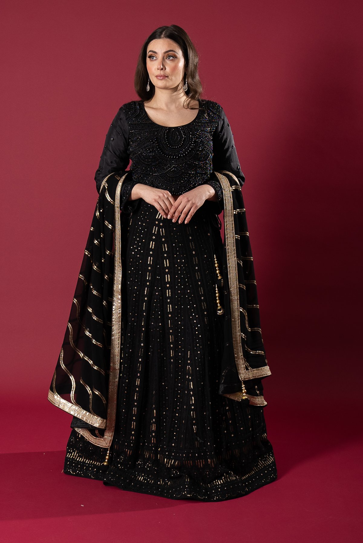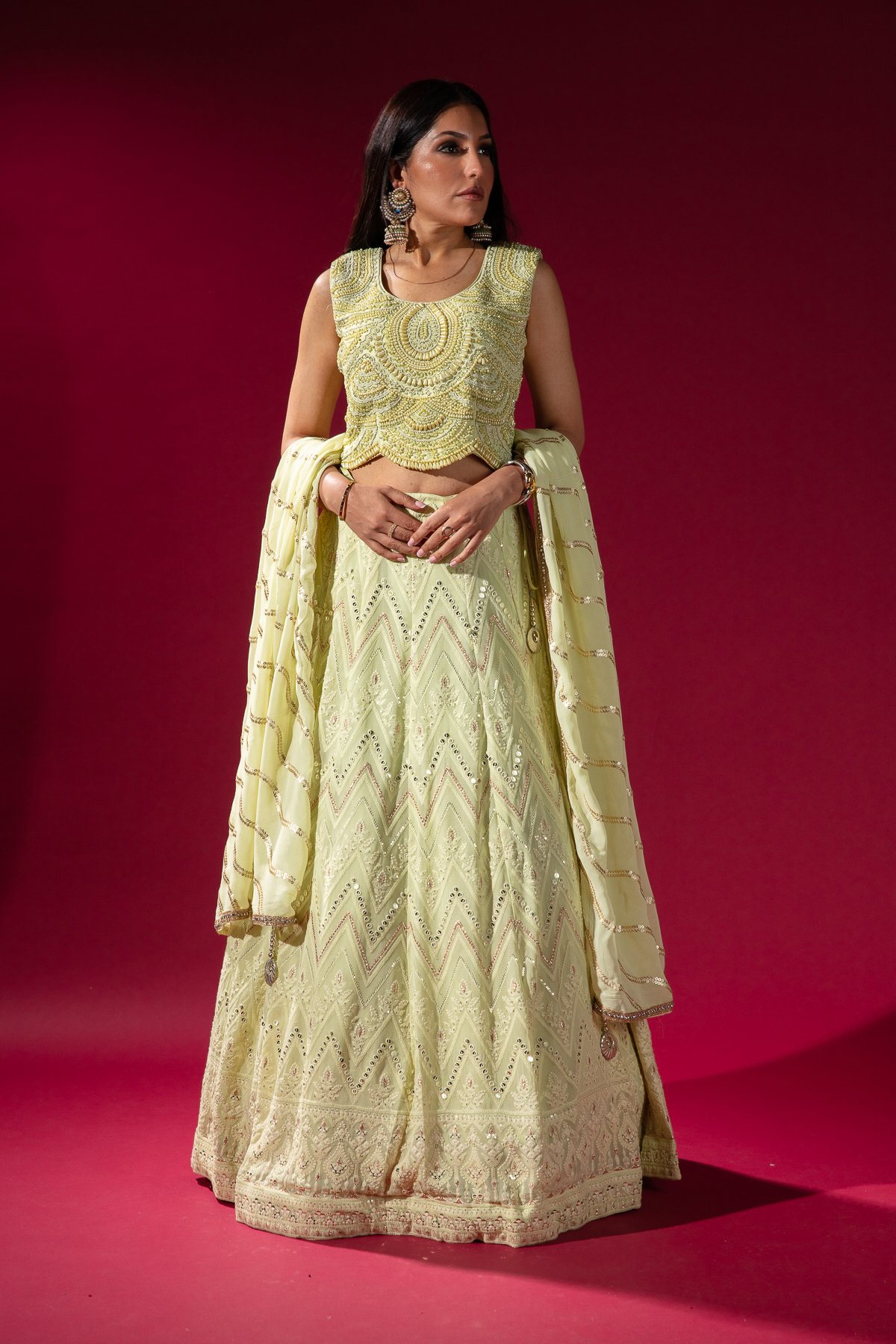 This beautiful 3 piece lengha choli features a short sleeveless top with luxury beaded embroidery throughout. It comes with a chicken kari thread work embroidered chiffon lengha and the look is finished with a chiffon embroidered dupatta.