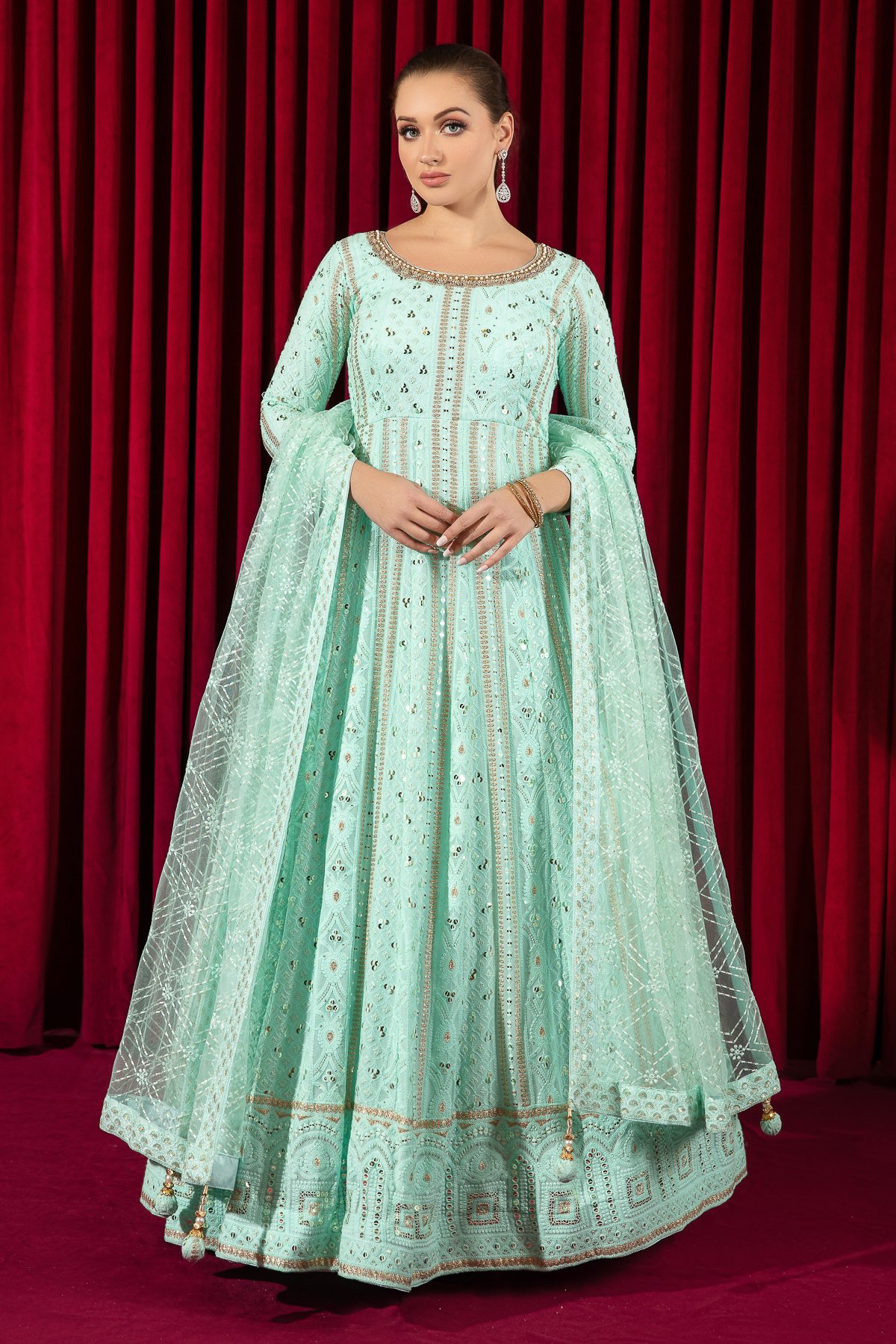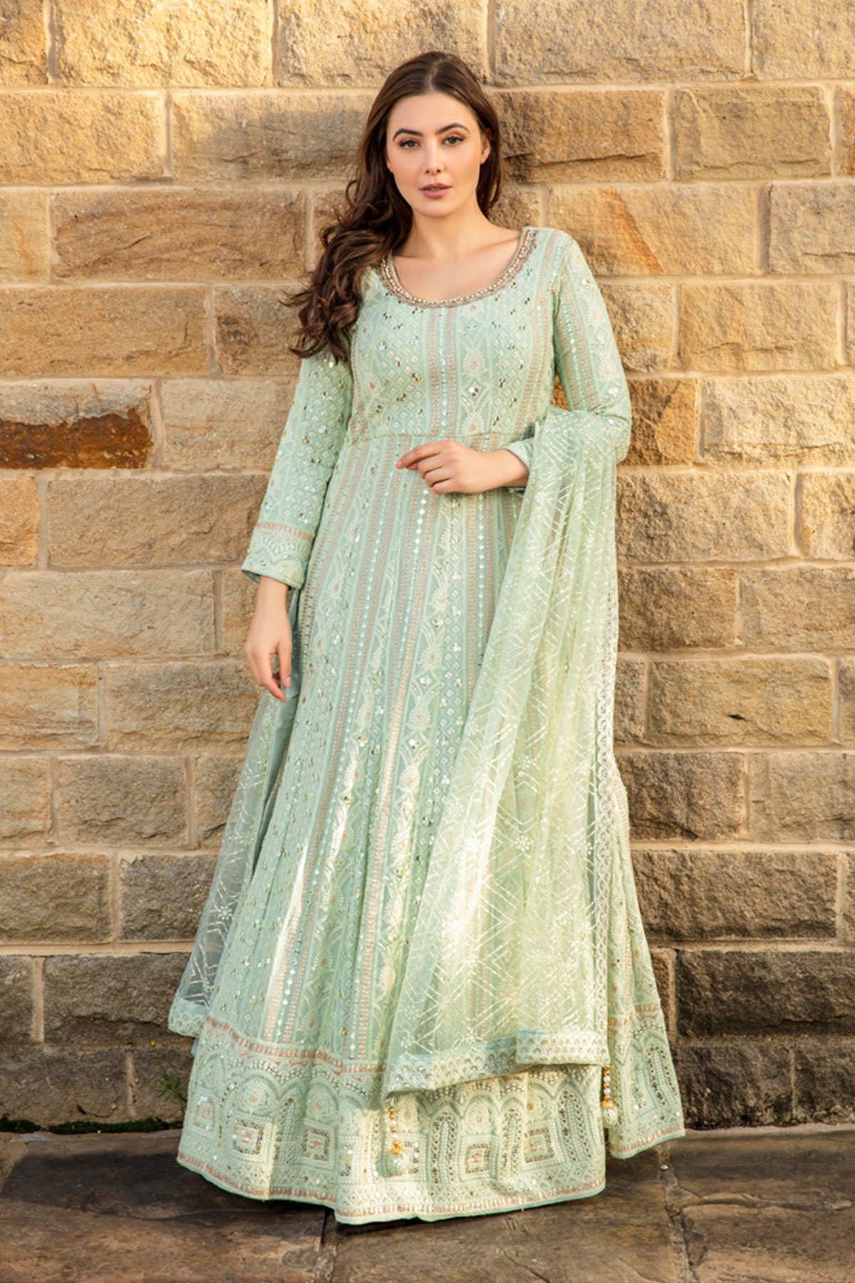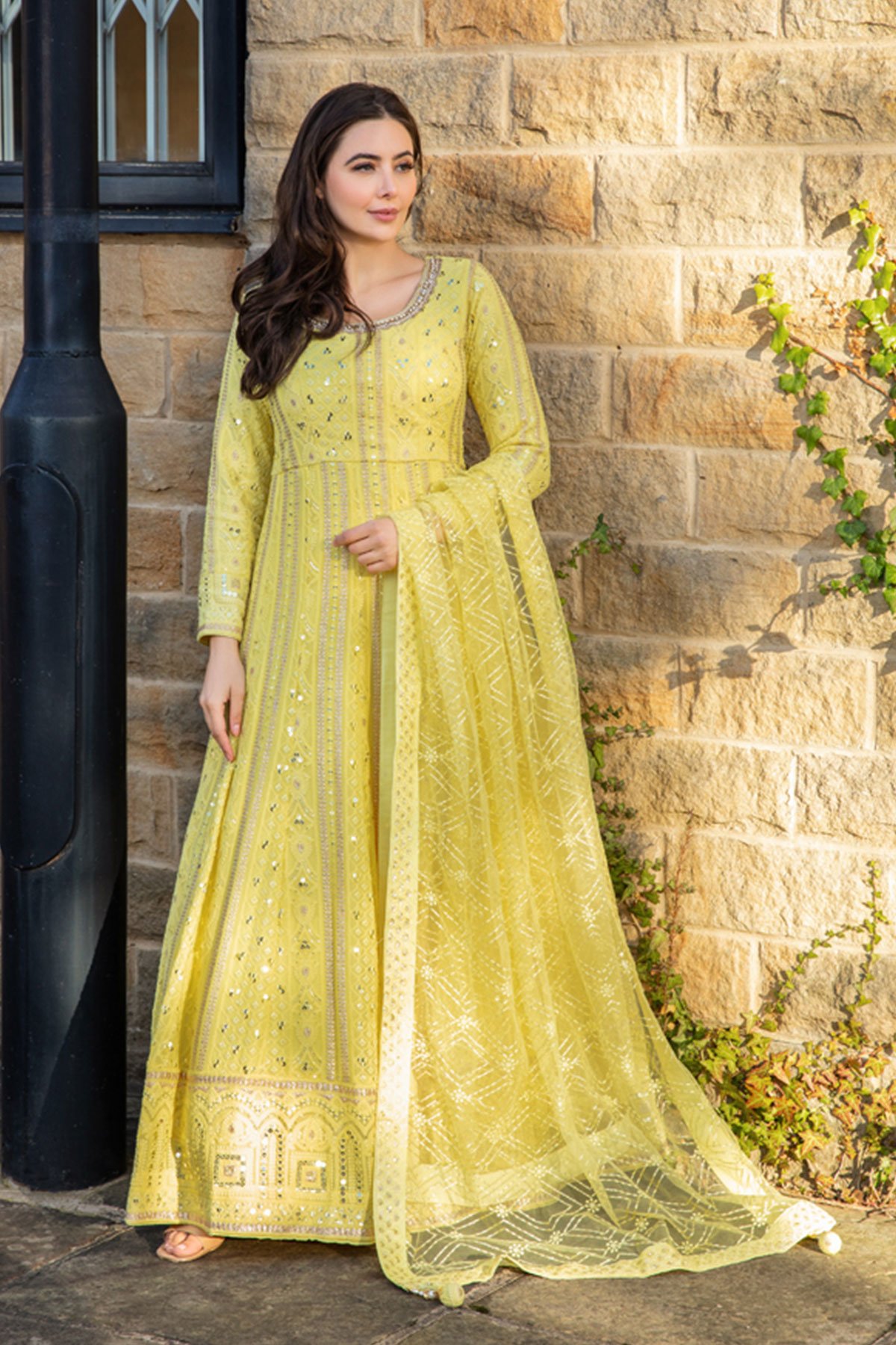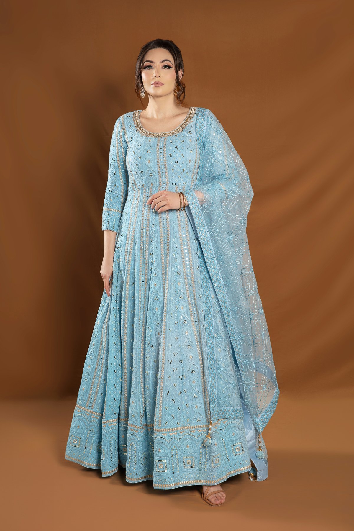 This beautiful 3 piece luxury embroidered gown features luxury thread work chikan kari and sequence embroidery throughout the front and back with luxury beaded embroidered neckline with full length sleeves. The look is finished with can can embellishments under the gown, jersey leggings and an embroidered net dupatta.