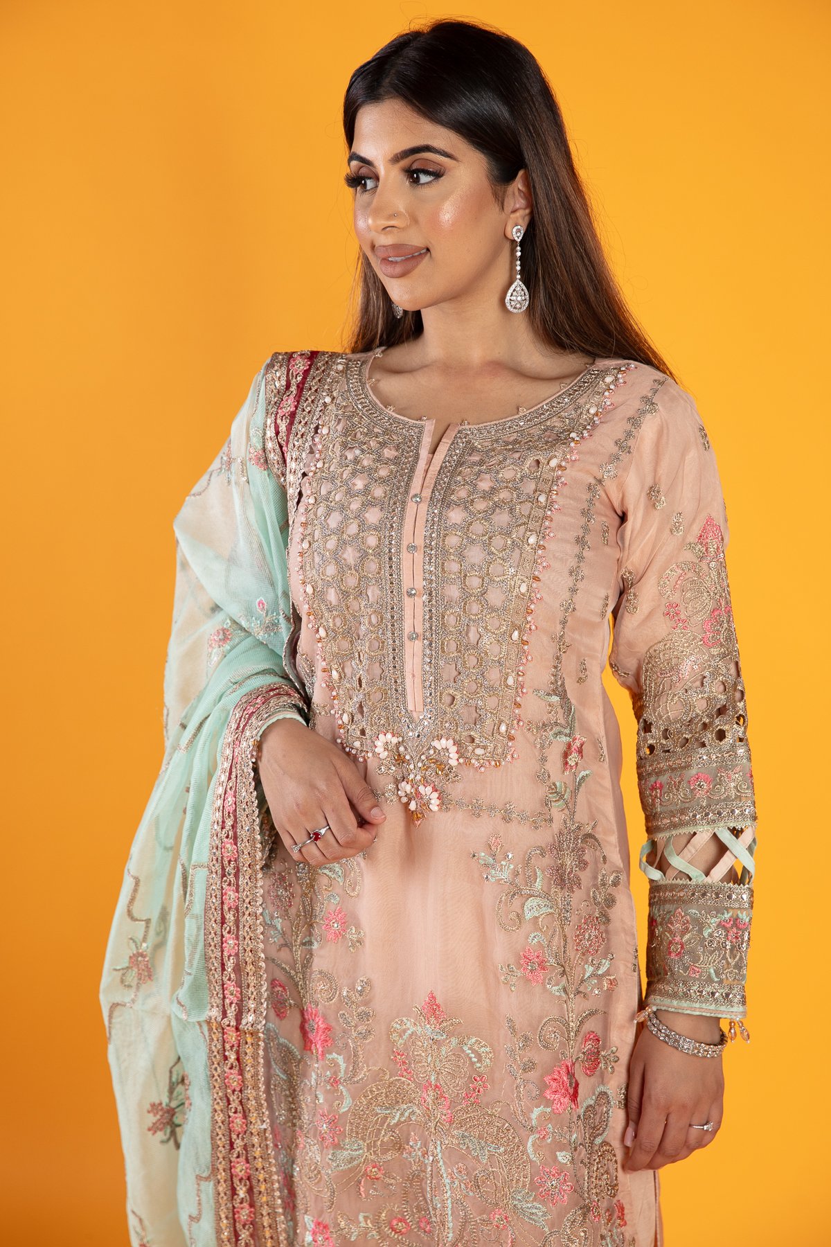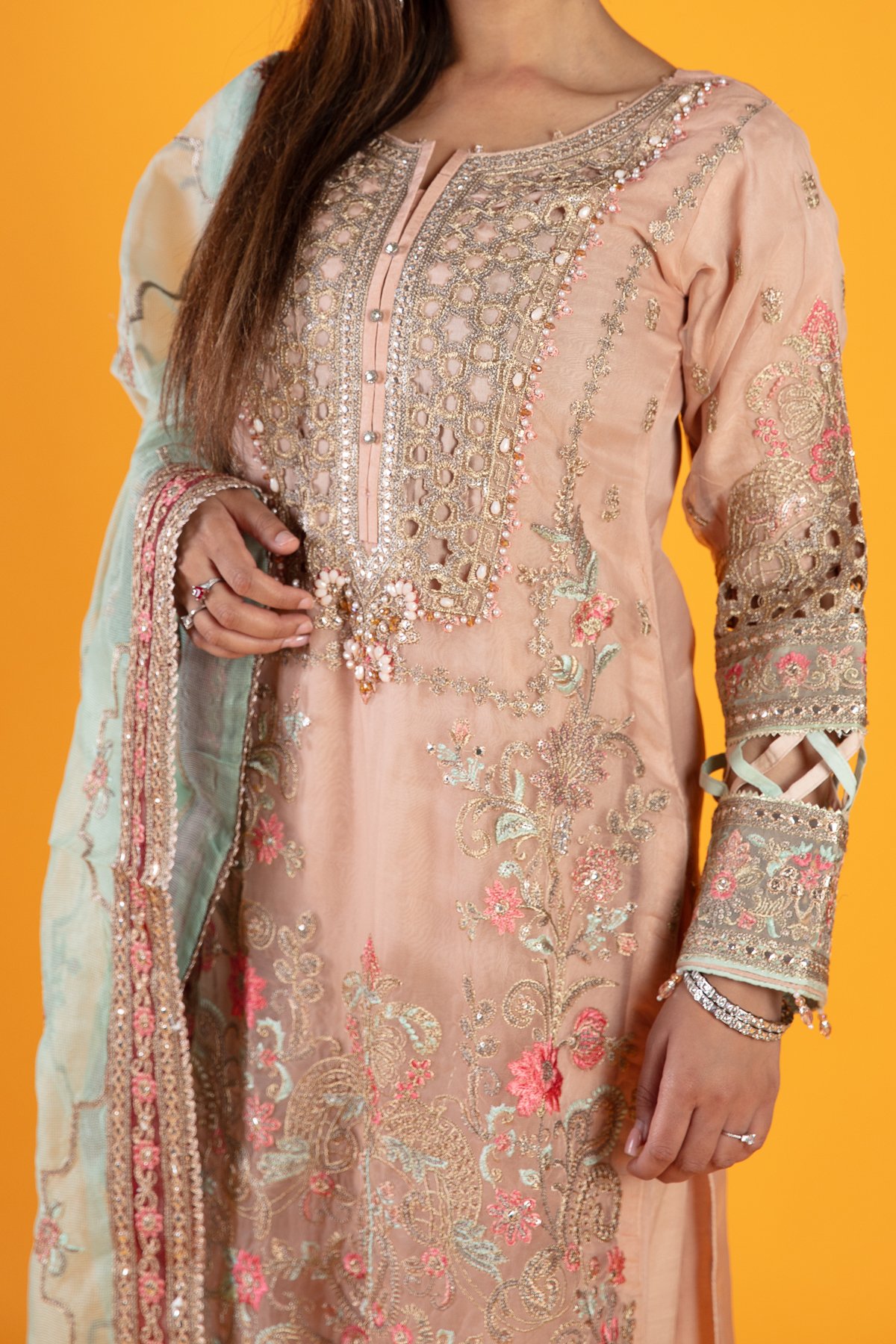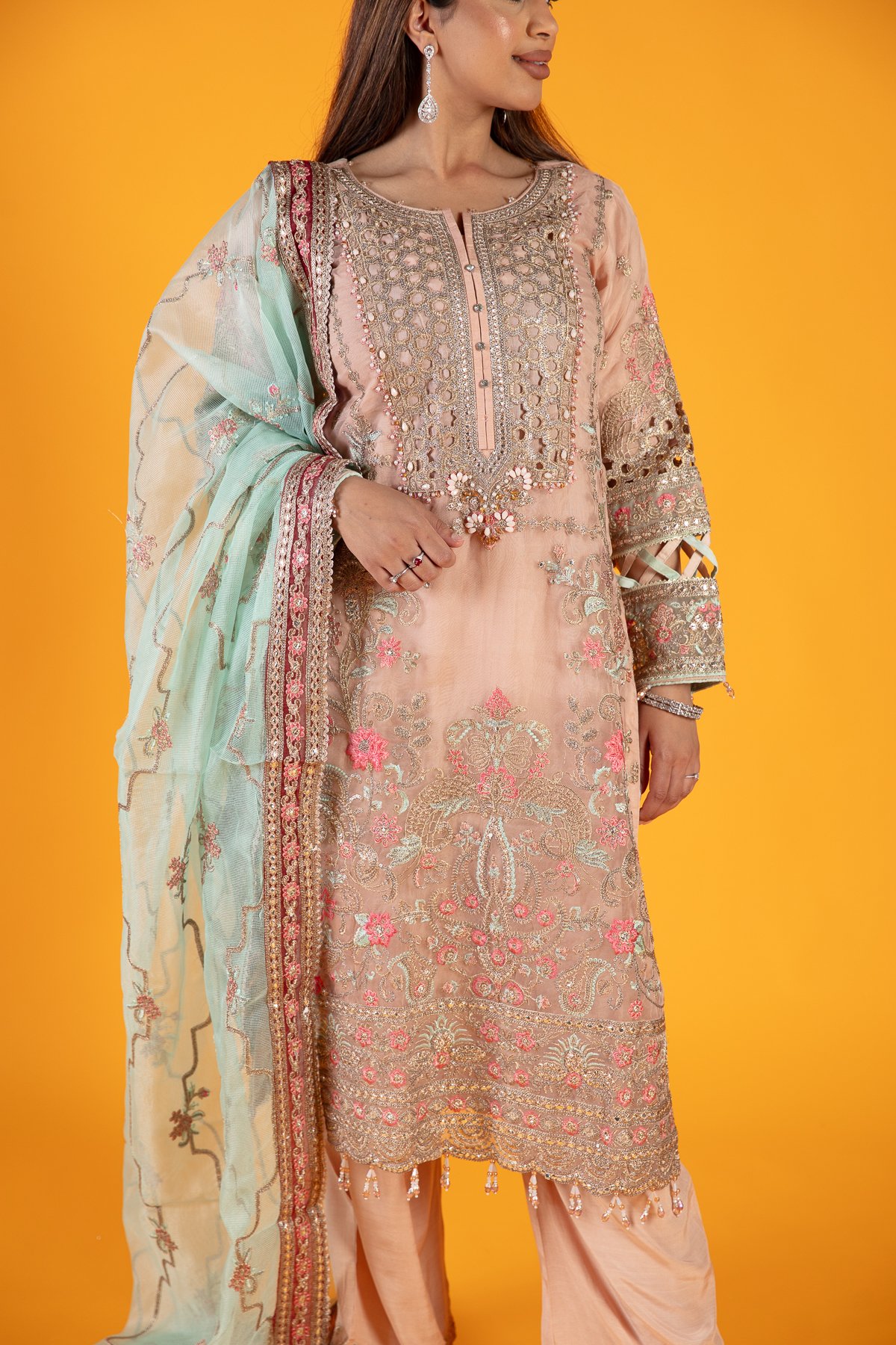 This beautiful 3 piece suit features a straight shirt with cut work embroidered front with bead embellishments, finished with thread work embroidery throughout along with dangling beads on the border. It comes with full length embroidered sleeves and straight leg crepe trousers. The look is finished with a contrasted organza dupatta.