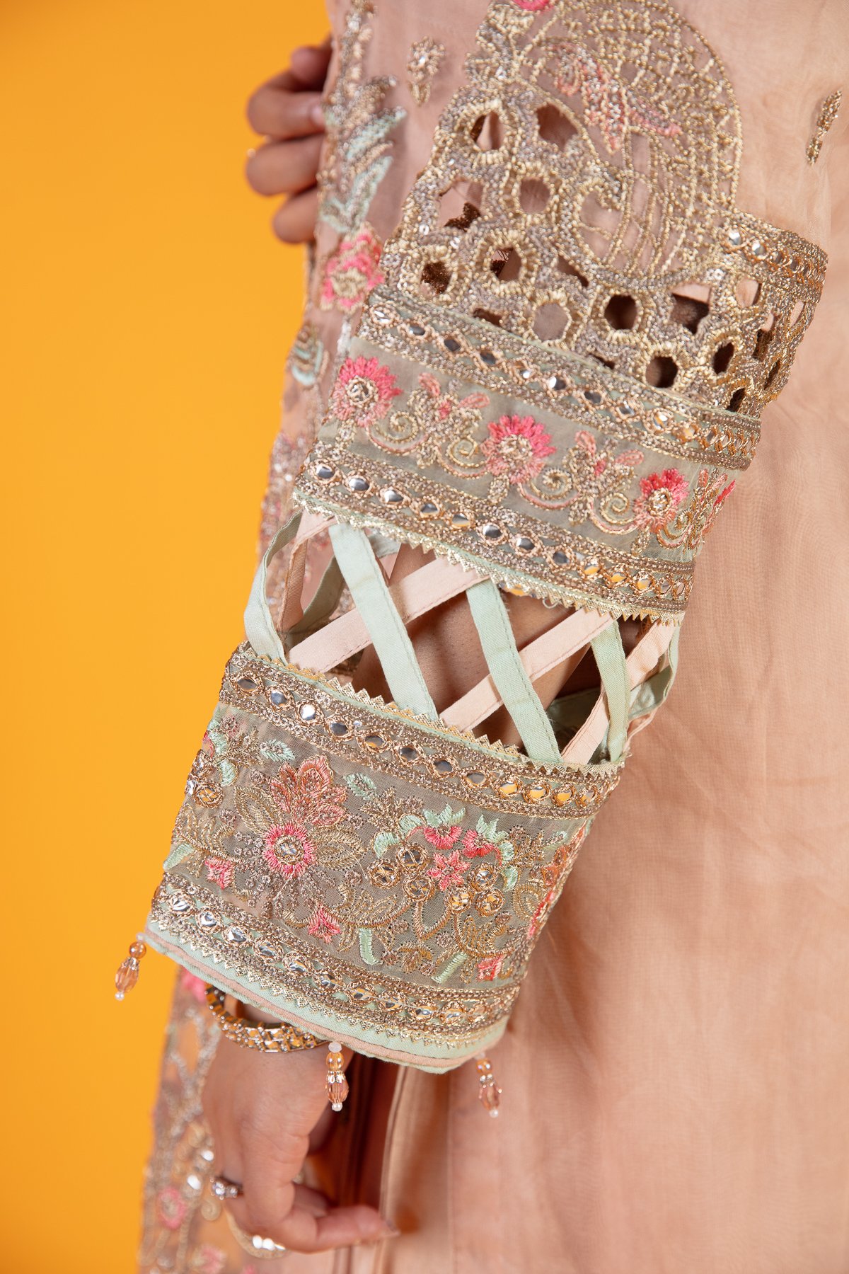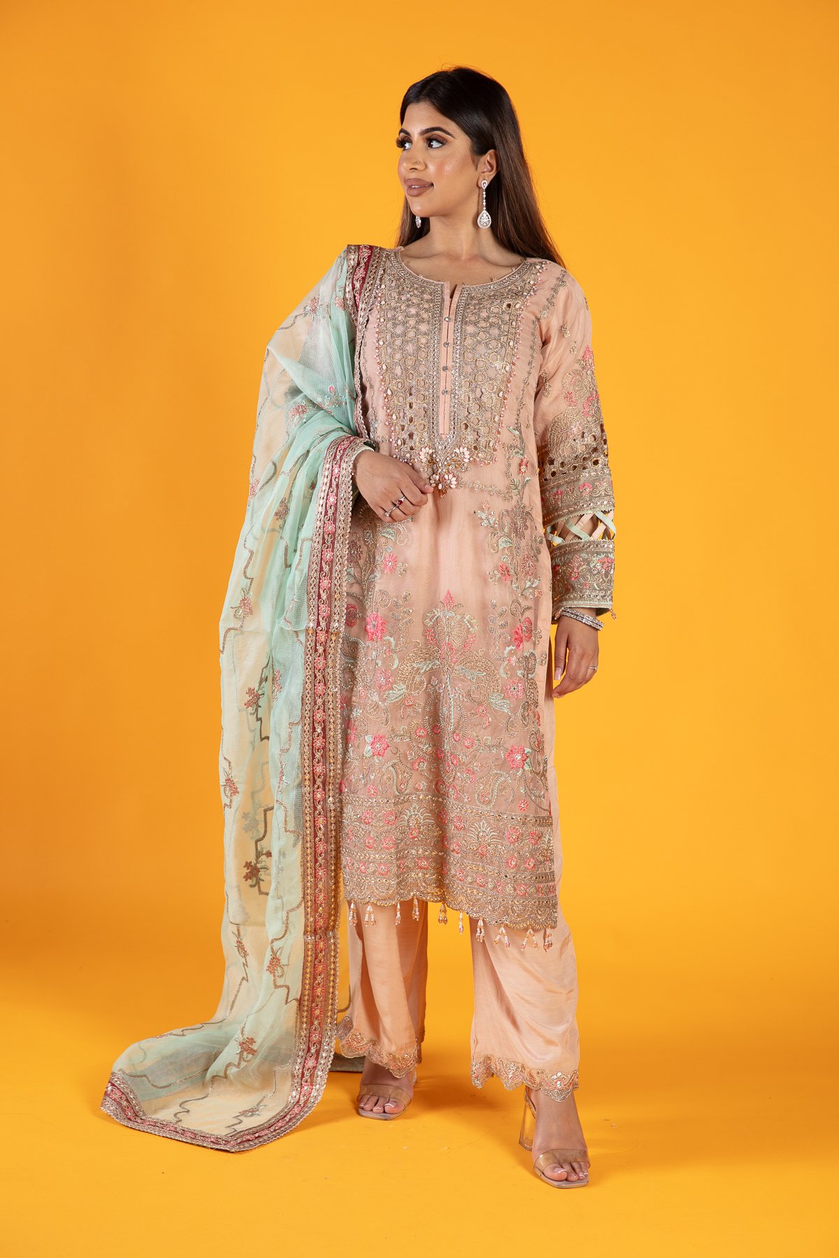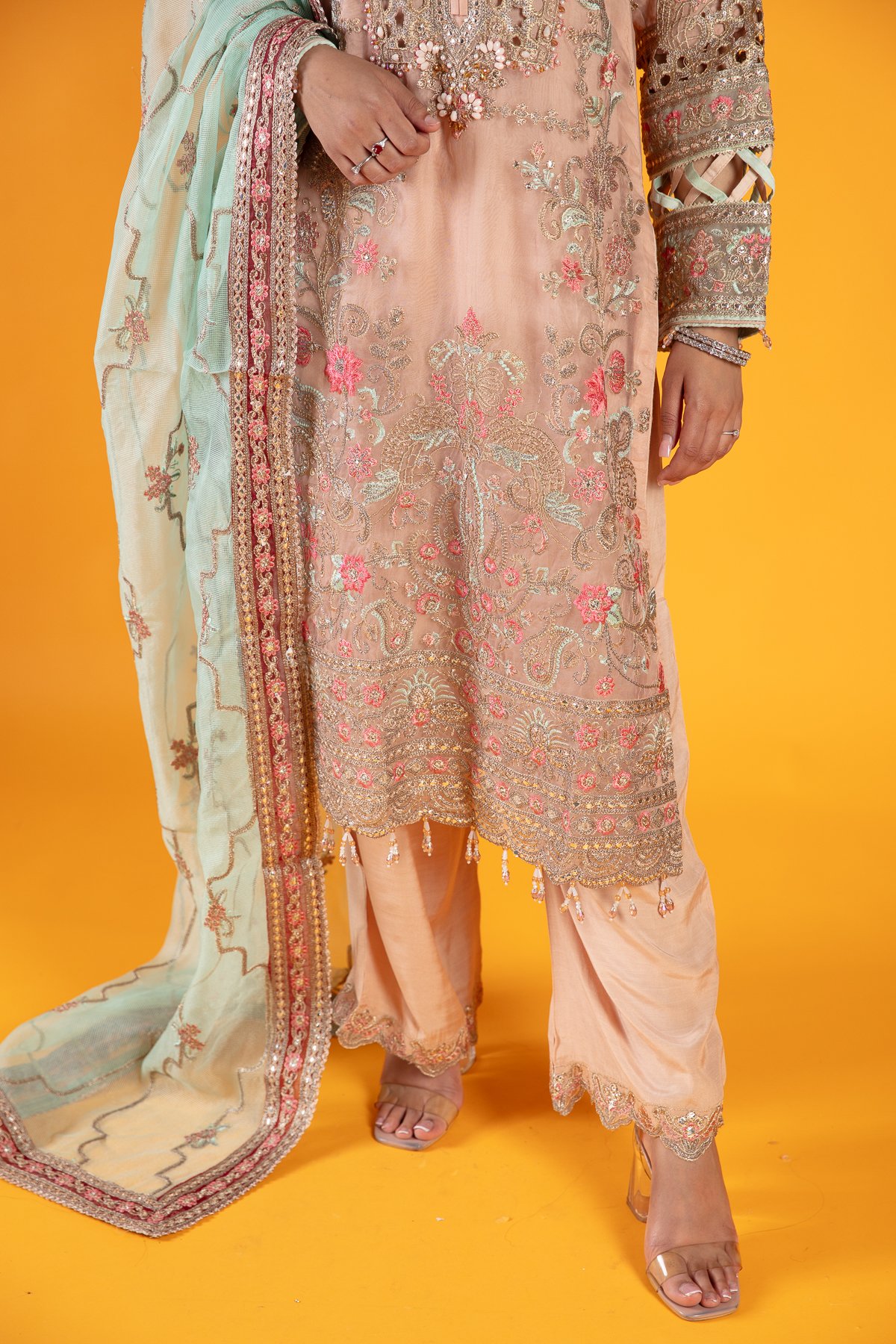 This beautiful 3 piece suit features a straight shirt with cut work embroidered front with bead embellishments, finished with thread work embroidery throughout along with dangling beads on the border. It comes with full length embroidered sleeves and straight leg crepe trousers. The look is finished with a contrasted organza dupatta.
