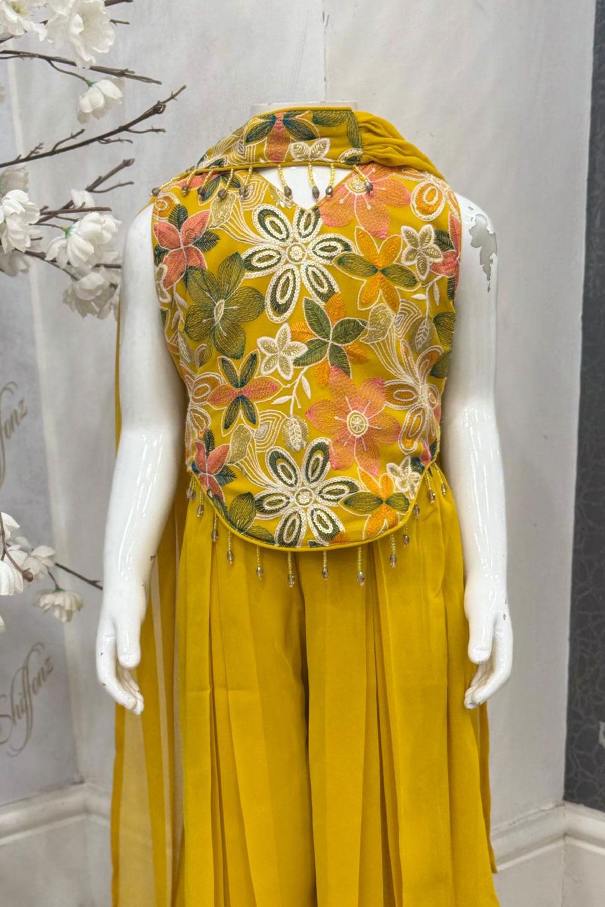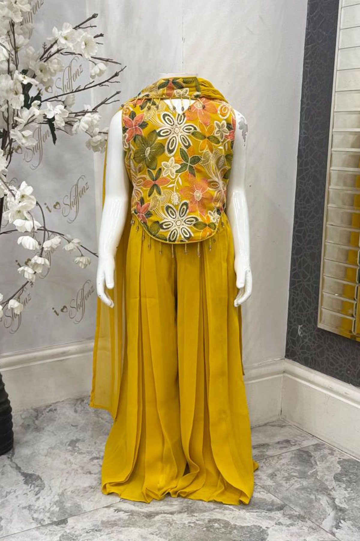 This beautiful outfit is crafted from luxurious chiffon, featuring an intricately embroidered sleeveless top paired with a flowy sharara for a trendy yet traditional look. The set is completed with a lightweight chiffon dupatta, adding an elegant finishing touch. Perfect for weddings, festive occasions, and formal gatherings, this ensemble blends sophistication with comfort.