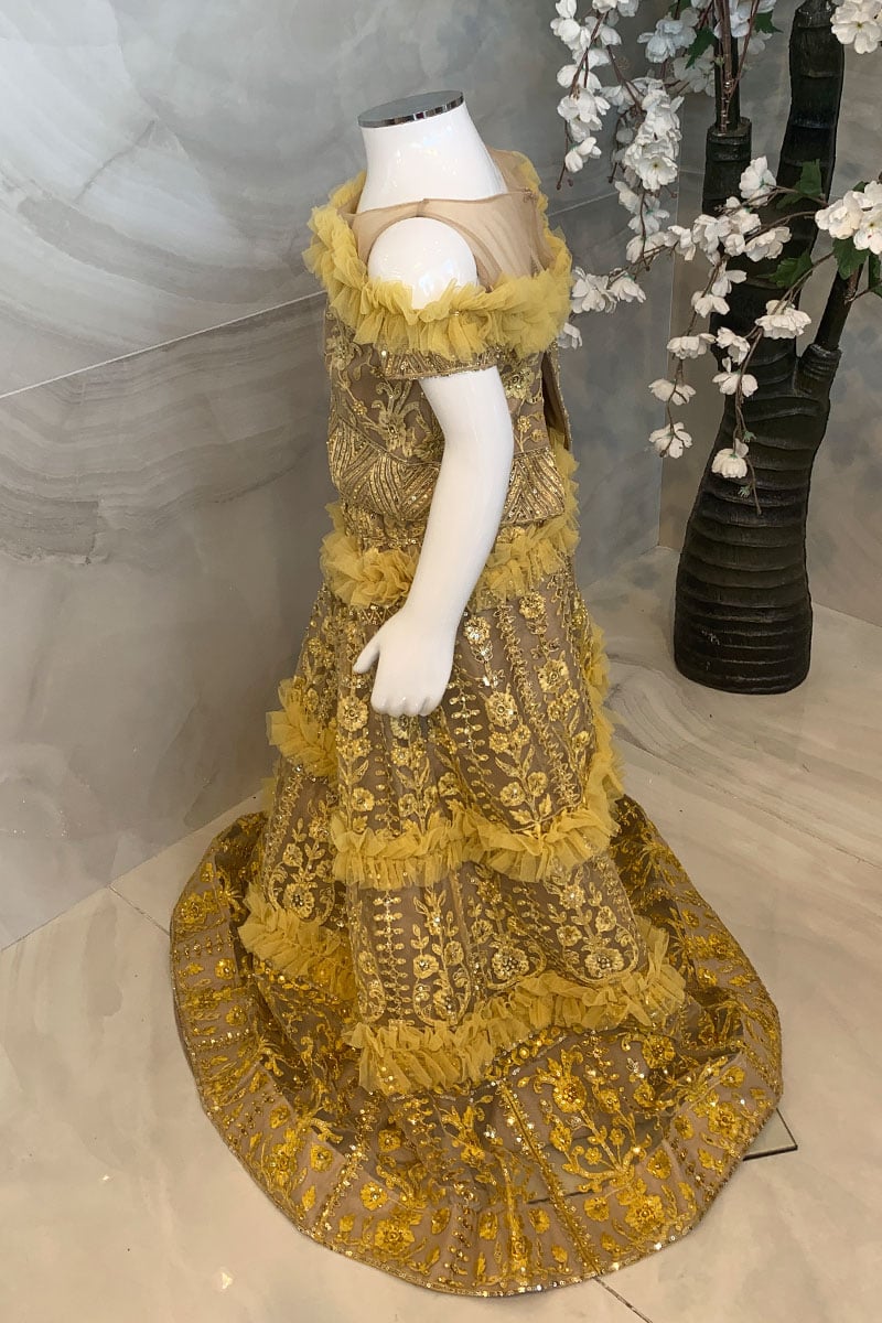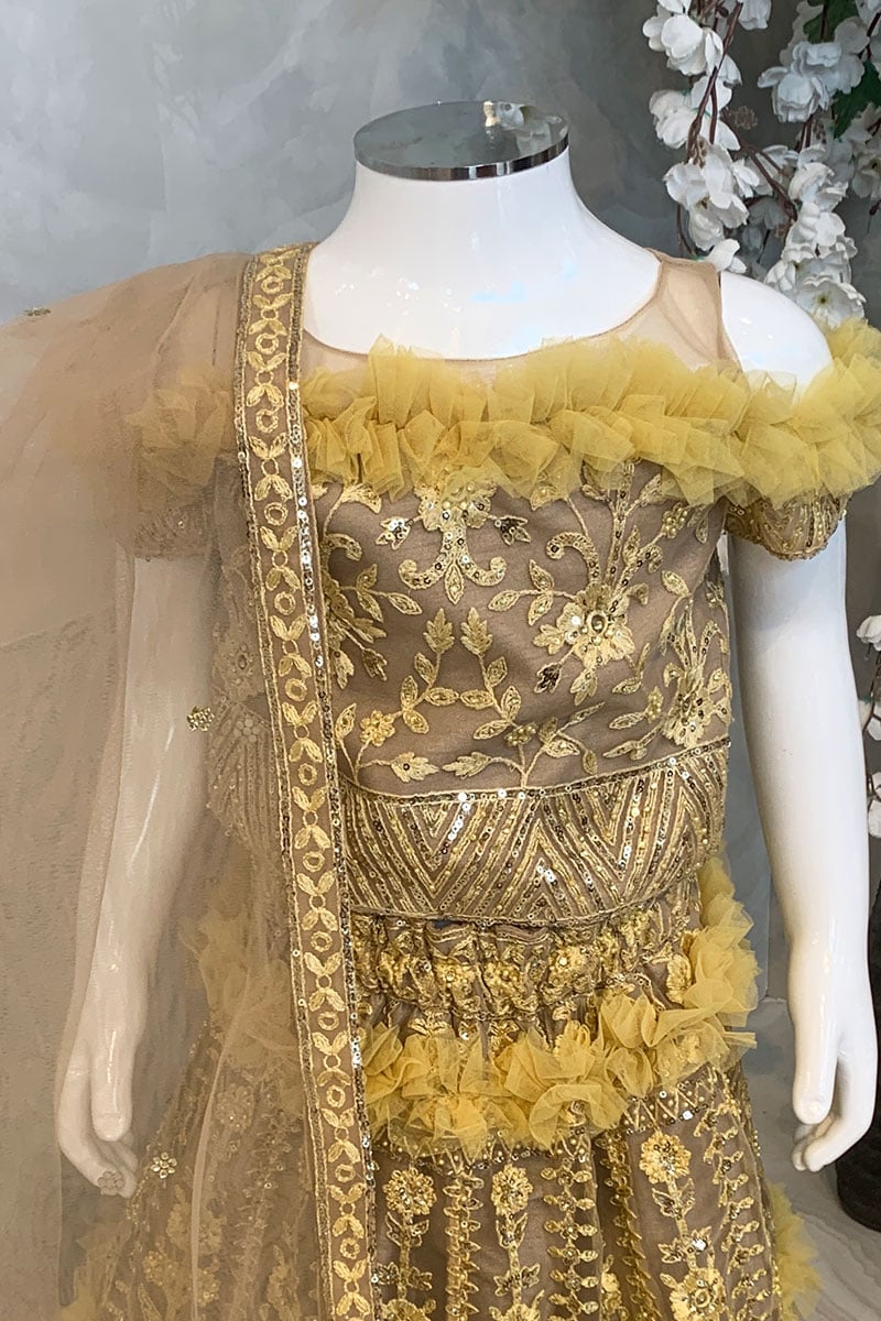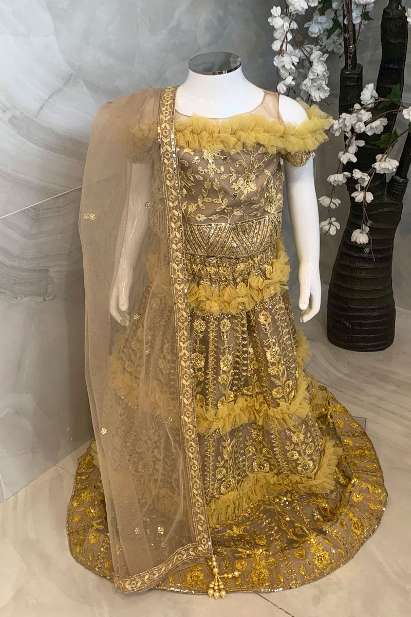 This beautiful 3 piece kids net lengha choli features a short top with threadwork embroidery with sequence embellishments, followed with short length sleeves with a shoulder cut design and ruffled pattern around the chest. It coms with a luxury embroidered lengha with three layered ruffled patterns and the look is finished with an organza dupatta.
