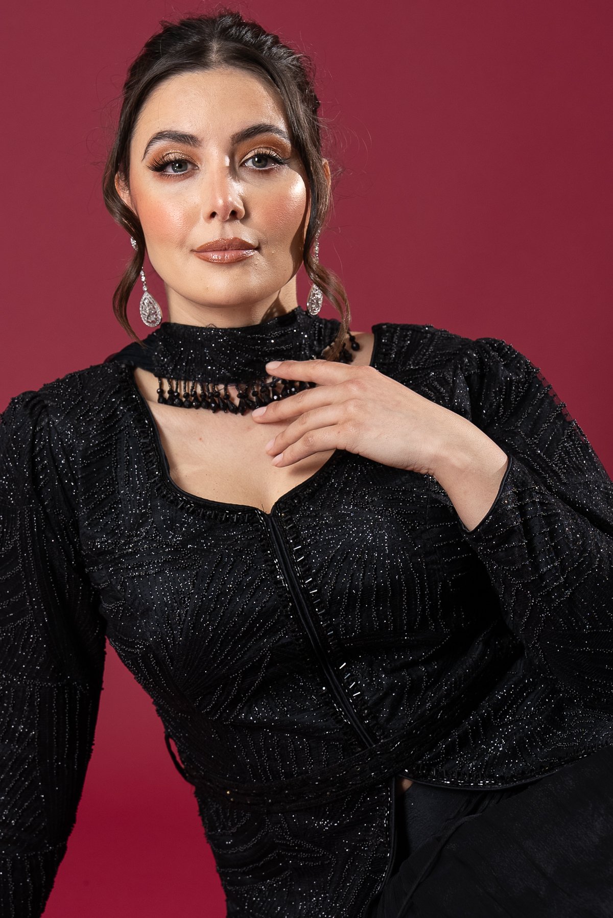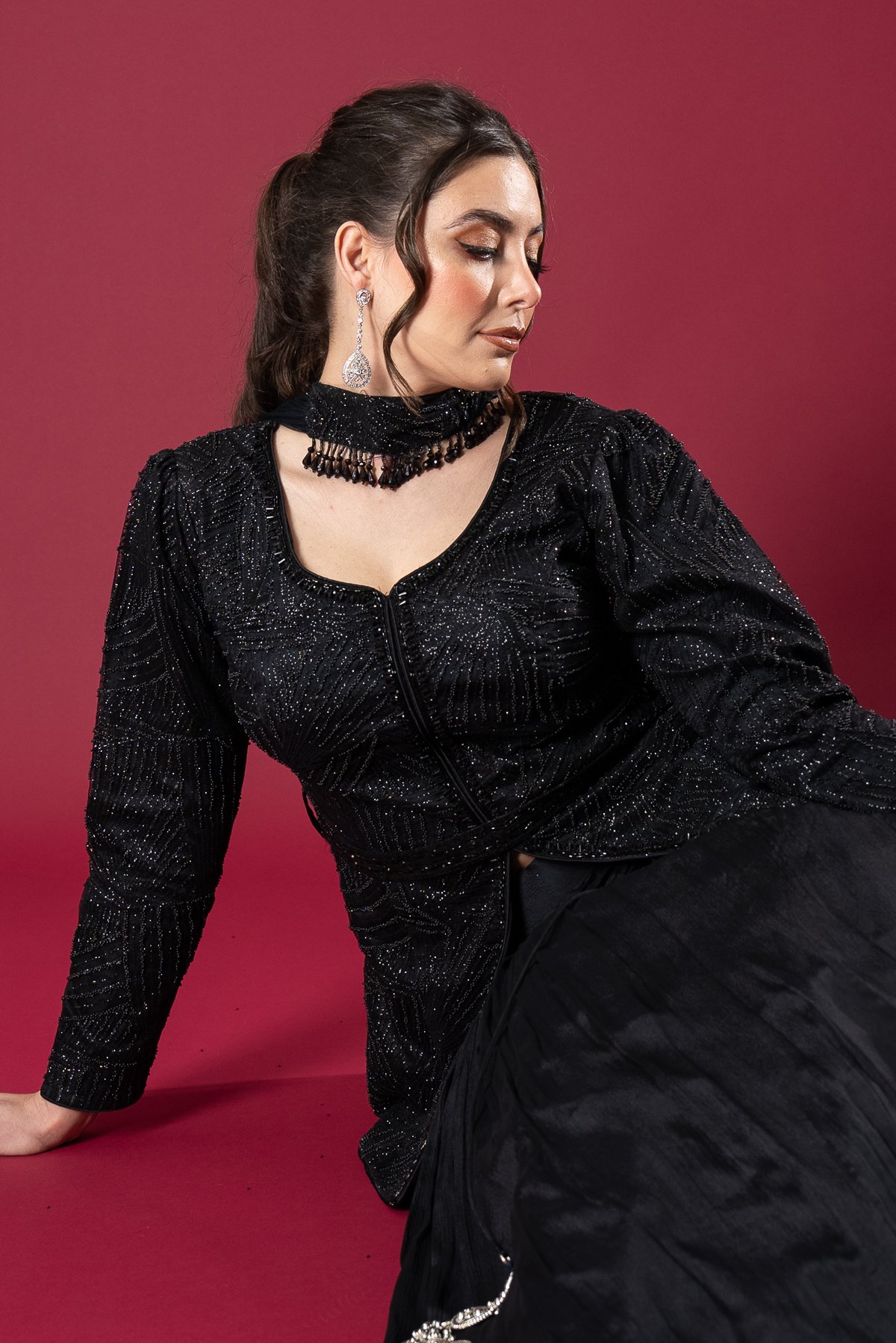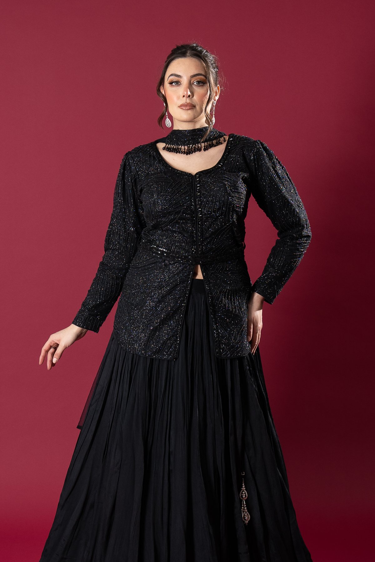 This beautiful 3 piece lengha choli features a straight jacket style shimmery shirt with thread work and sequence embroidery throughout along with a slit through the middle, finished with full length embroidered sleeves. It comes with a chiffon pleated lengha and the look is finished with a chiffon dupatta with bead embellishments.