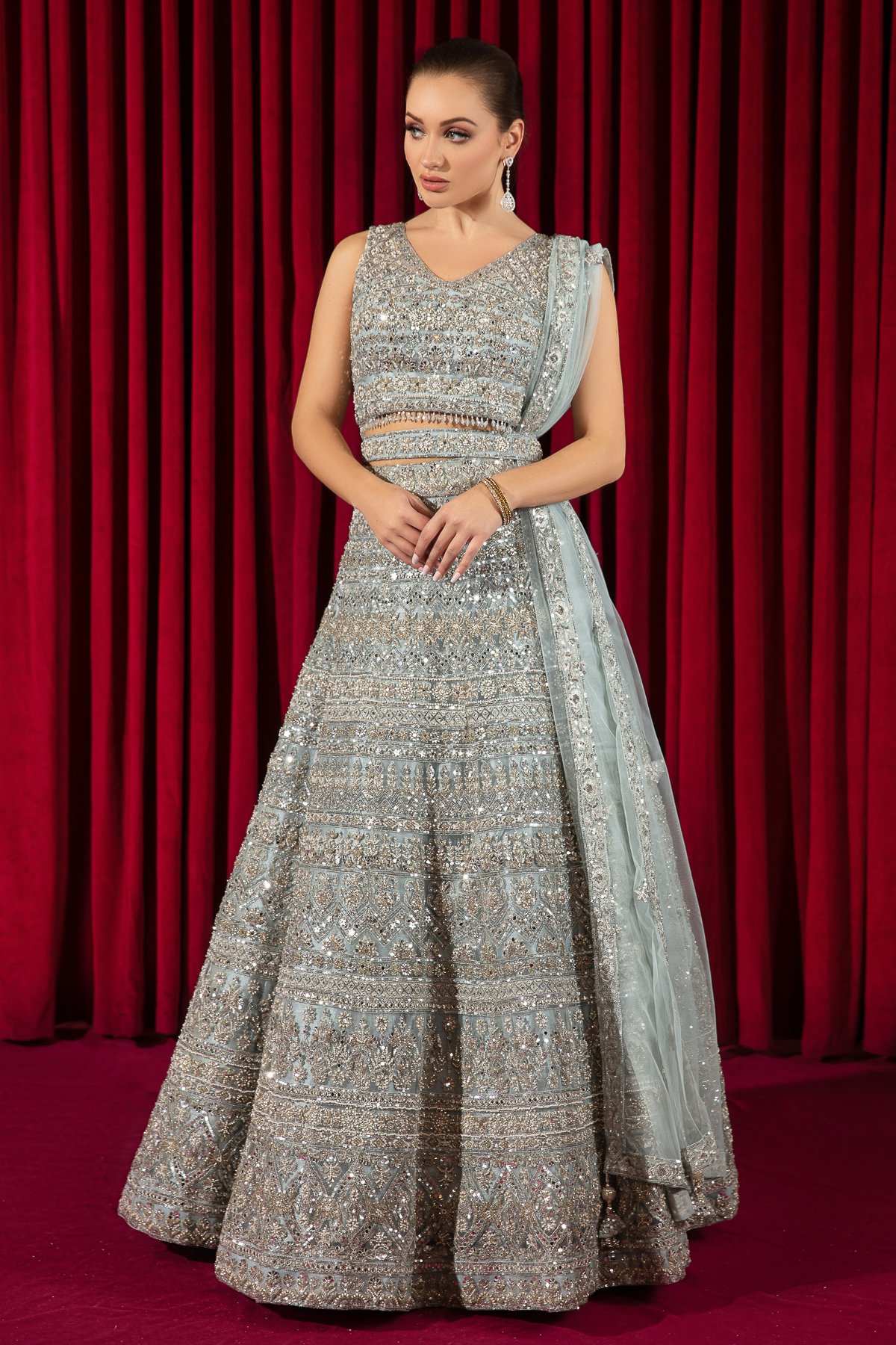 This beautiful 3 piece lengha choli features thread-work embroidery throughout with beaded embellishments on the net overlay finished with dangling beads from the border. It has deep neck design on the back with dori embellishment. It comes with a luxury heavy embroidered lengha and the look is finished with a net dupatta.