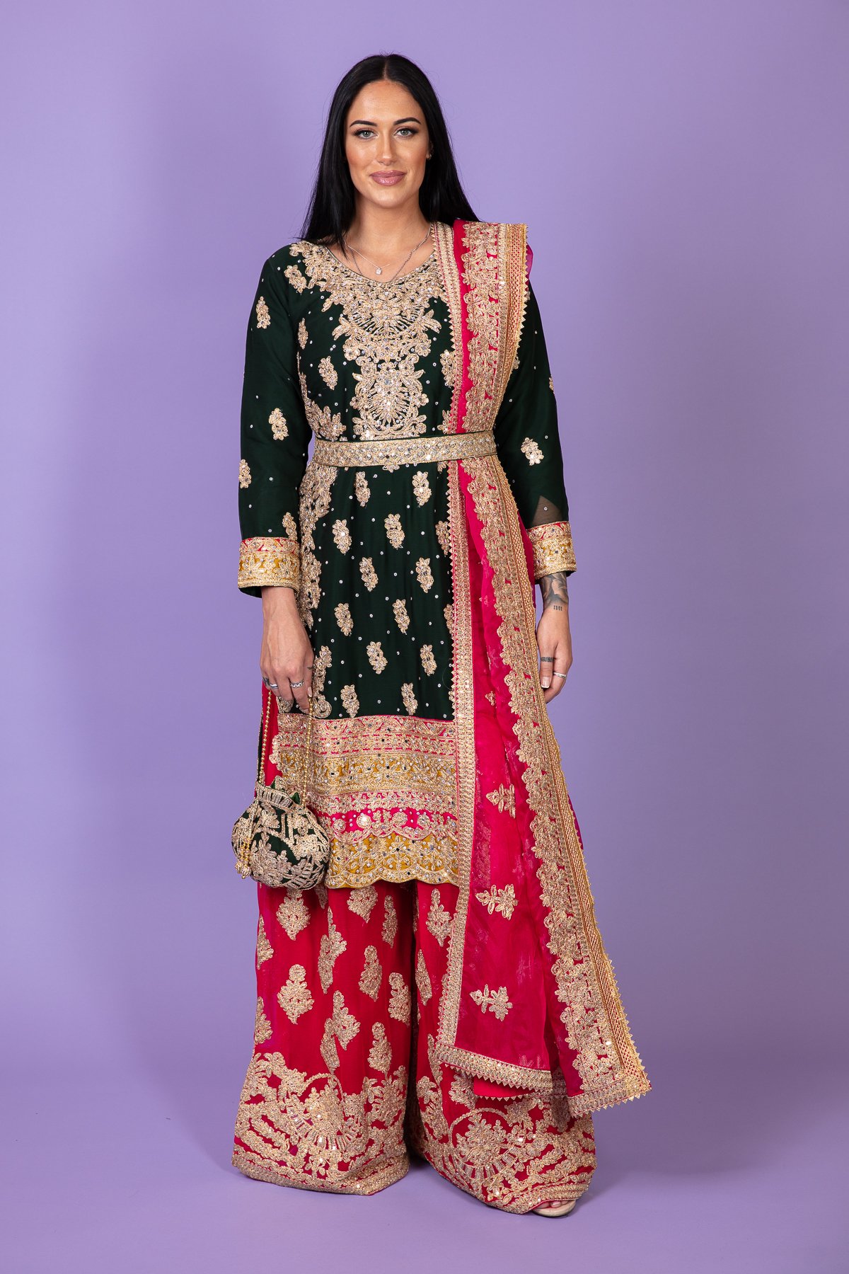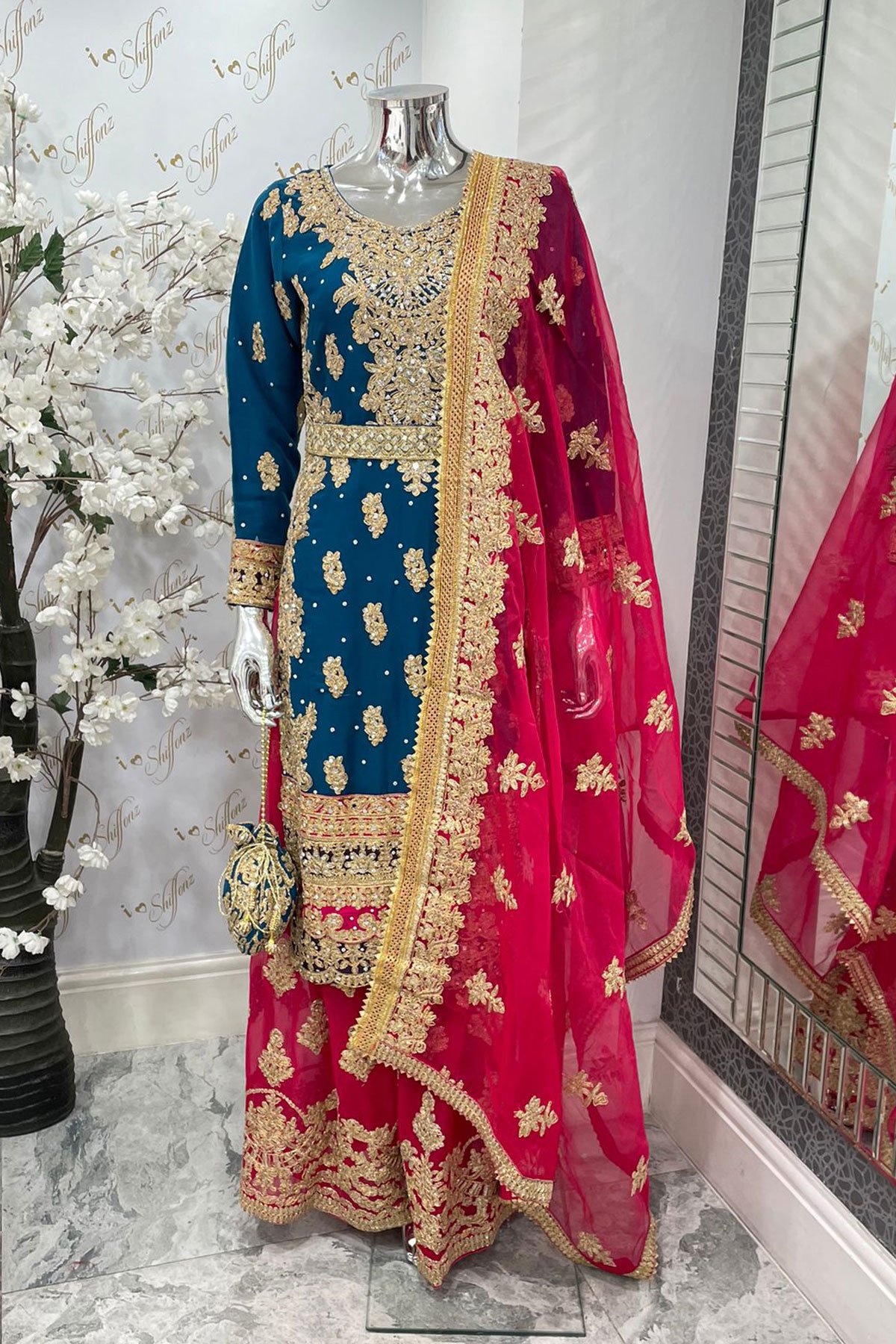 This beautiful 3 piece chiffon suit features a straight long length shirt with luxury dori work embroidery throughout with scattered diamanté’s, finished with a dori work pattern down the neckline. It comes with full length embroidered sleeves. The look is finished with a organza embroidered contrasted dupatta and sharara. As a pair, it comes with a same designed potli bag.