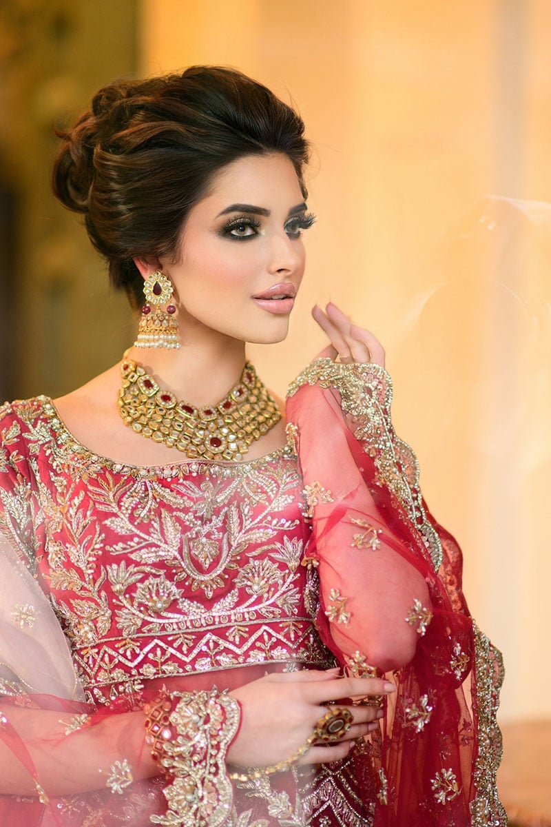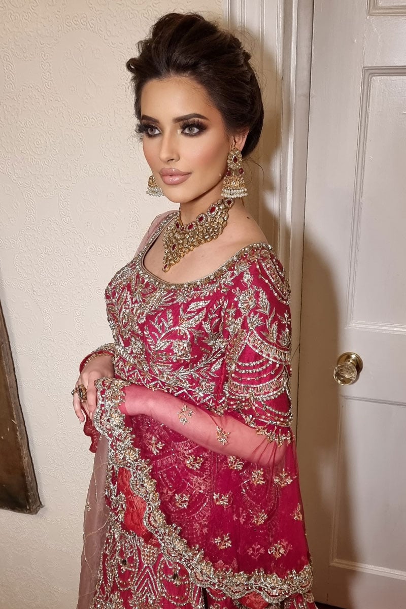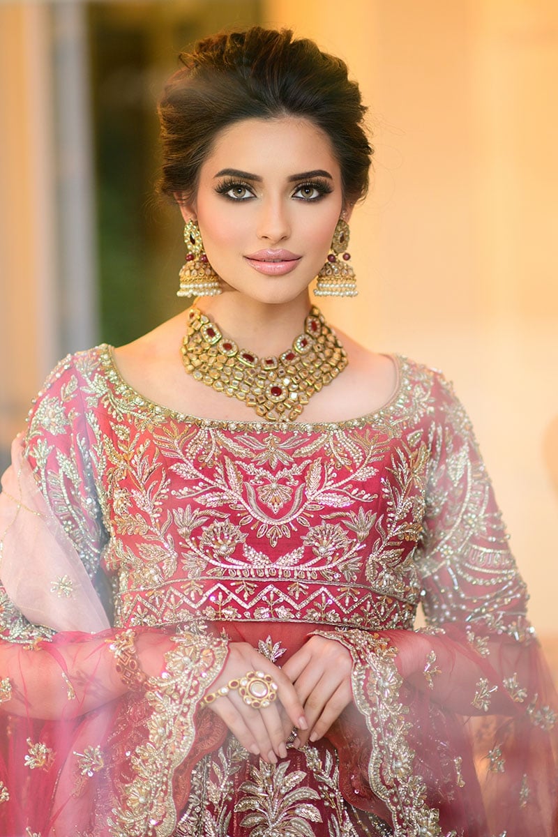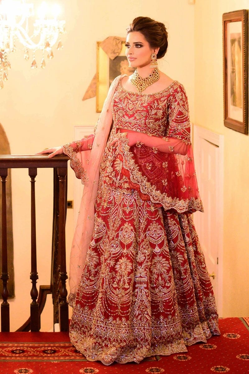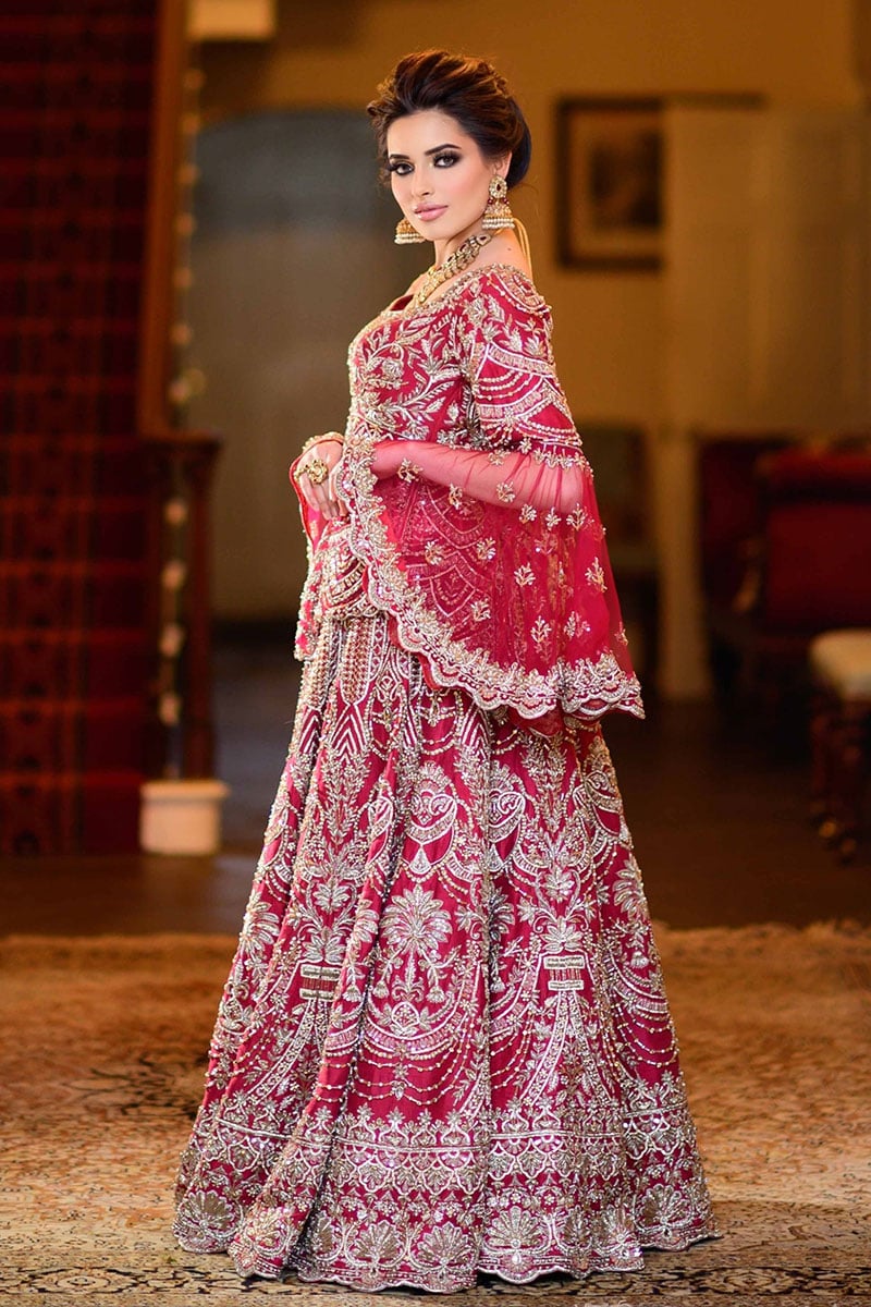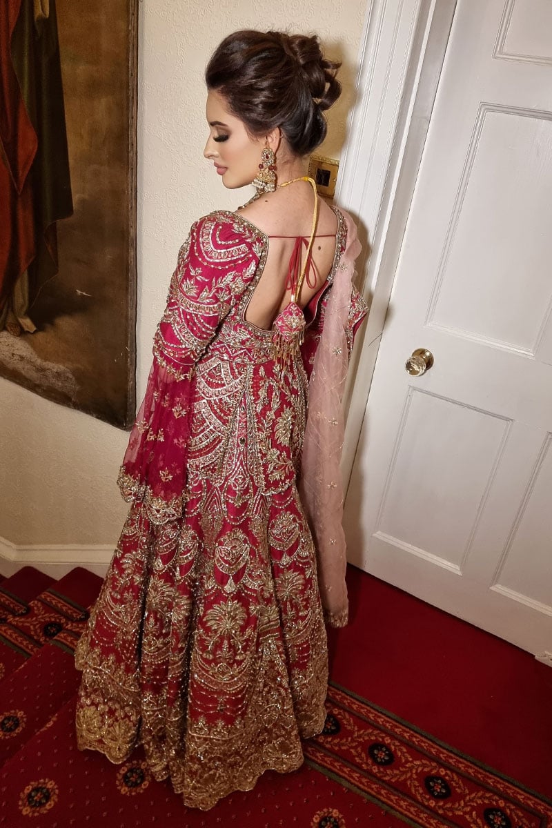 This beautiful 3 piece bridal lengha choli features a short top with luxury gold and silver embroidery throughout the front and back with beads and diamantes embellishments. It comes with full wide bell style embroidered sleeves. It comes with a heavy raw silk embroidered lengha and the look is finished with a contrasted light pink organza dupatta. Perfect for Nikkah, Baarat or Walima ceremonies.
