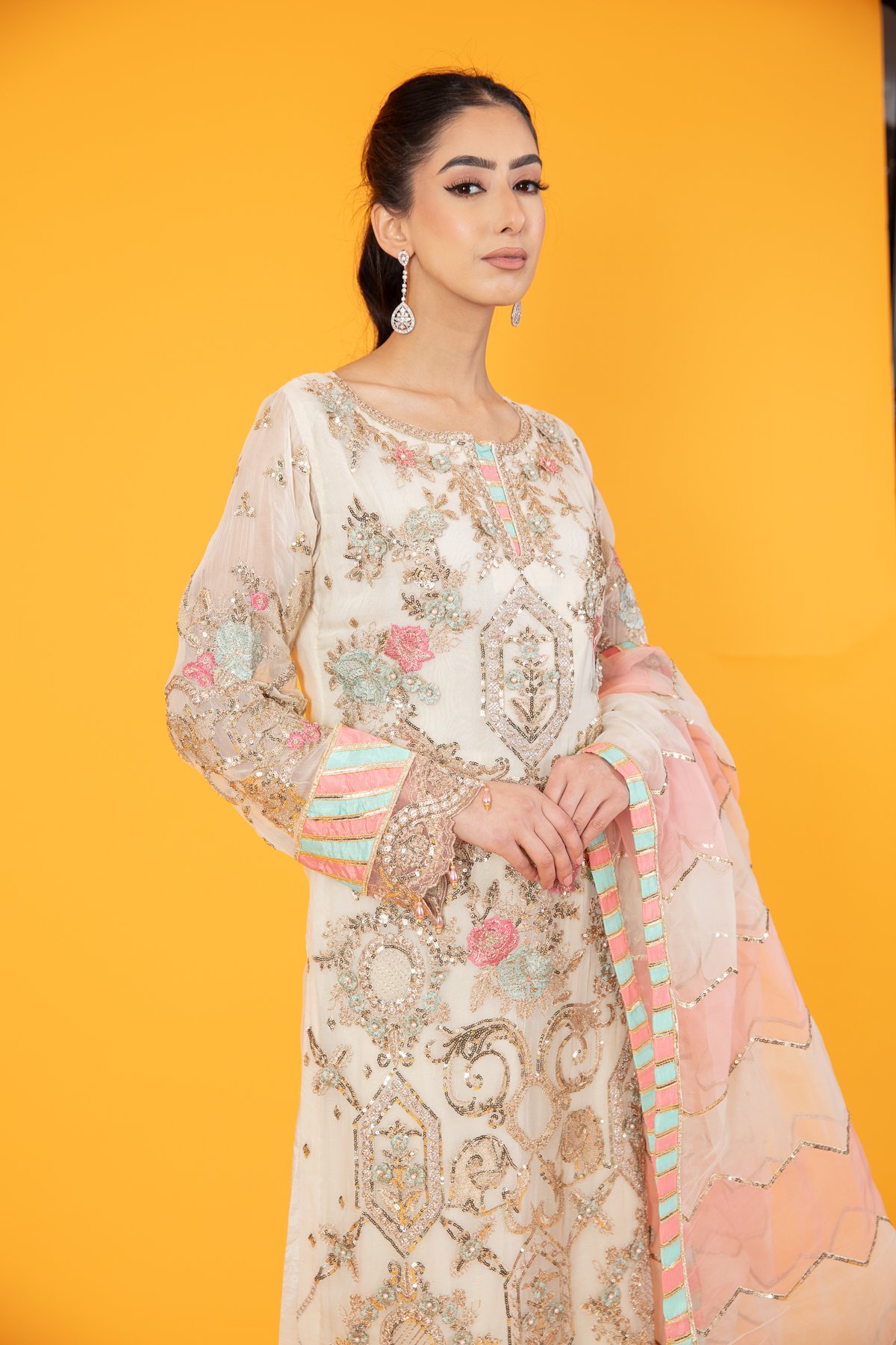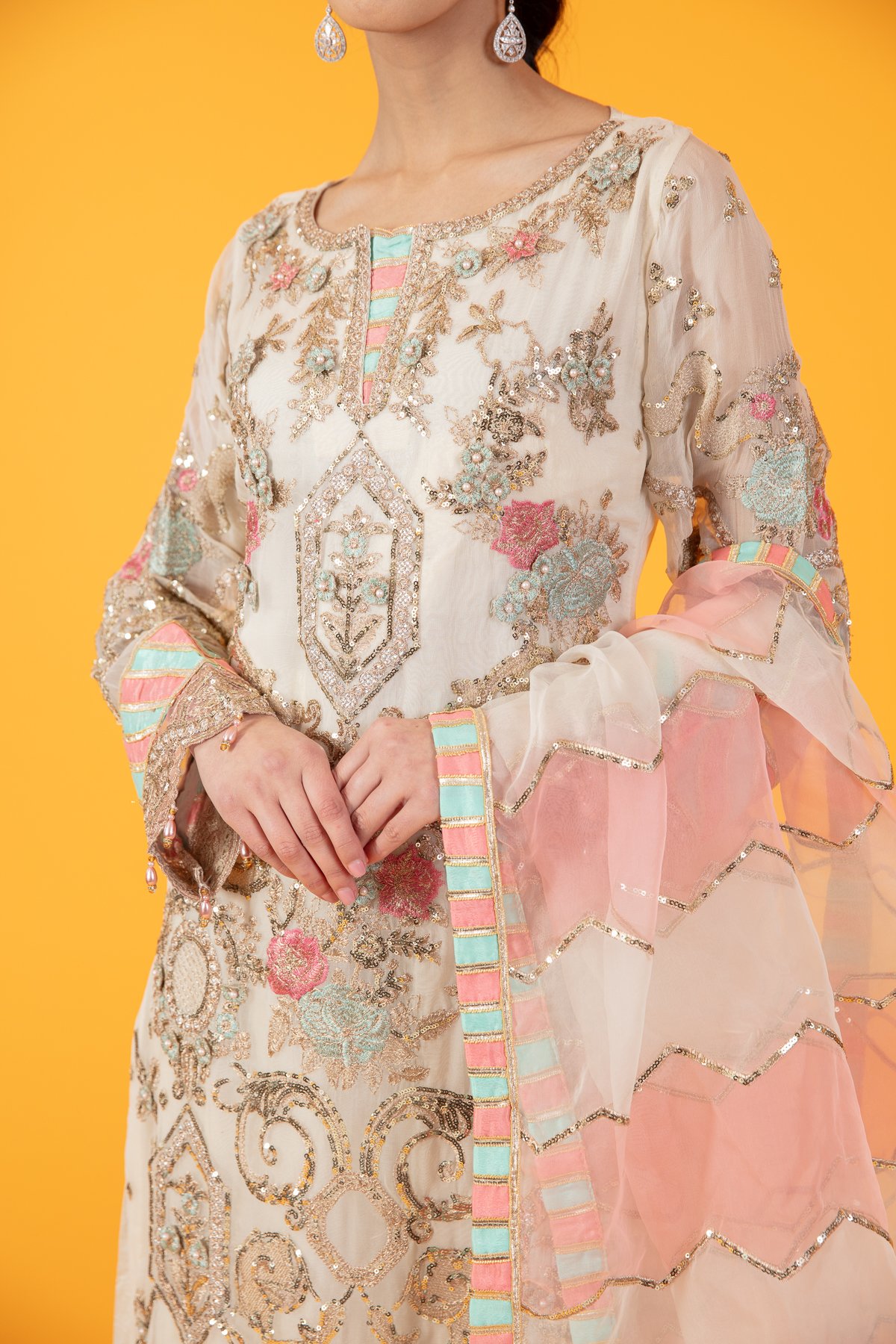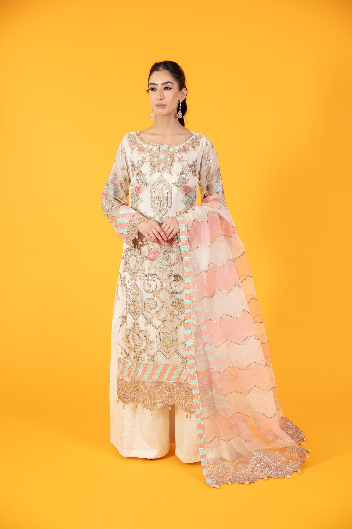 An elegant, straight chiffon shirt features threadwork embroidery throughout the front with delicate embroidery on top of the full length sleeves. Including a organza dupatta and raw silk plazo.