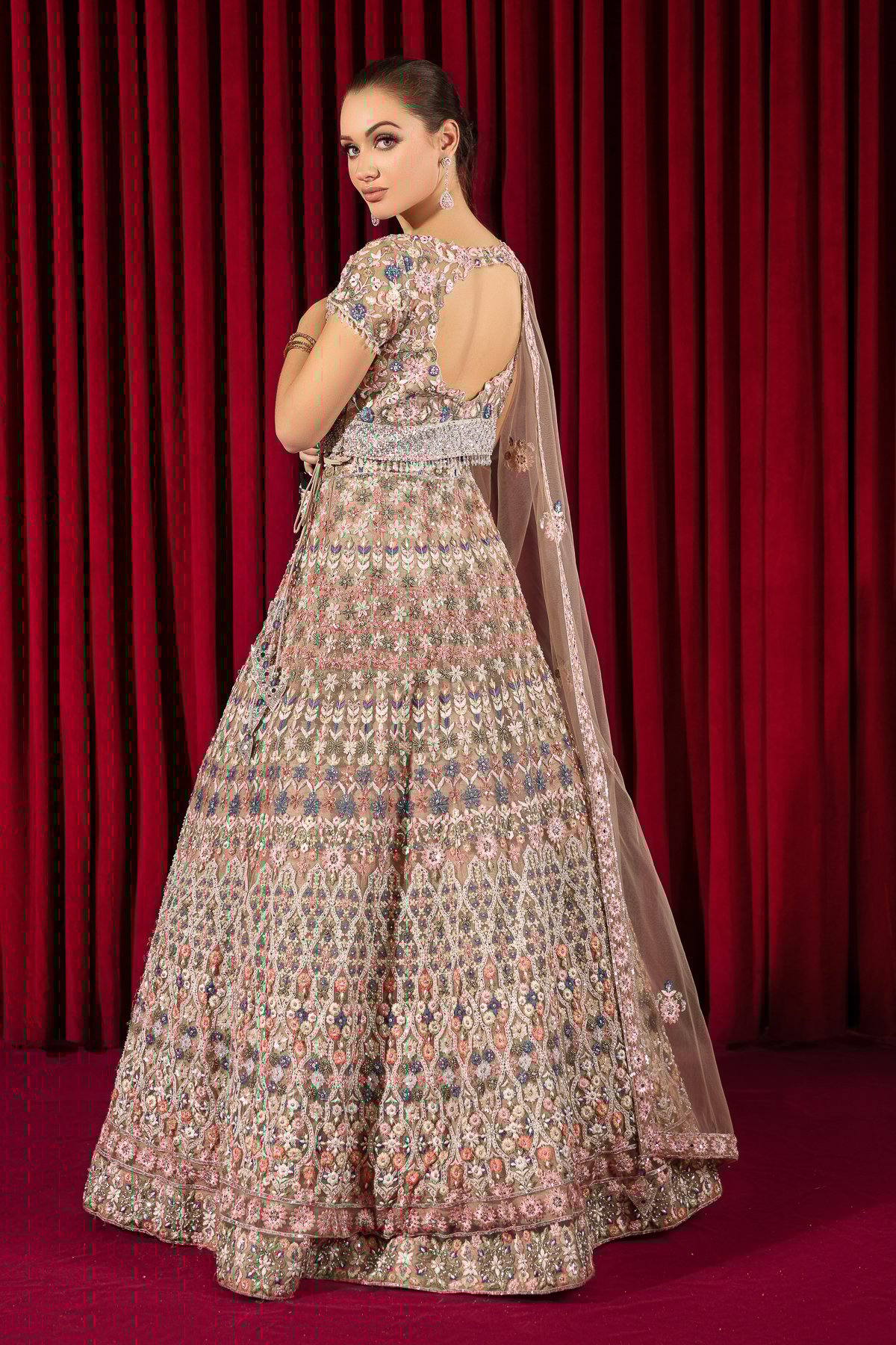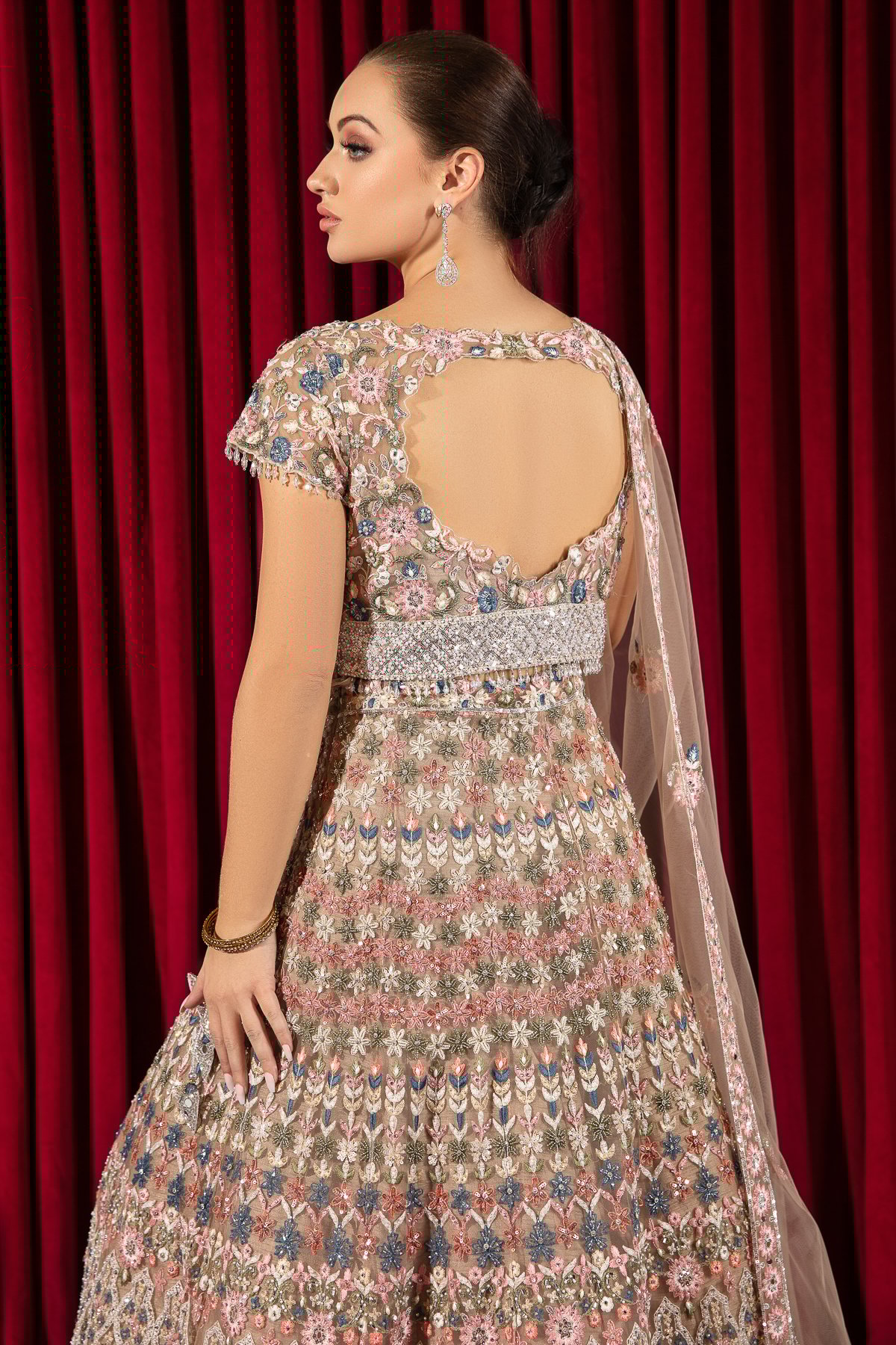 This beautiful 3 piece lengha choli features a short raw silk top with luxury embroidered patterns with silver scattered diamanté’s, finished with dangling tassels from the waist with a deep neckline on the back. It comes with short length sleeves with dangling tassels from the border and a luxury embroidered raw silk lengha and the look is finished with a net dupatta.