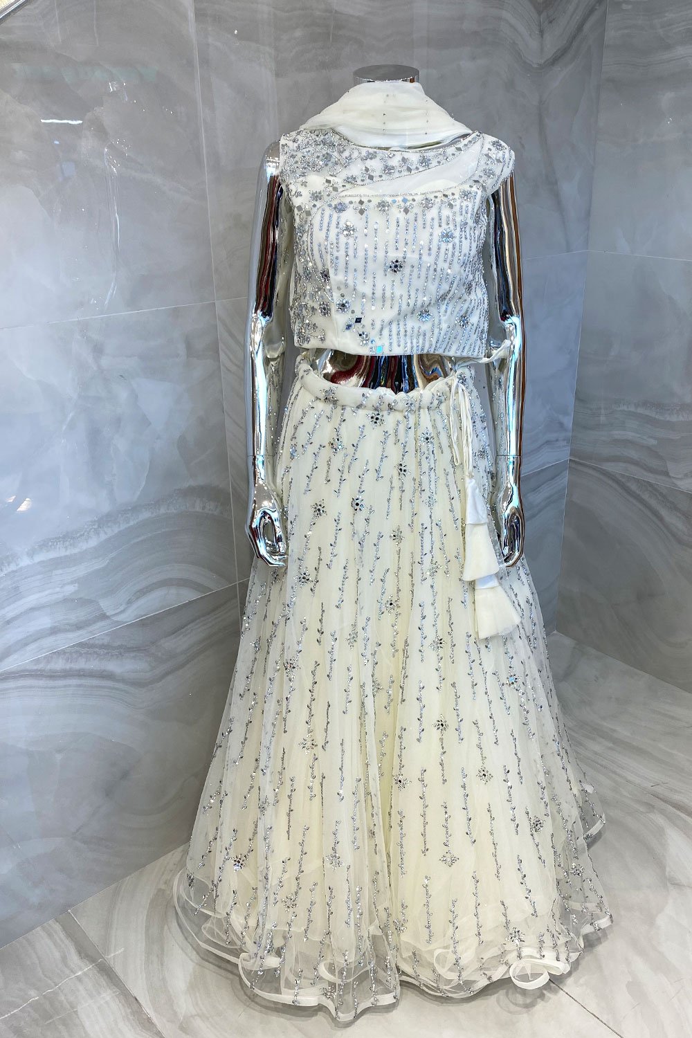 This beautiful 3 piece chiffon lengha choli features a short top with luxury mirror embellishments throughout the front and back. It comes with luxury sequence and mirror embroidered lengha and the look is finished with a chiffon dupatta.