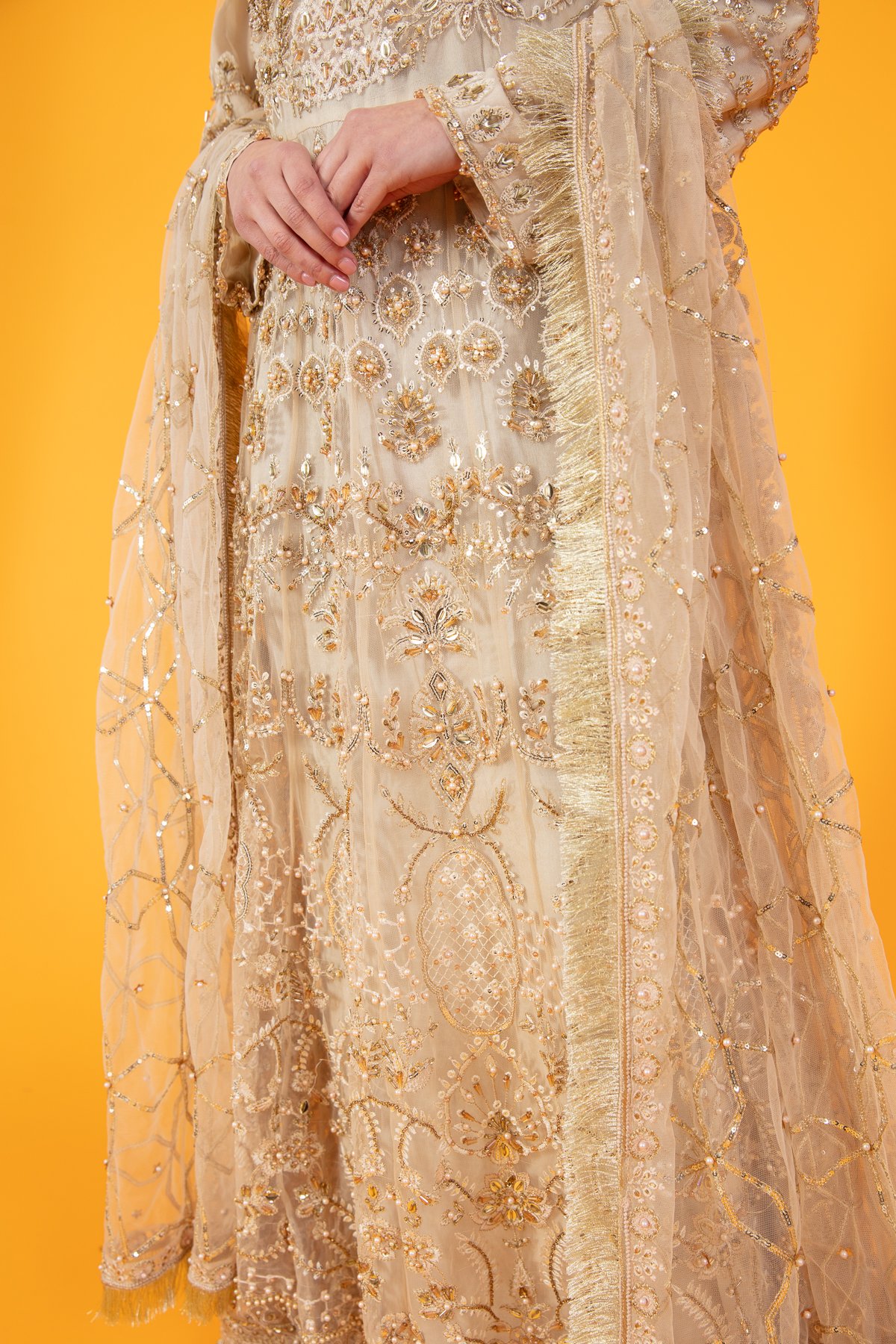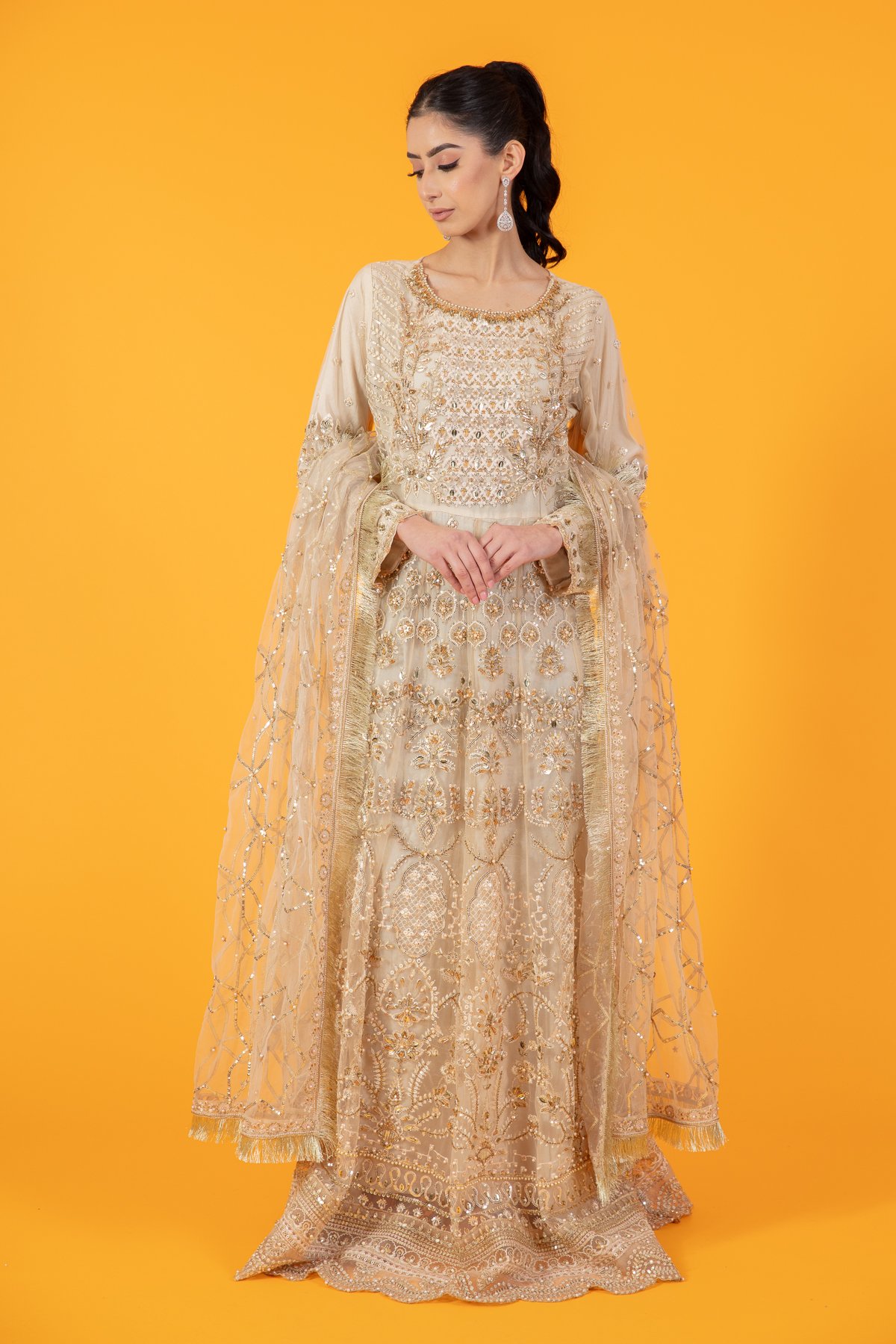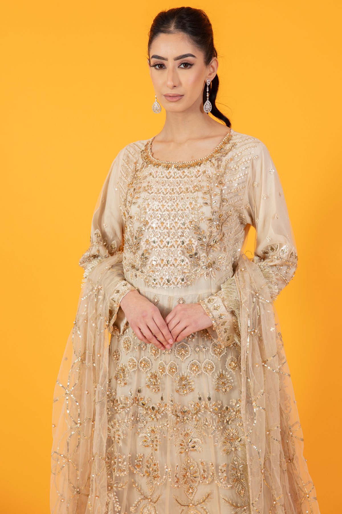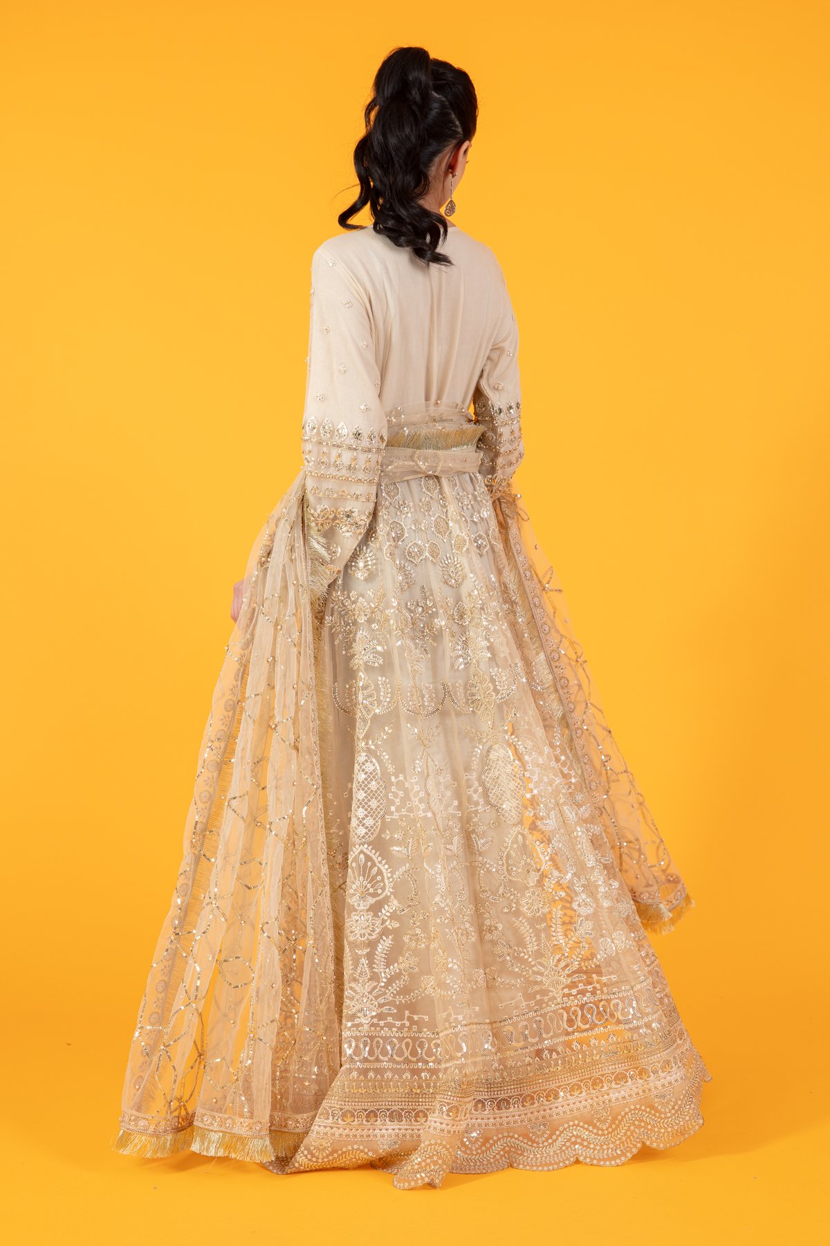 This beautiful 3 piece net dress features a luxury beaded and thread-work embroidery throughout the front. It comes with full length embroidered sleeves finished with beaded tassels down the cuffs. It comes with straight leg crepe trousers and the look is finished with a net embroidered dupatta along with an embroidered belt.