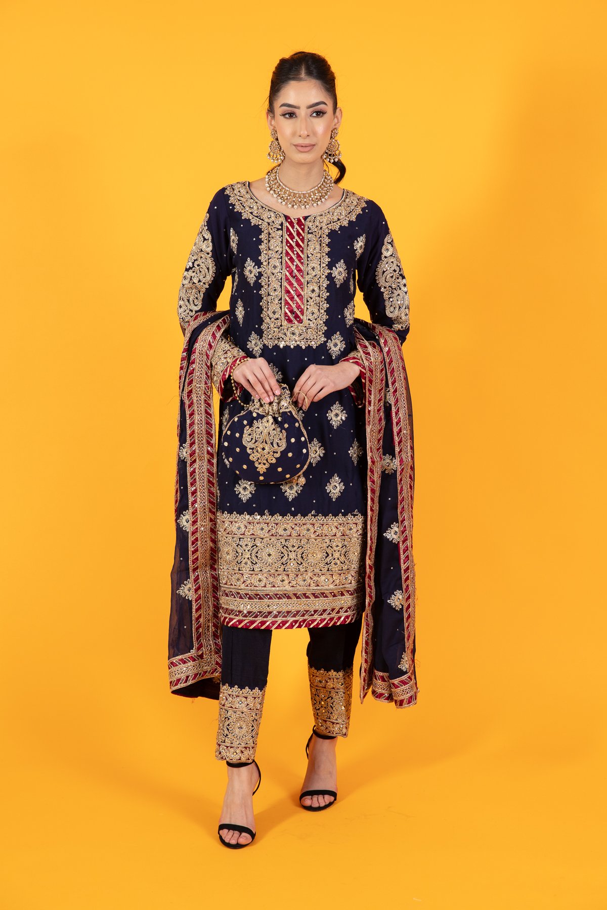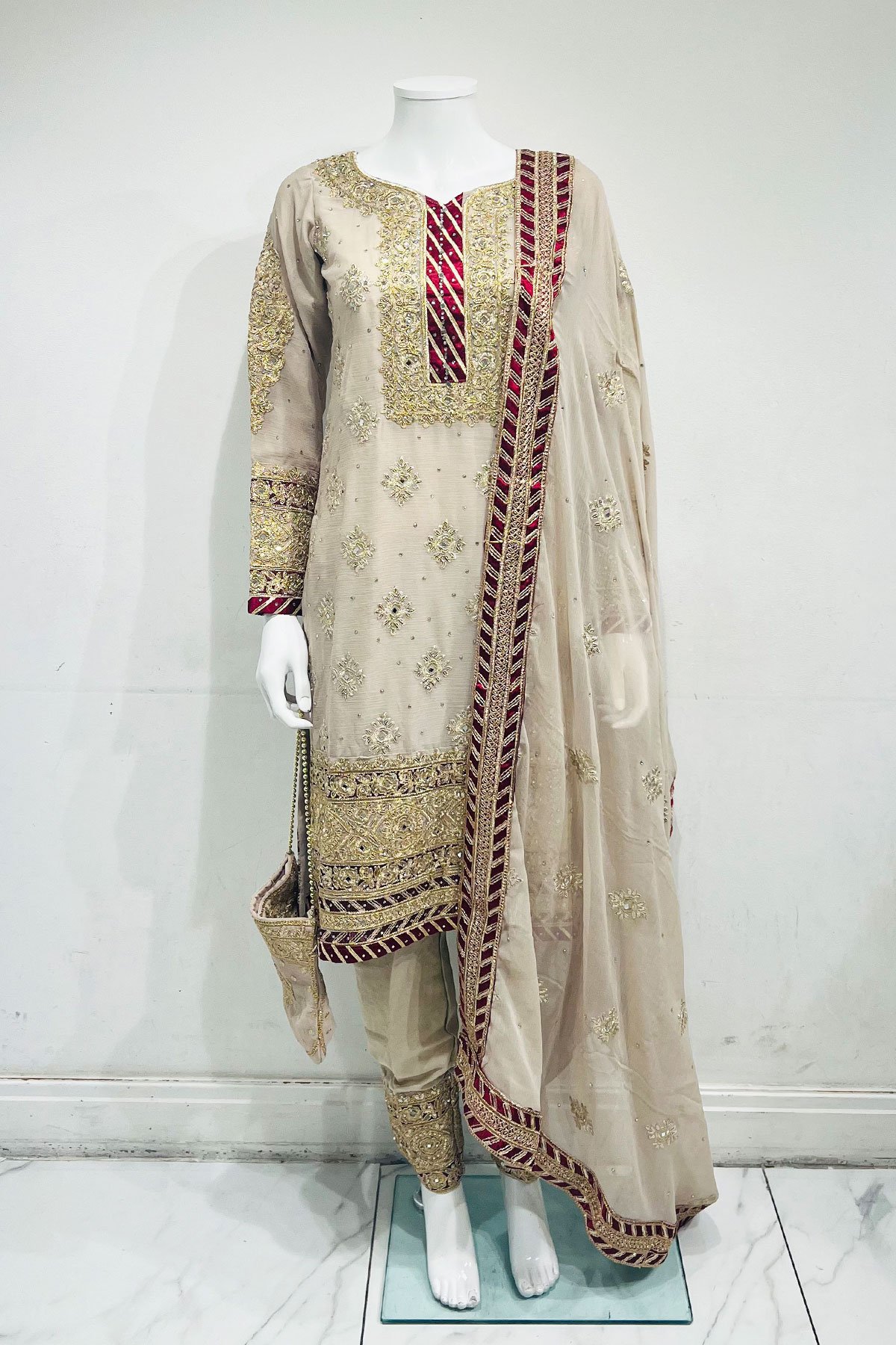 This beautiful 3 piece chiffon suit features a straight shirt with luxury thread work embroidery, finished with a delicate design down the neckline. It comes with full length sleeves and a raw silk straight leg trouser. The look is finished with an chiffon thread-work dupatta with a lace on the border. Potli purse is also included as well as an embroidered belt to enhance the look.