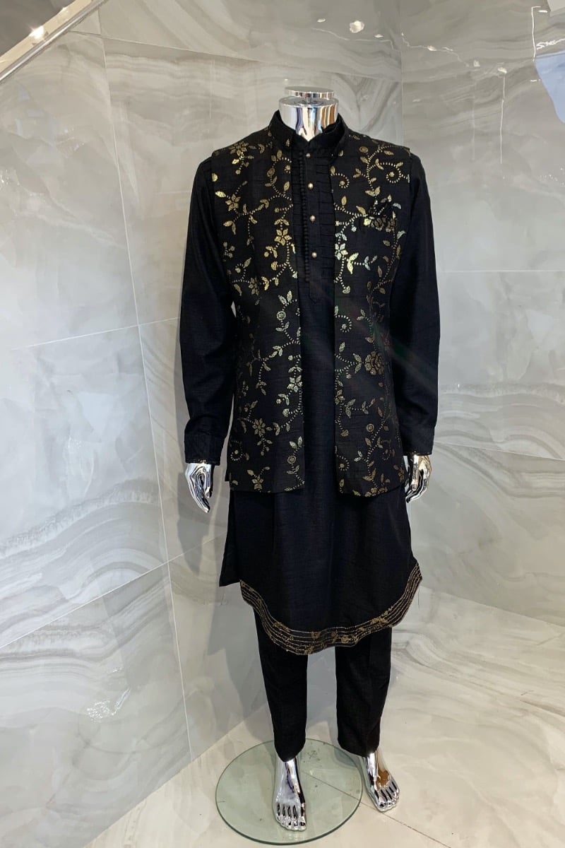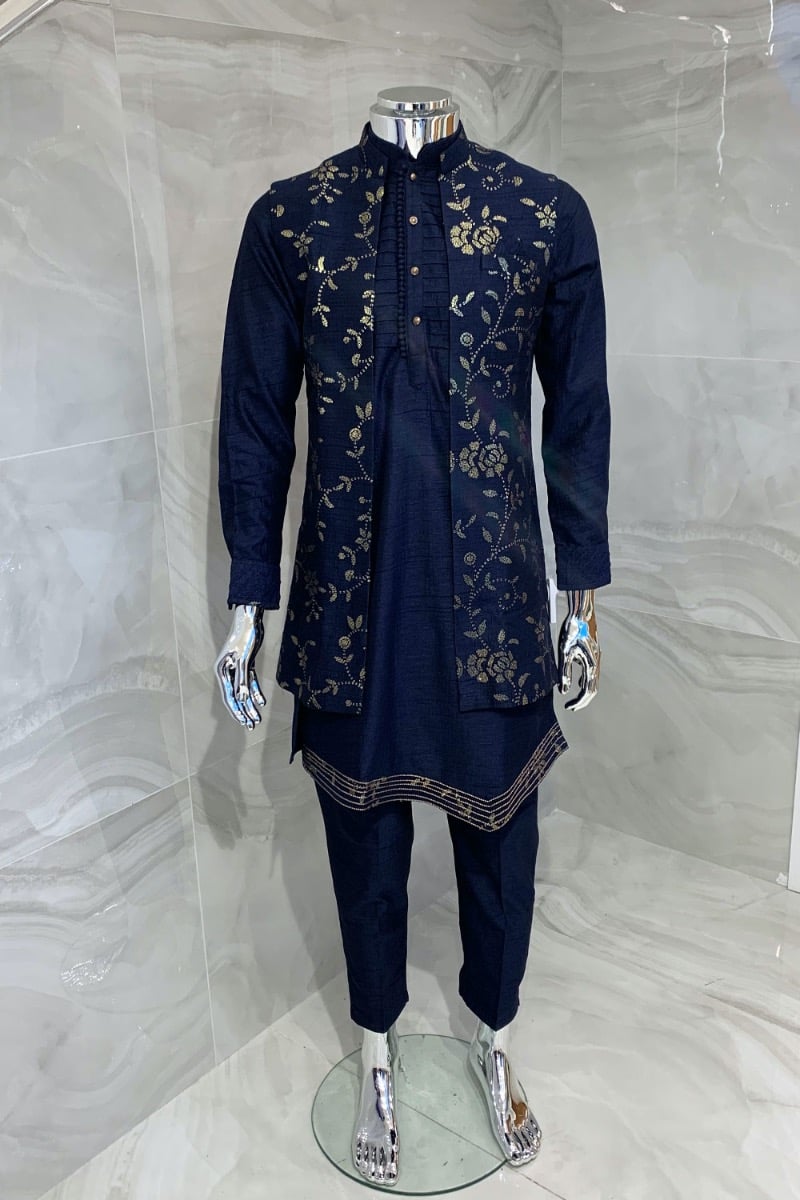 This beautiful men’s kurta features a straight under shirt on the raw silk overlay with button embellishments on the front, finished with an embroidered border. It comes with a brocade printed waistcoat style jacket and the look is finished with a raw silk trouser.