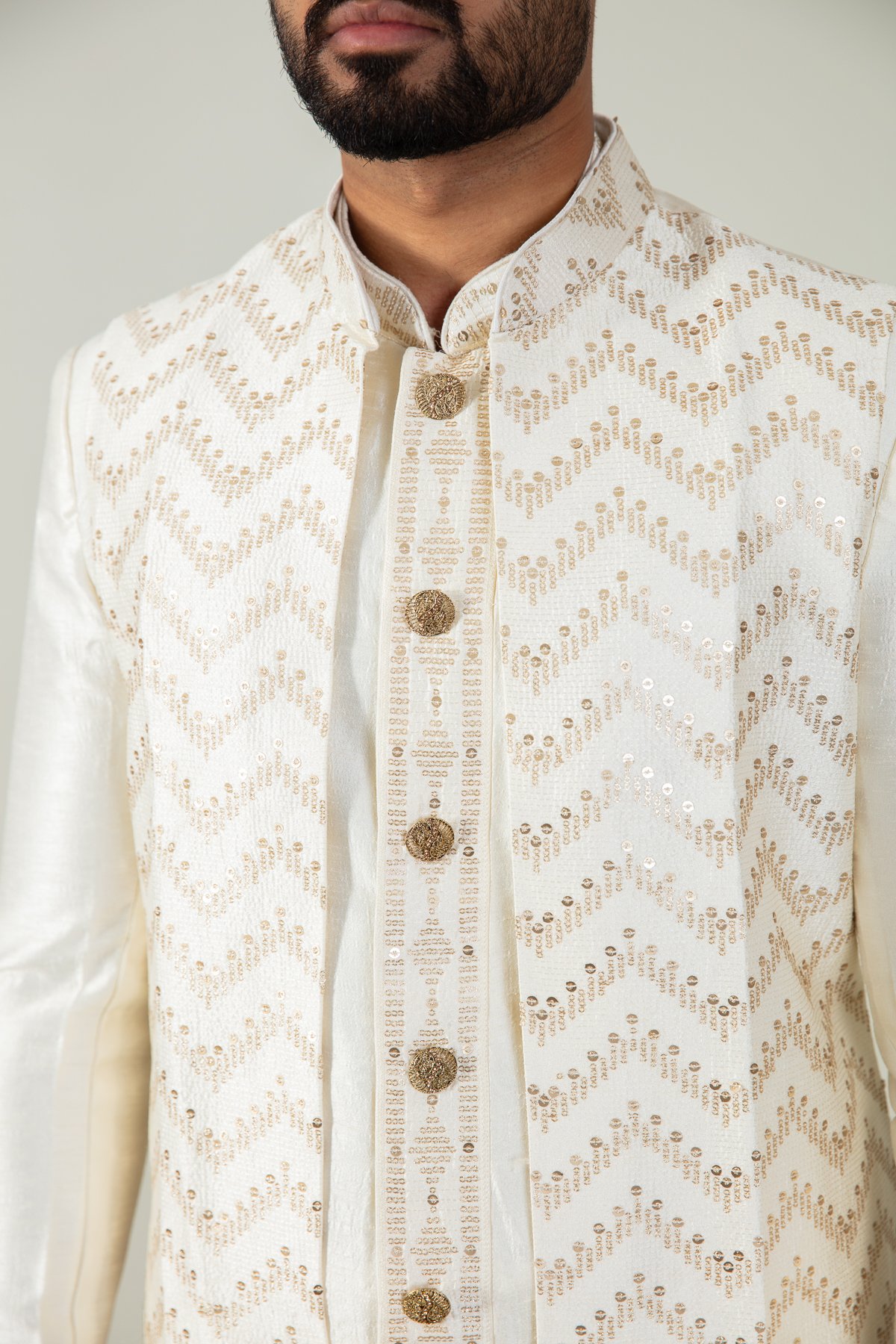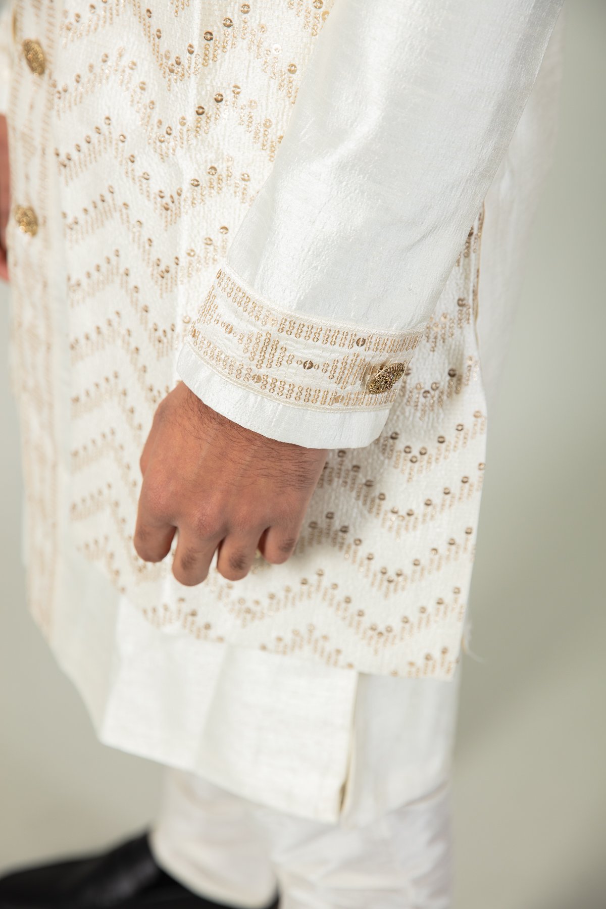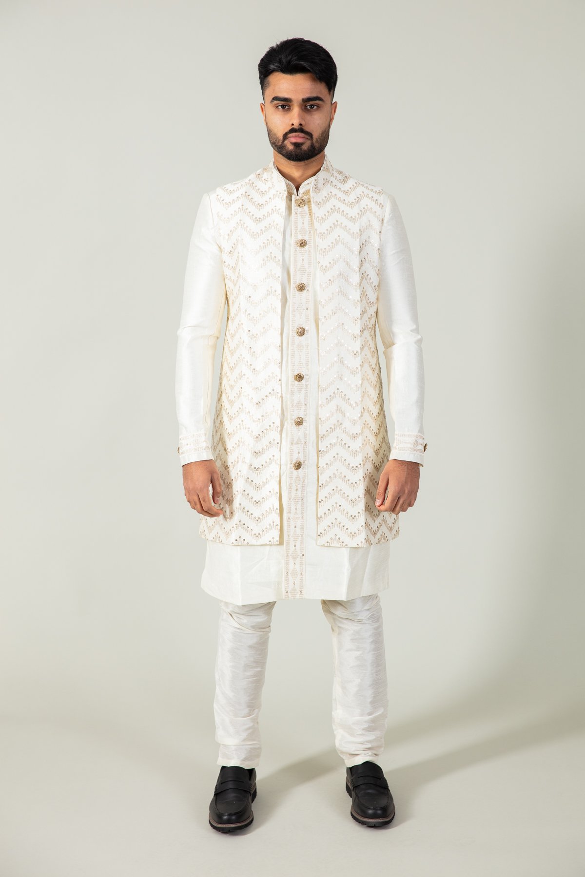 This beautiful 3 Piece men’s suit featuring a jacket with sequins embroidered all around, that sits on top of an kameez lined with golden embroidery and buttoned all the way up to the collar and just below the knees. The cuffs of the sleeves are also finished off with the same pattern. It is finished with a plain dupion churidar.