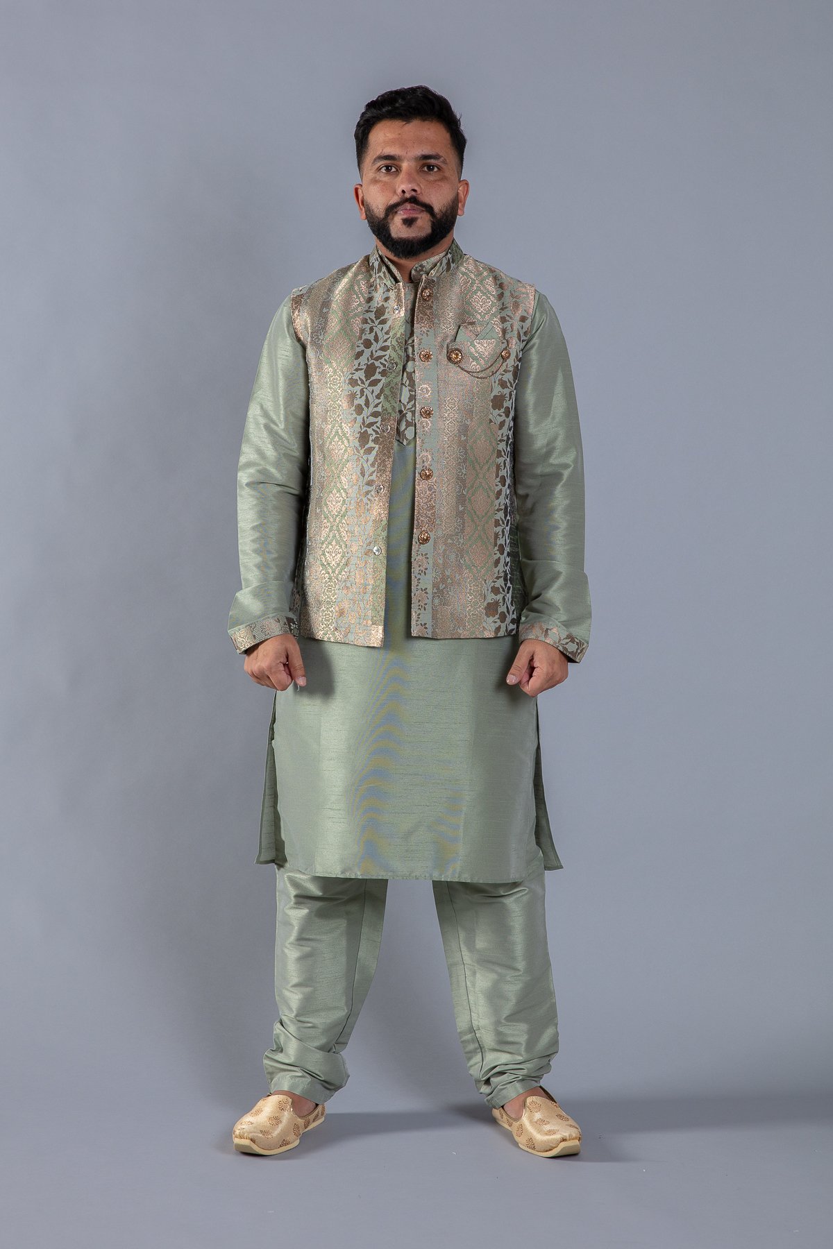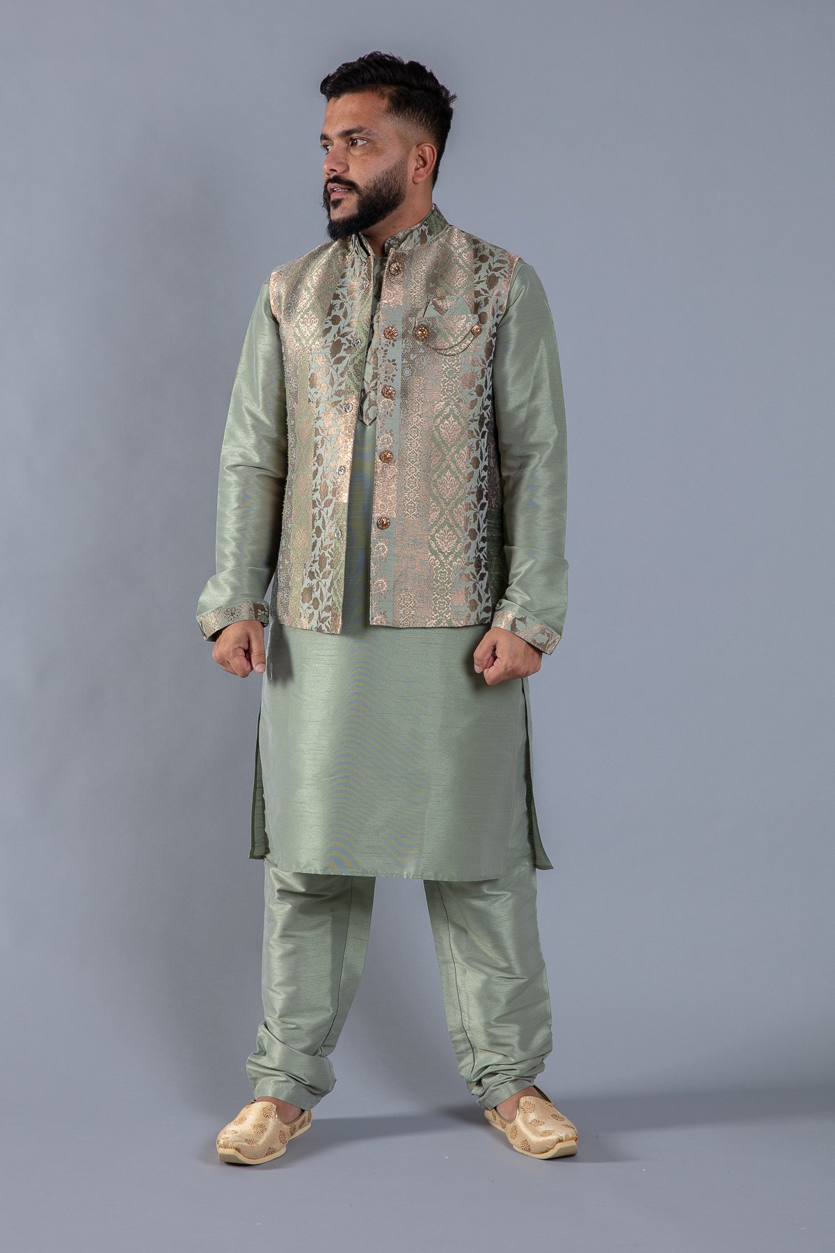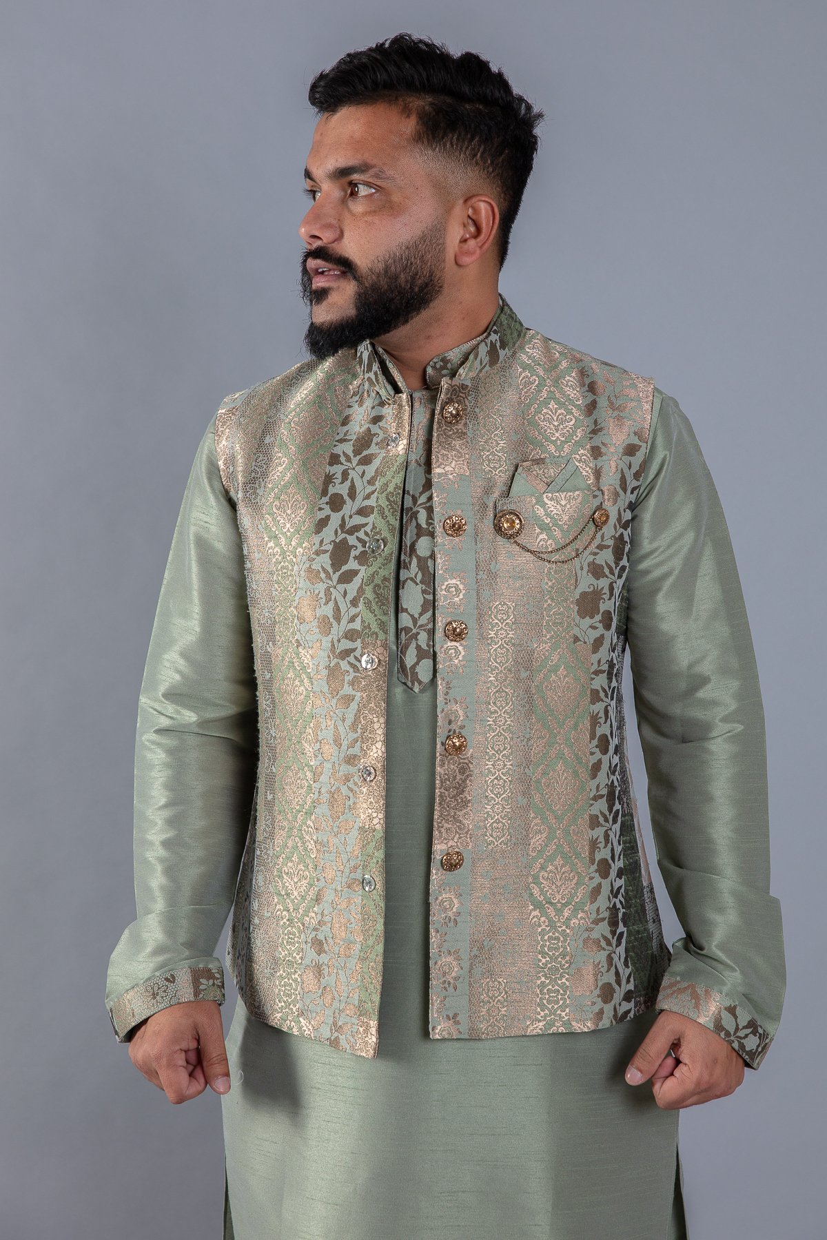 This beautiful 3 piece mens suit features a straight raw silk plain shirt with straight leg raw silk trousers. It comes with a luxury brocade printed waistcoat with button embellishments along the middle.