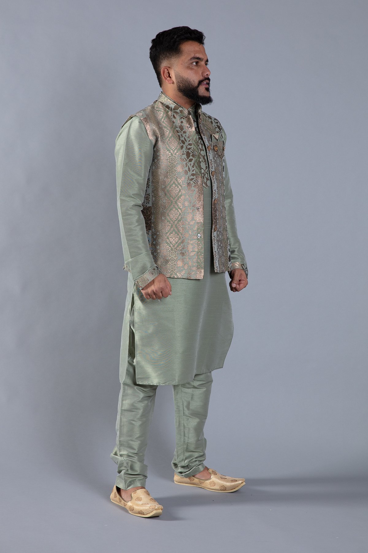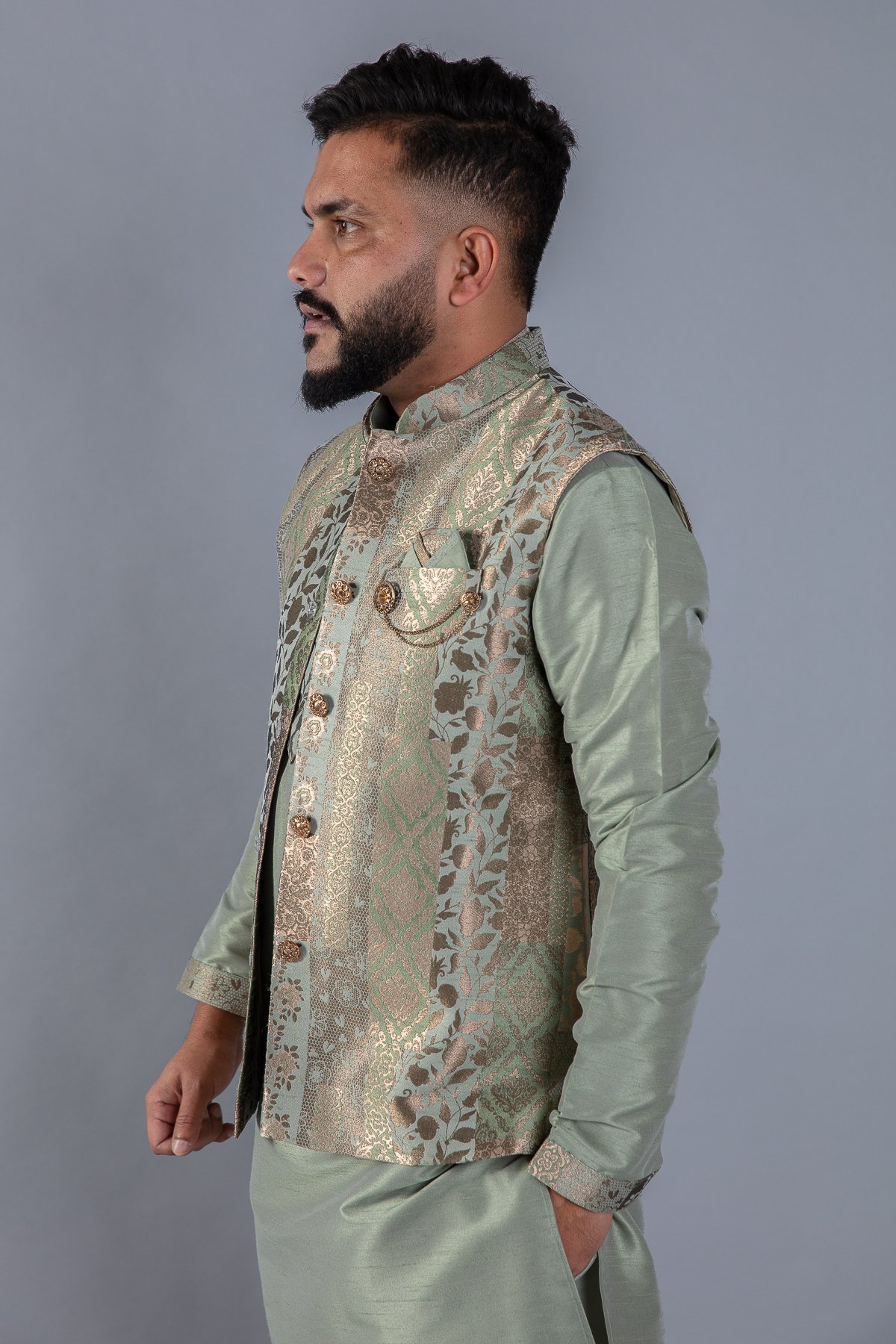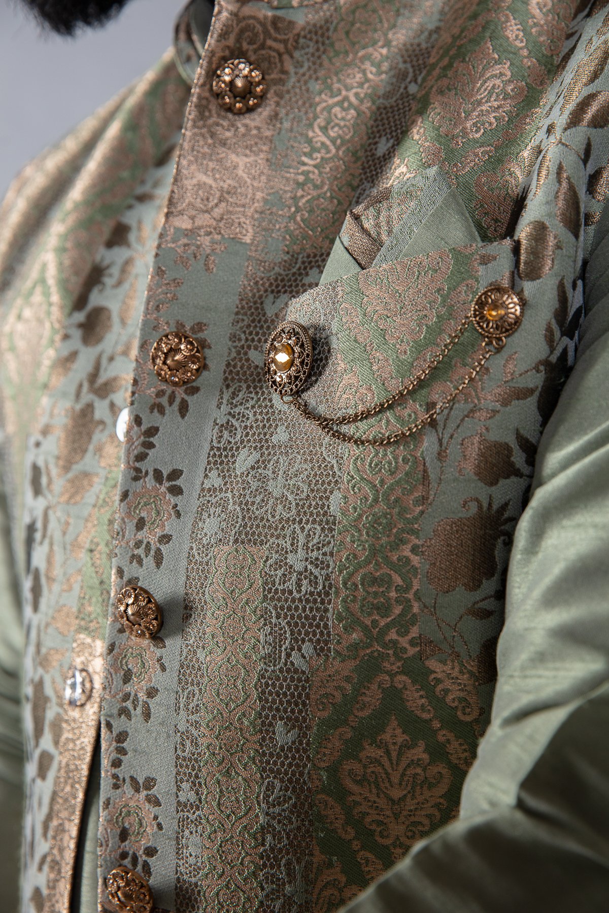 This beautiful 3 piece mens suit features a straight raw silk plain shirt with straight leg raw silk trousers. It comes with a luxury brocade printed waistcoat with button embellishments along the middle.