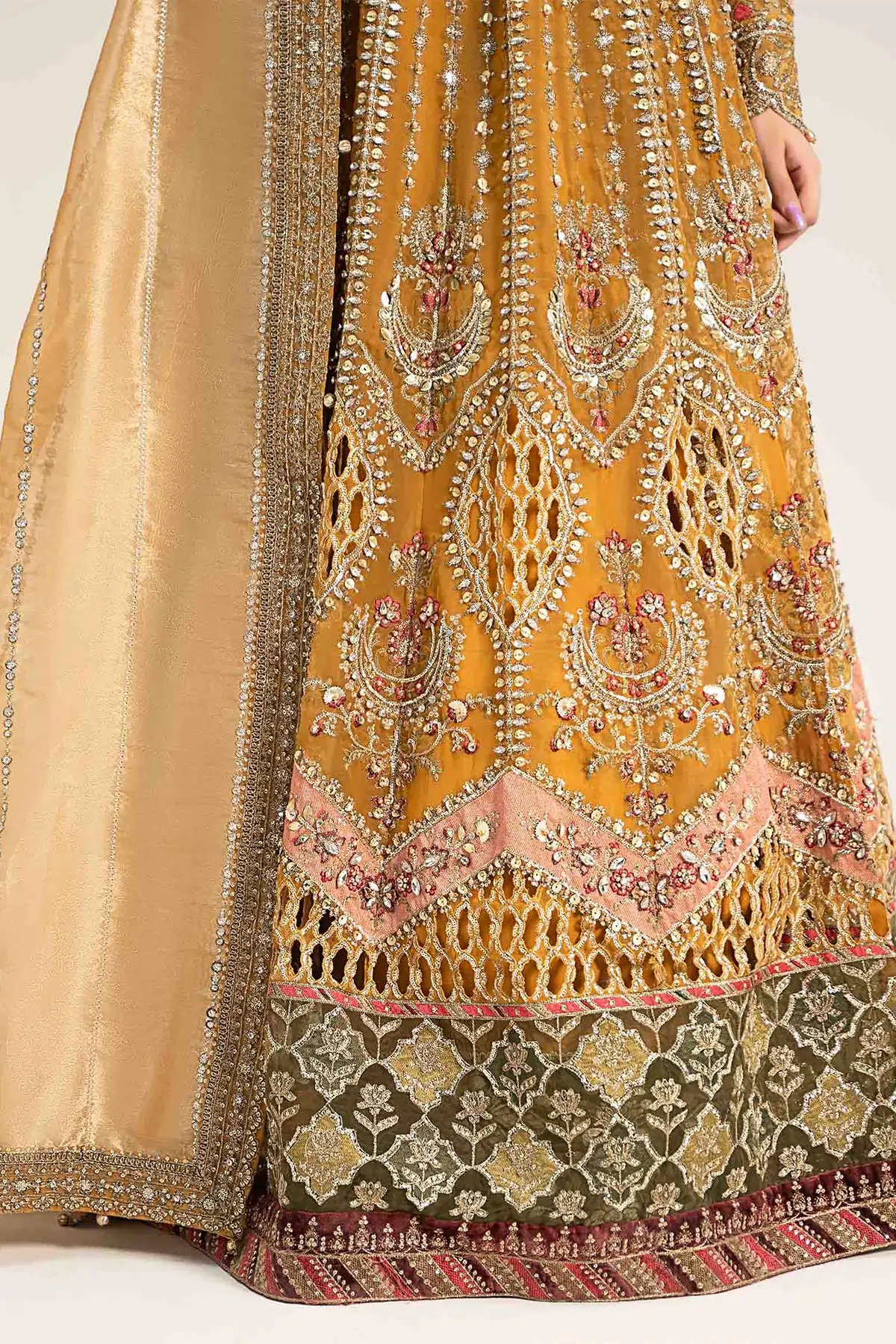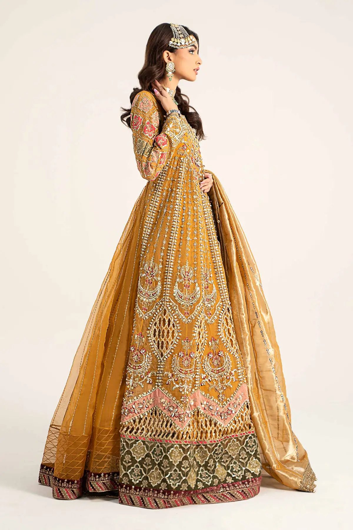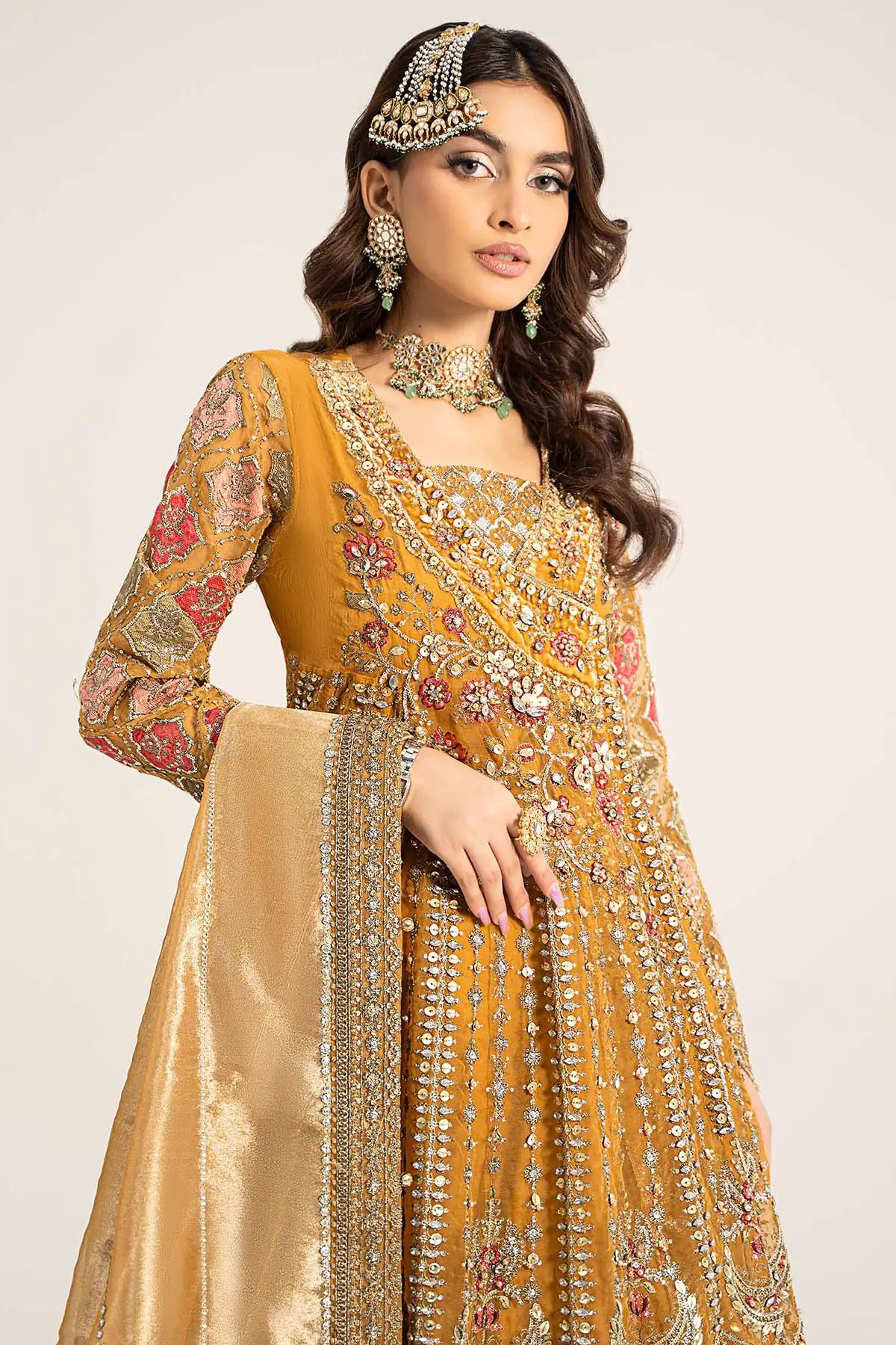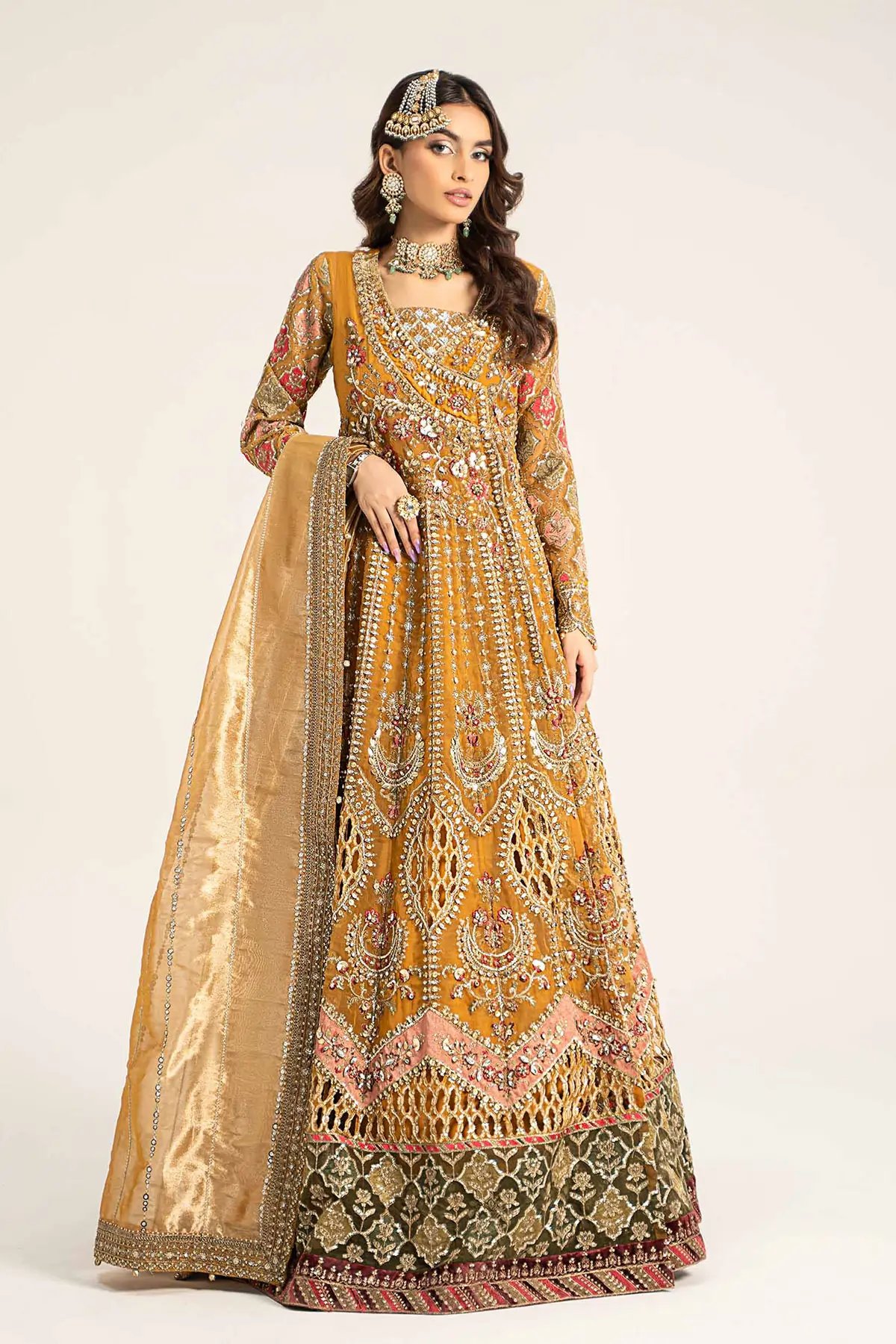 This beautiful 3 piece Maria b inspired gown features an Angrakha style dress with luxury  thread work embroidery along with heavy motifs and bead work, finished with full length embroidered sleeves. Paired with a flared plazo trousers with a banarsi contrasted border in green. The look is finished with an embroidered net dupatta. Perfect attire for a mehndi for this wedding festive. Note: Above catalogue pictures are for design reference only. Embroidery and stitching may vary.