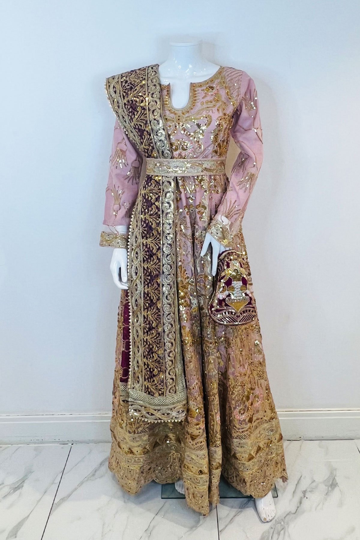 This beautifully embroidered gown features gold thread-work and sequence embroidery throughout the front and back with bead embellishments in between on the organza overlay. It comes with full-length embroidered sleeves with straight leg raw silk white trousers. The look is finished with a contrasted dupatta featuring gold sequence embroidery going throughout the four borders, along with a gold thread-work pattern throughout the middle, which makes this suit perfect for party wear.