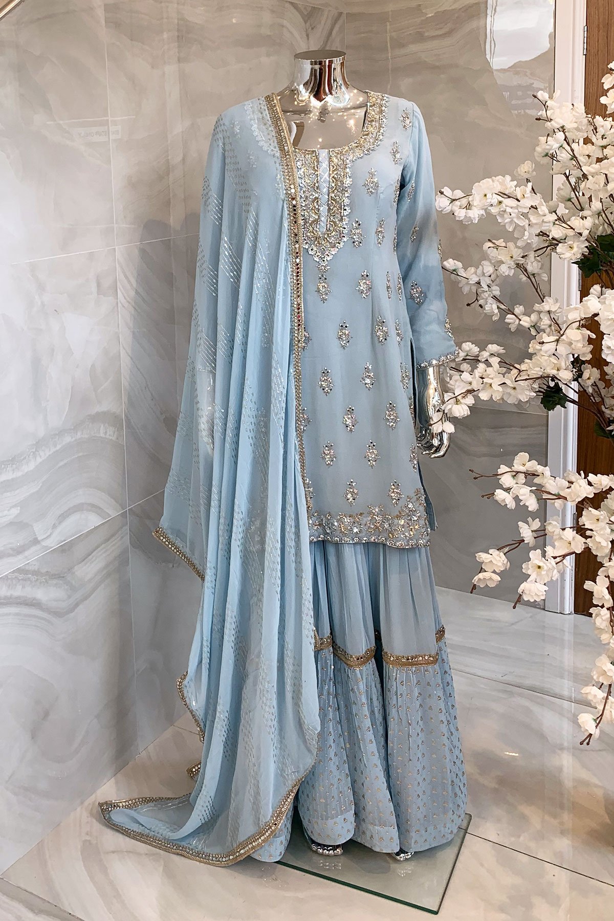 3 Piece zari work embroidered chiffon gharara suit