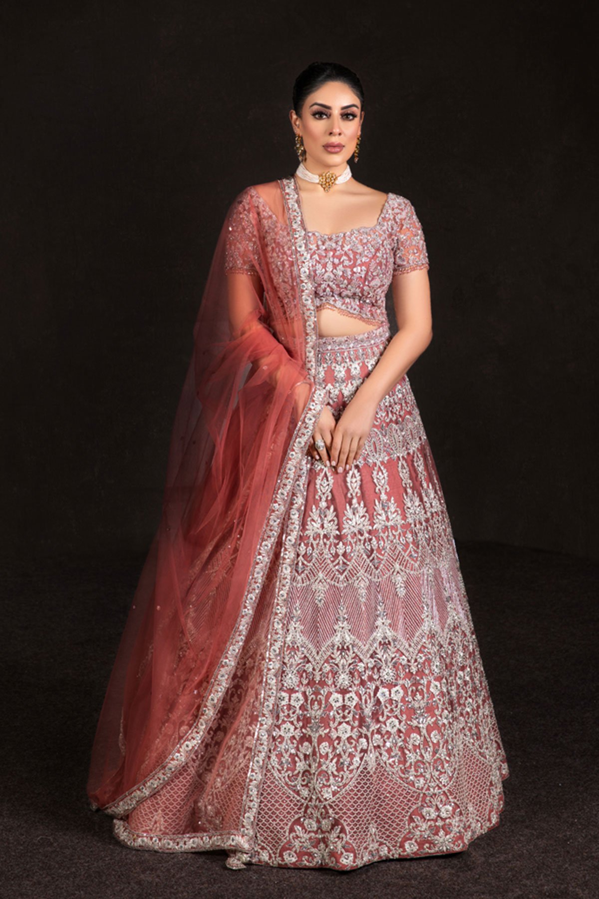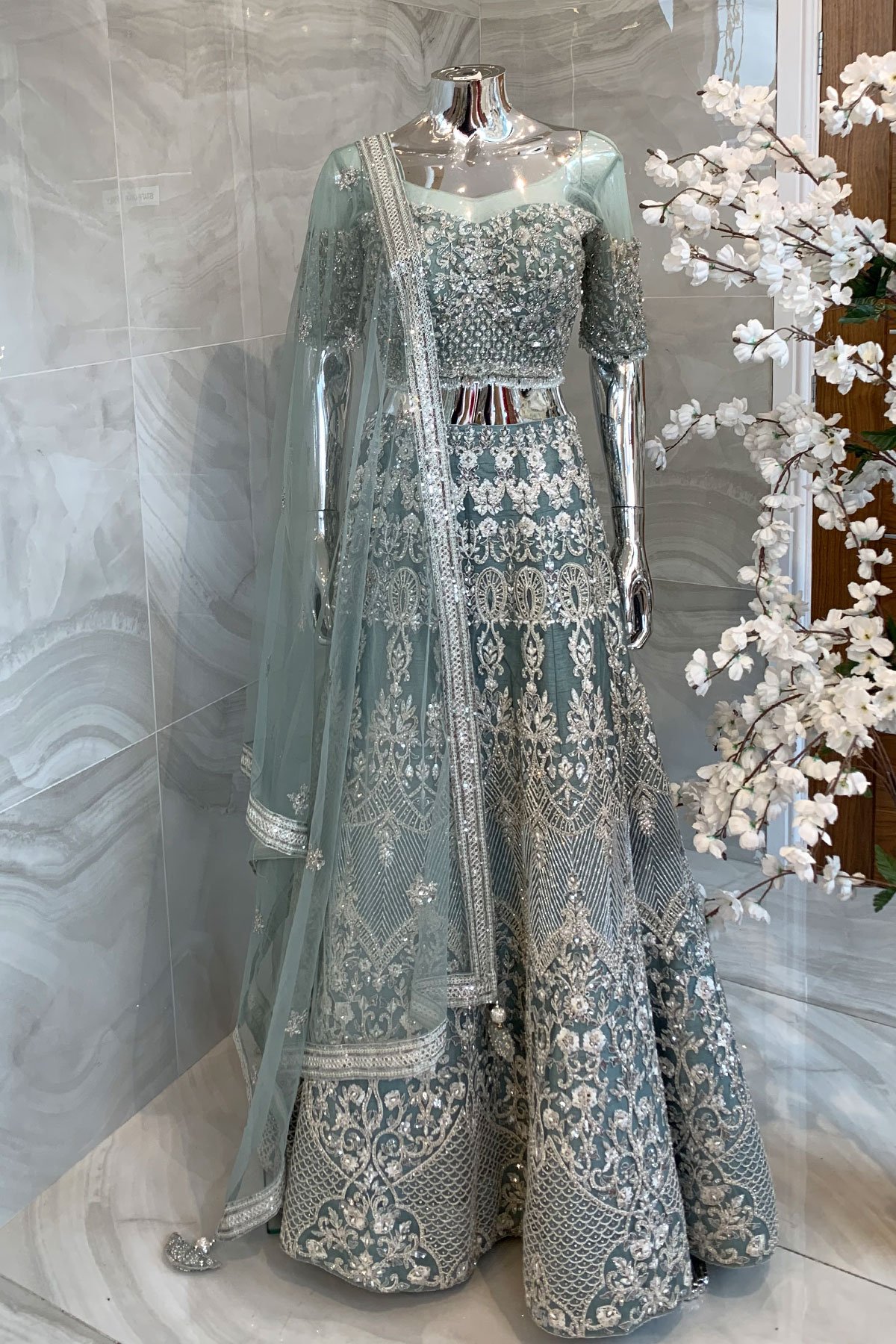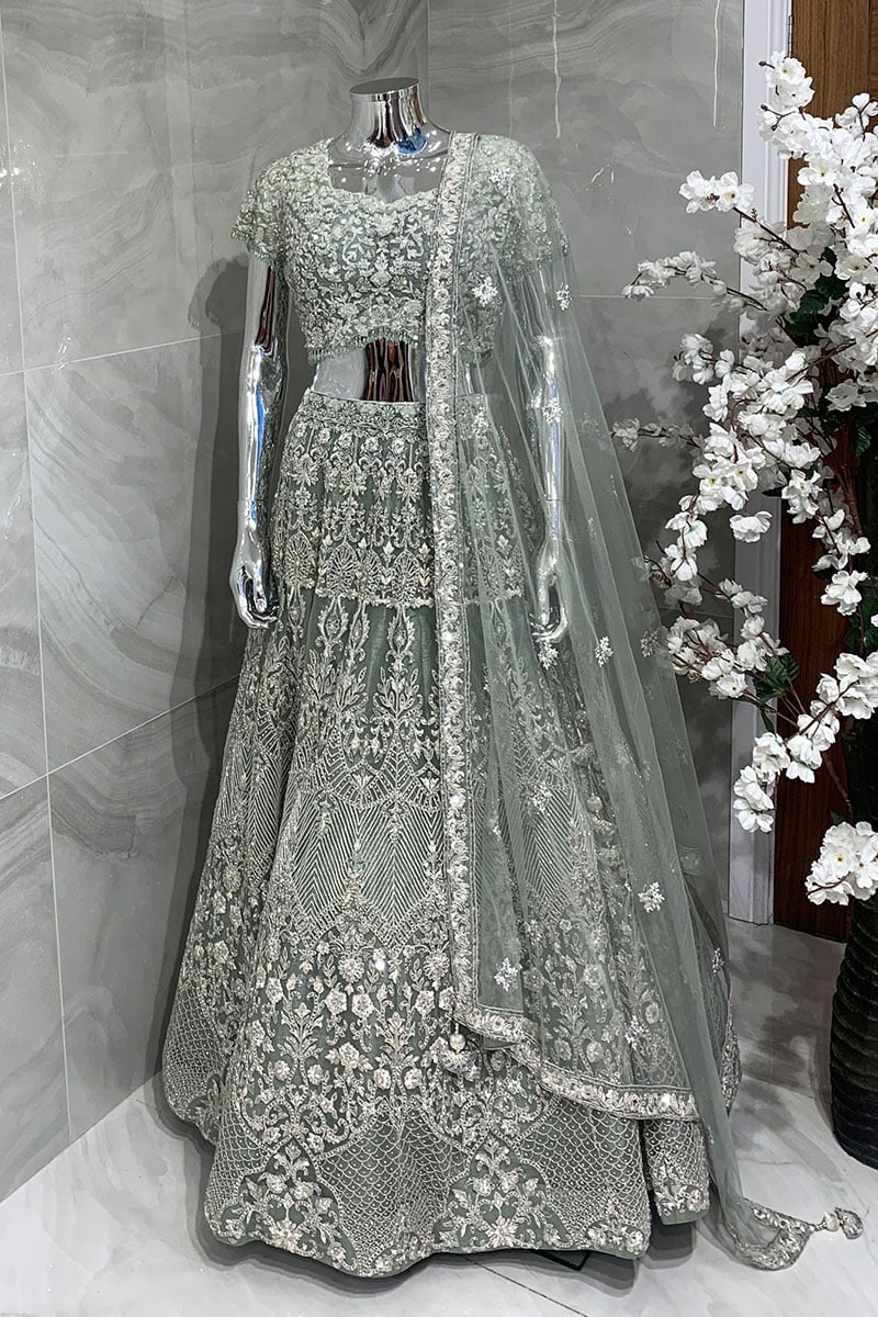 This beautiful 3 piece net lengha choli features a short top with silver zari work embroidery throughout the front and back with dangling beads from the waist as well as the border of the short length embroidered sleeves. It comes with a net luxury embroidered lengha and the look is finished with a net embroidered dupatta with dangling tassels from the edges.