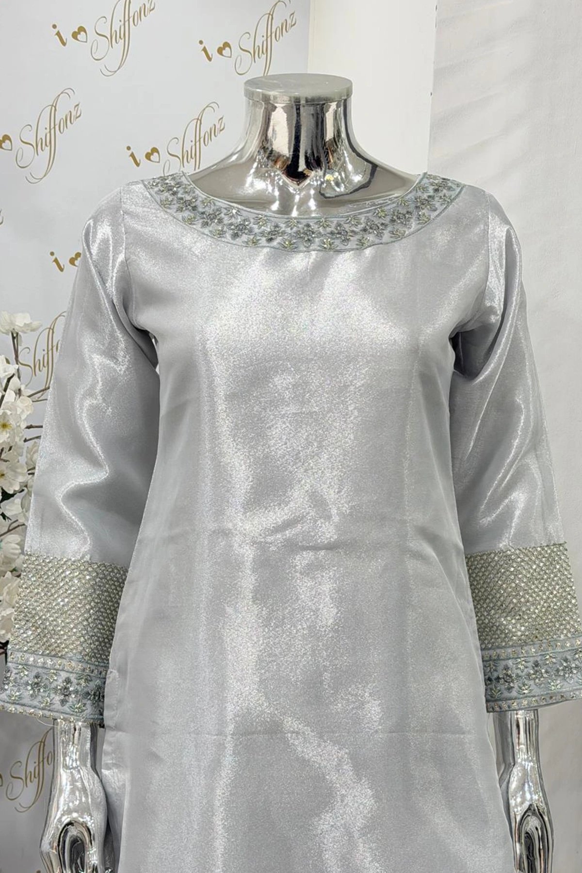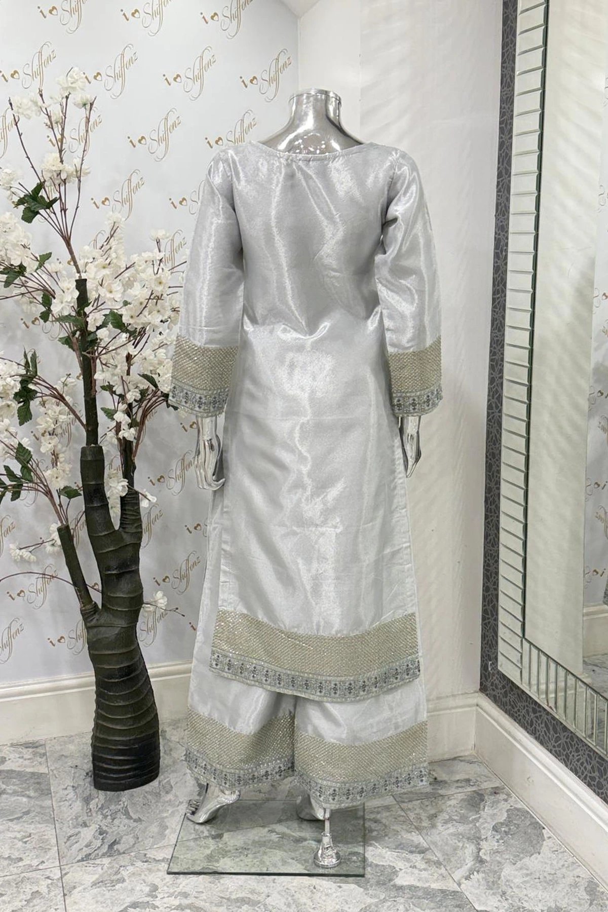 This beautiful 3 piece suit features a straight raw silk shirt with full length sleeves. Paired with straight leg raw silk trousers. The look is finished with a sheesh pati dupatta offering the perfect blend of tradition and contemporary grace. Whether draped over your shoulders or styled as a statement piece, it adds instant grandeur to any ensemble.Featuring mirrors on one side and shimmering gold sequins on the other. Note: There may be visible glue on the dupatta, which is a normal part of the manufacturing process. Rest assured, it will not be noticeable when you wear it.