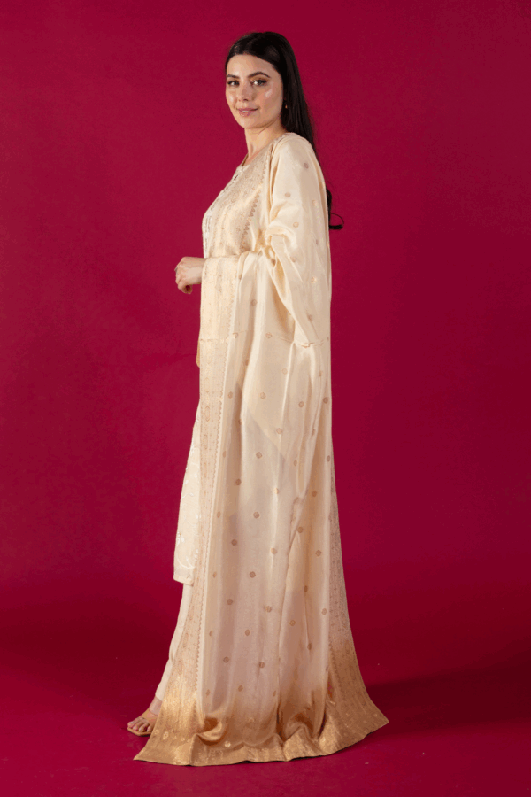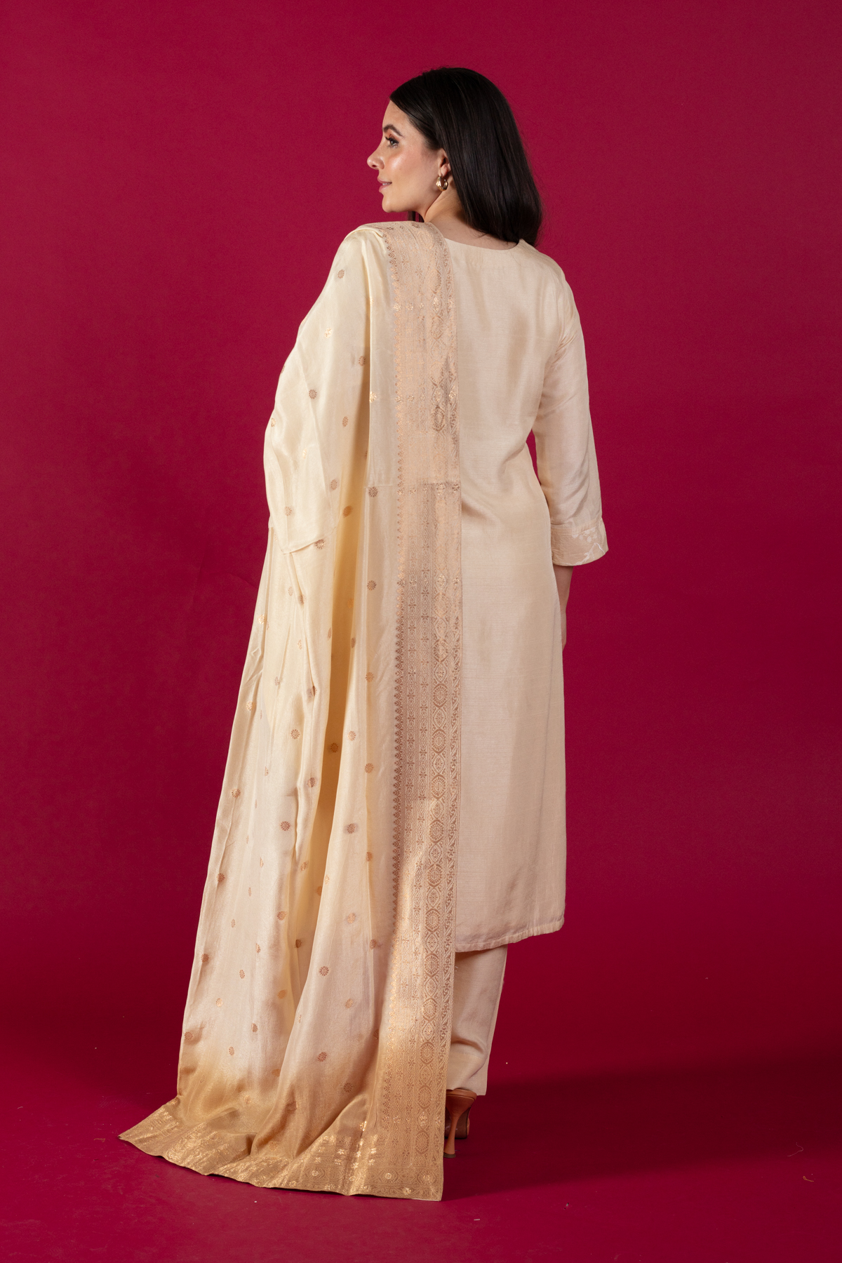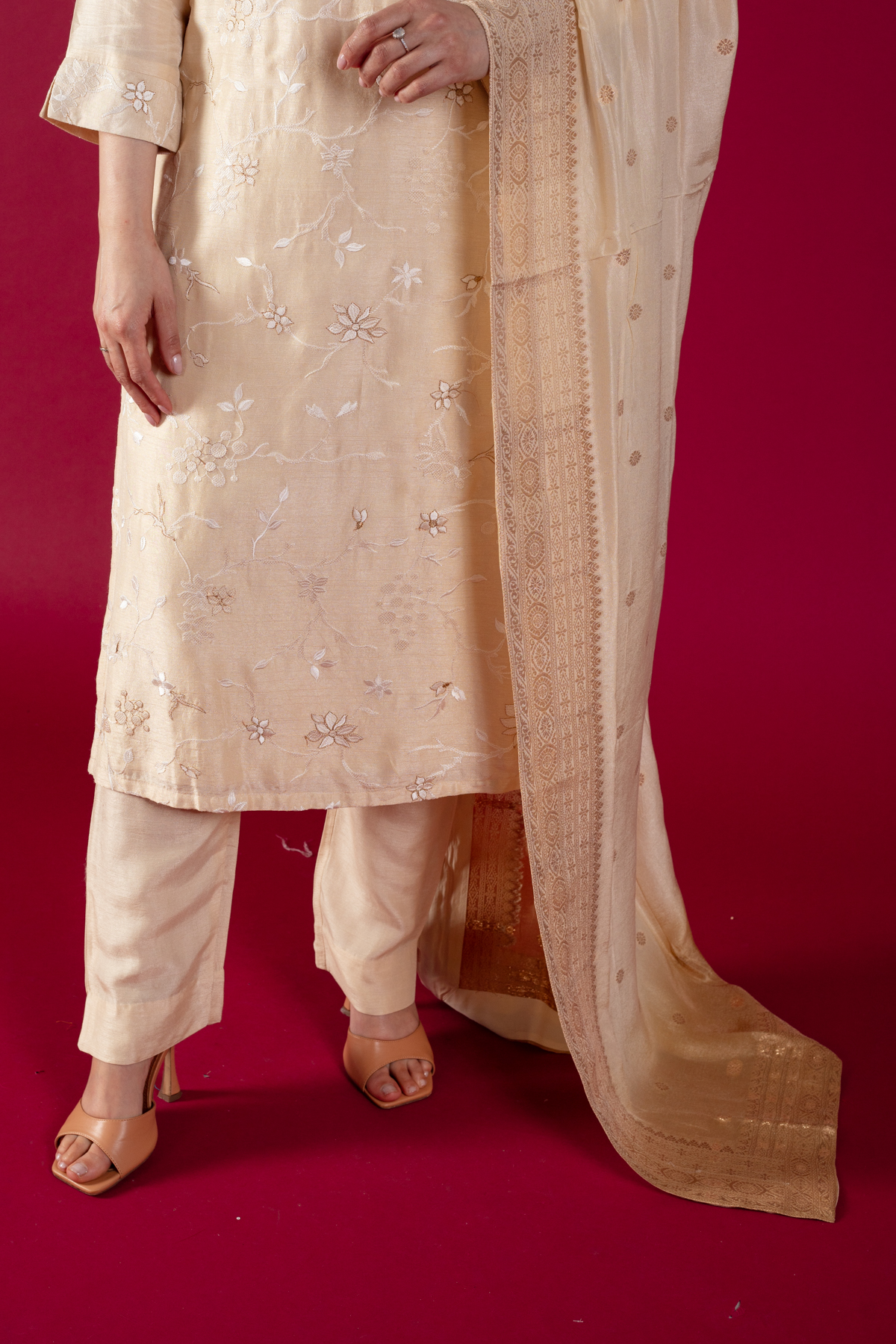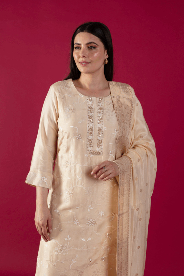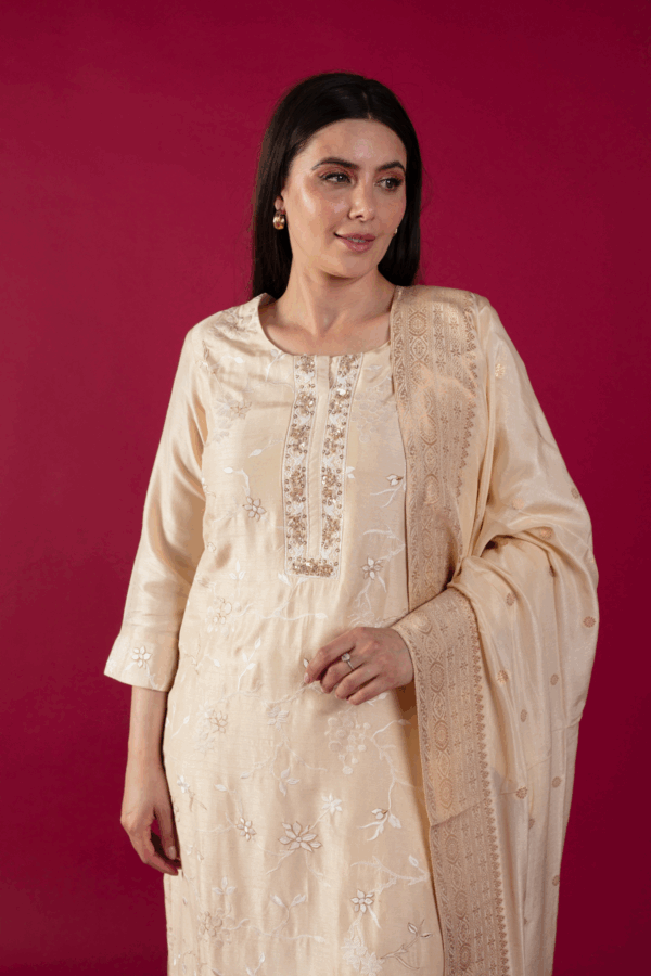 This beautiful 3 piece suit features a straight shirt with luxury thread work embroidery throughout with bead embellishments on the front below the neckline on the lawn silk overlay, finished with full length embroidered sleeves. Paired with straight leg lawn trousers and the look is finished with banarsi printed organza dupatta.