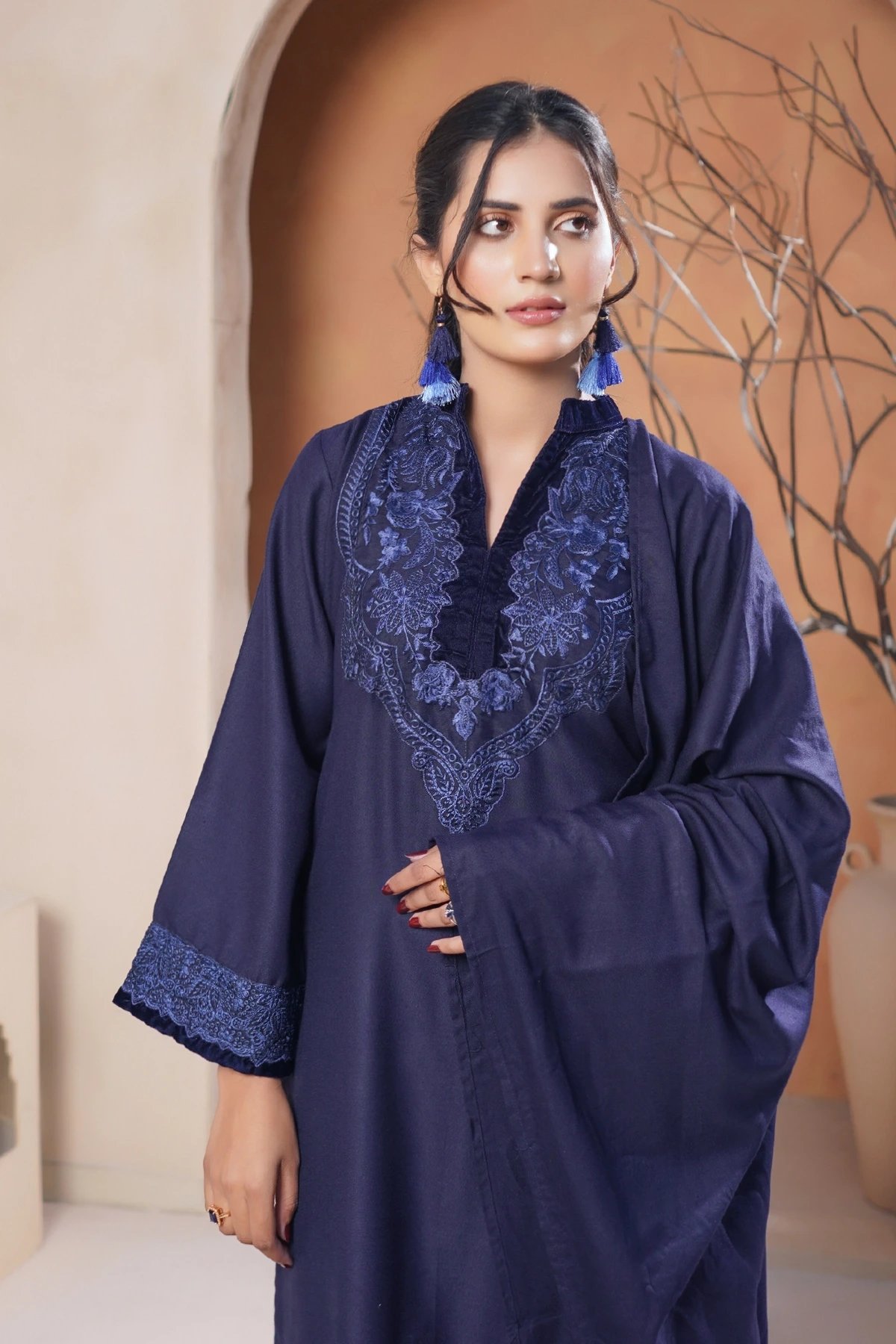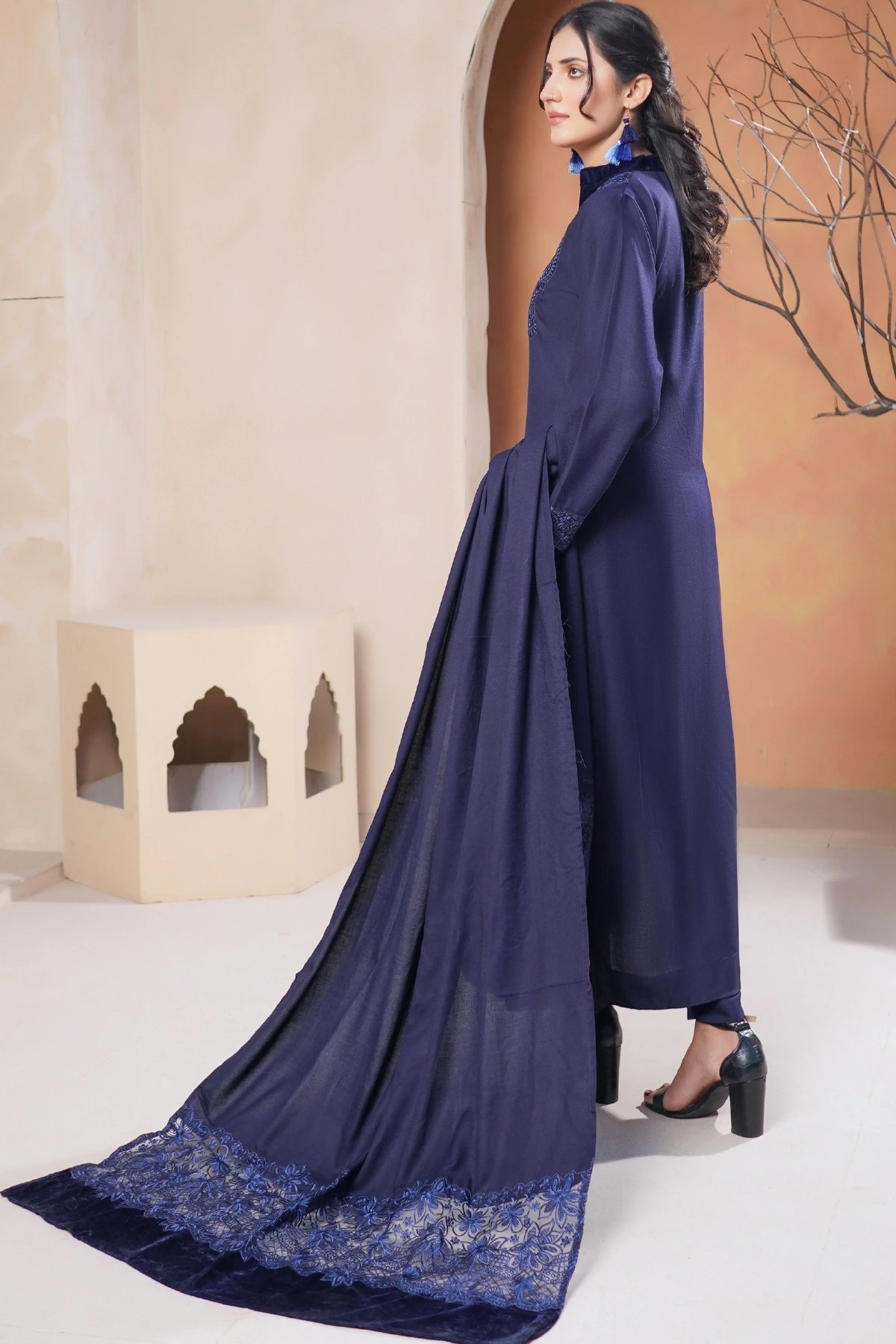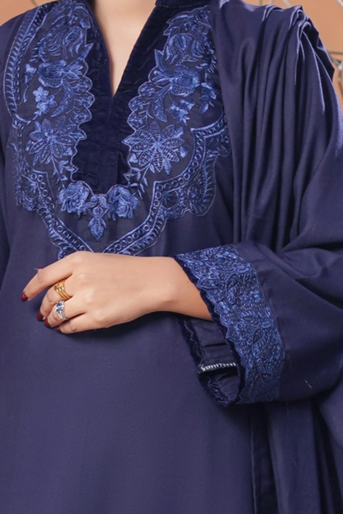 This beautiful 3 piece winter collection suit features a straight shirt with a velvet collar along with thread work embroidered neckline, finished with full length sleeves with embroidered cuffs. Paired with straight leg trousers and the look is finished with an embroidered shawl with a velvet border.
