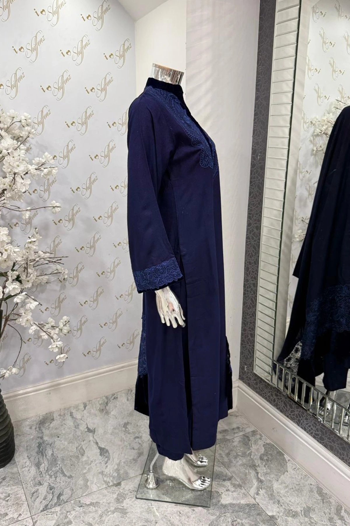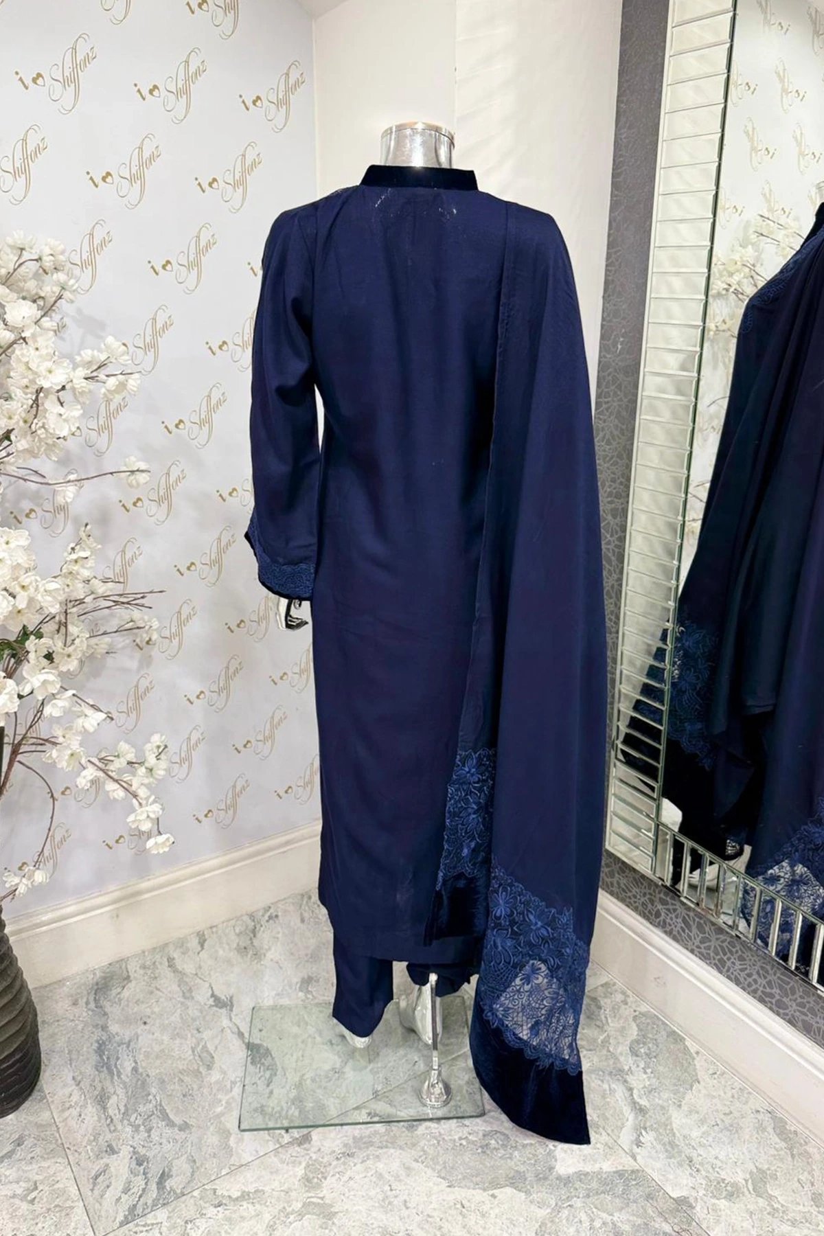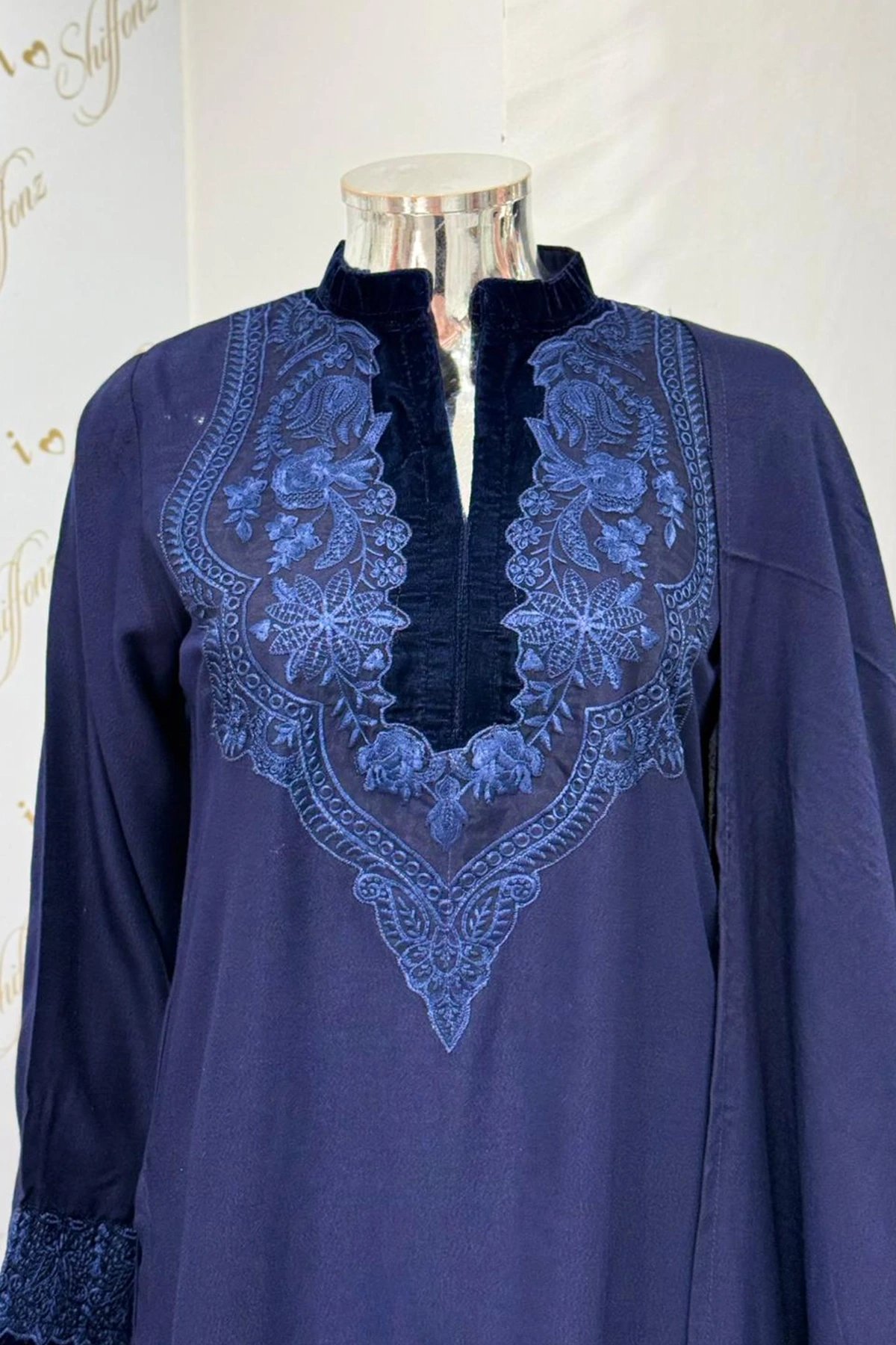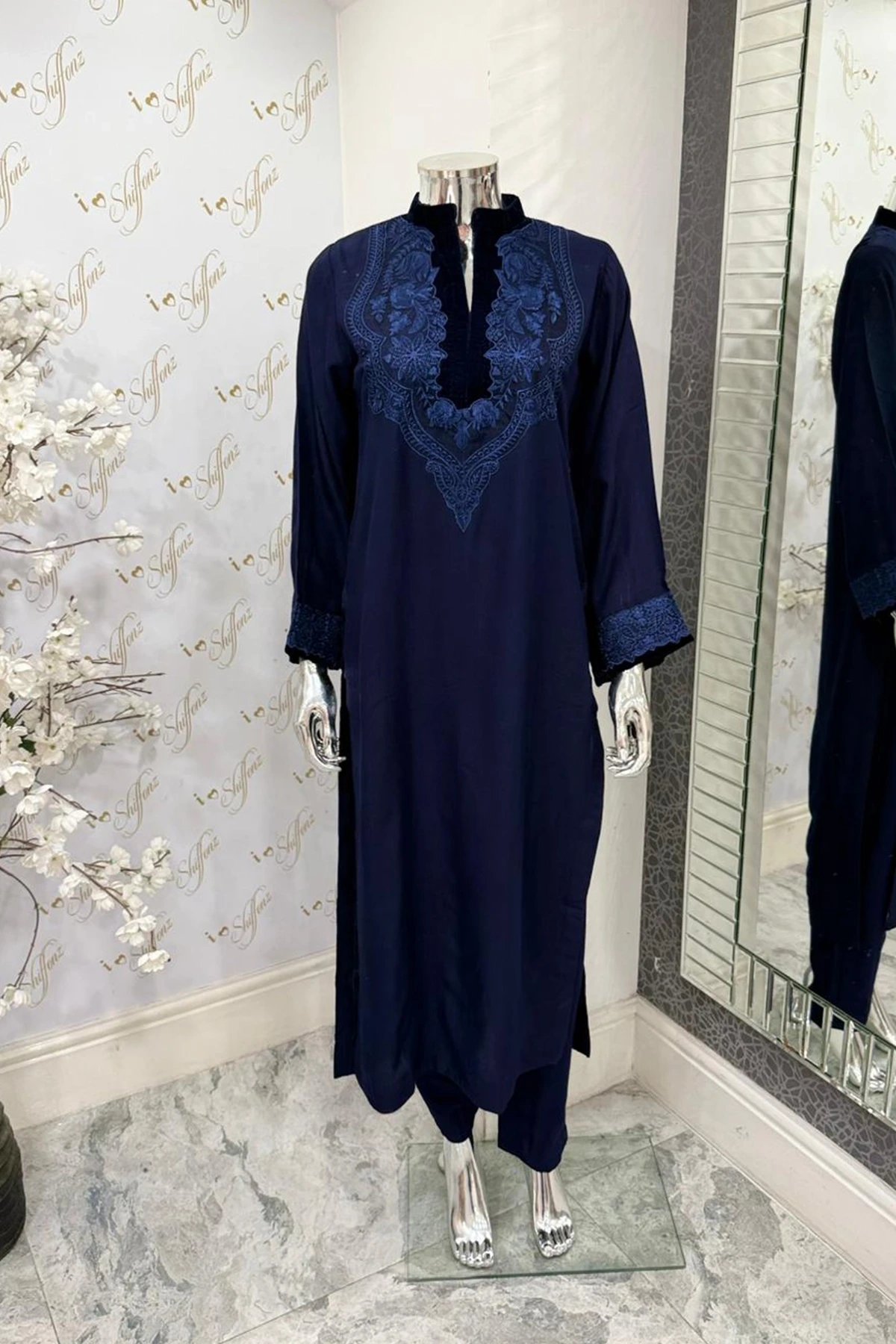 This beautiful 3 piece winter collection suit features a straight shirt with a velvet collar along with thread work embroidered neckline, finished with full length sleeves with embroidered cuffs. Paired with straight leg trousers and the look is finished with an embroidered shawl with a velvet border.