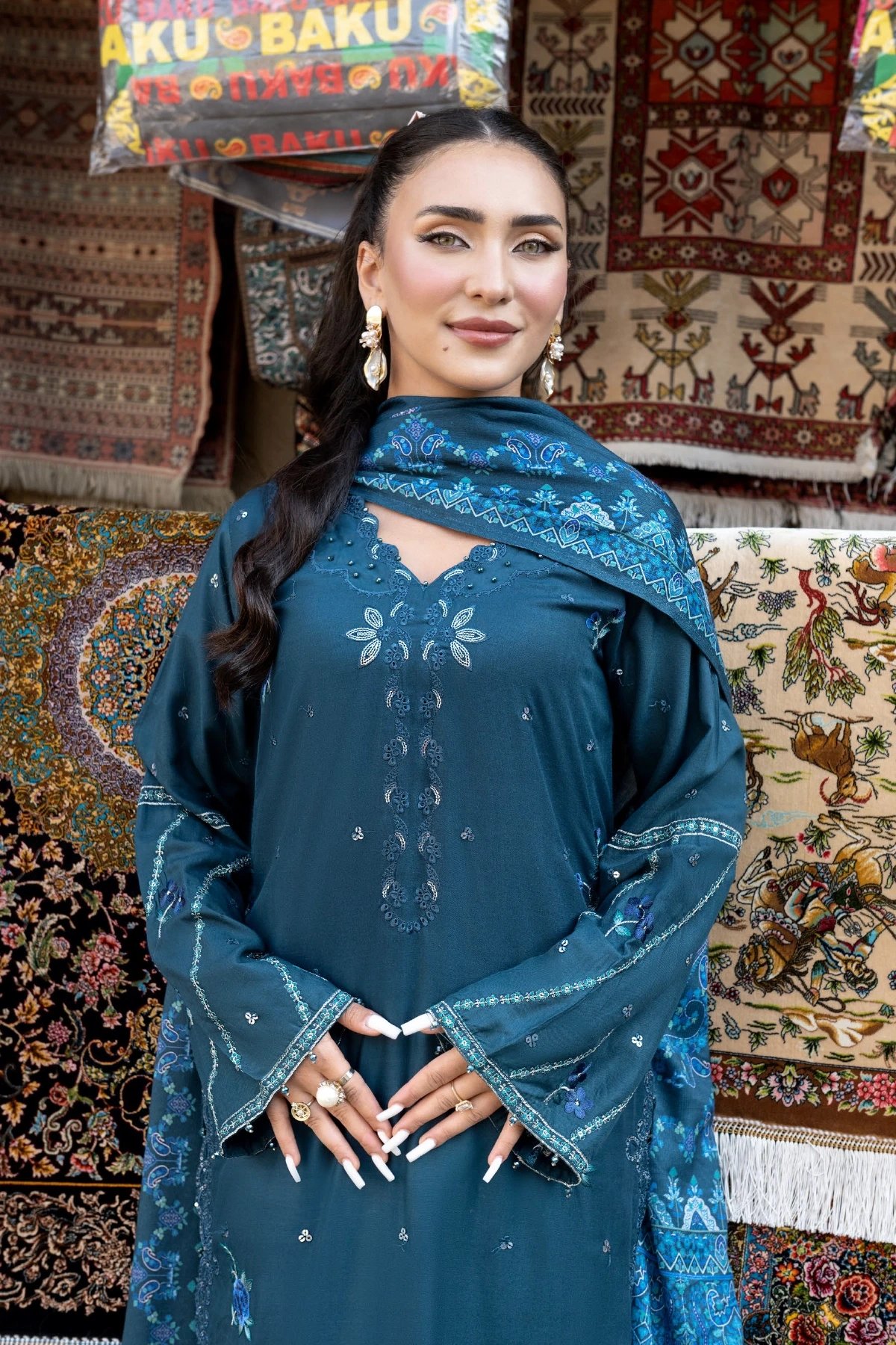 This beautiful 3 piece winter collection features a straight shirt with luxury thread work embroidery along with sequence embellishments, finished with full length embroidered sleeves with dangling beads on cuffs and border. Paired with straight leg trousers and the look is finished with a printed wool shawl.