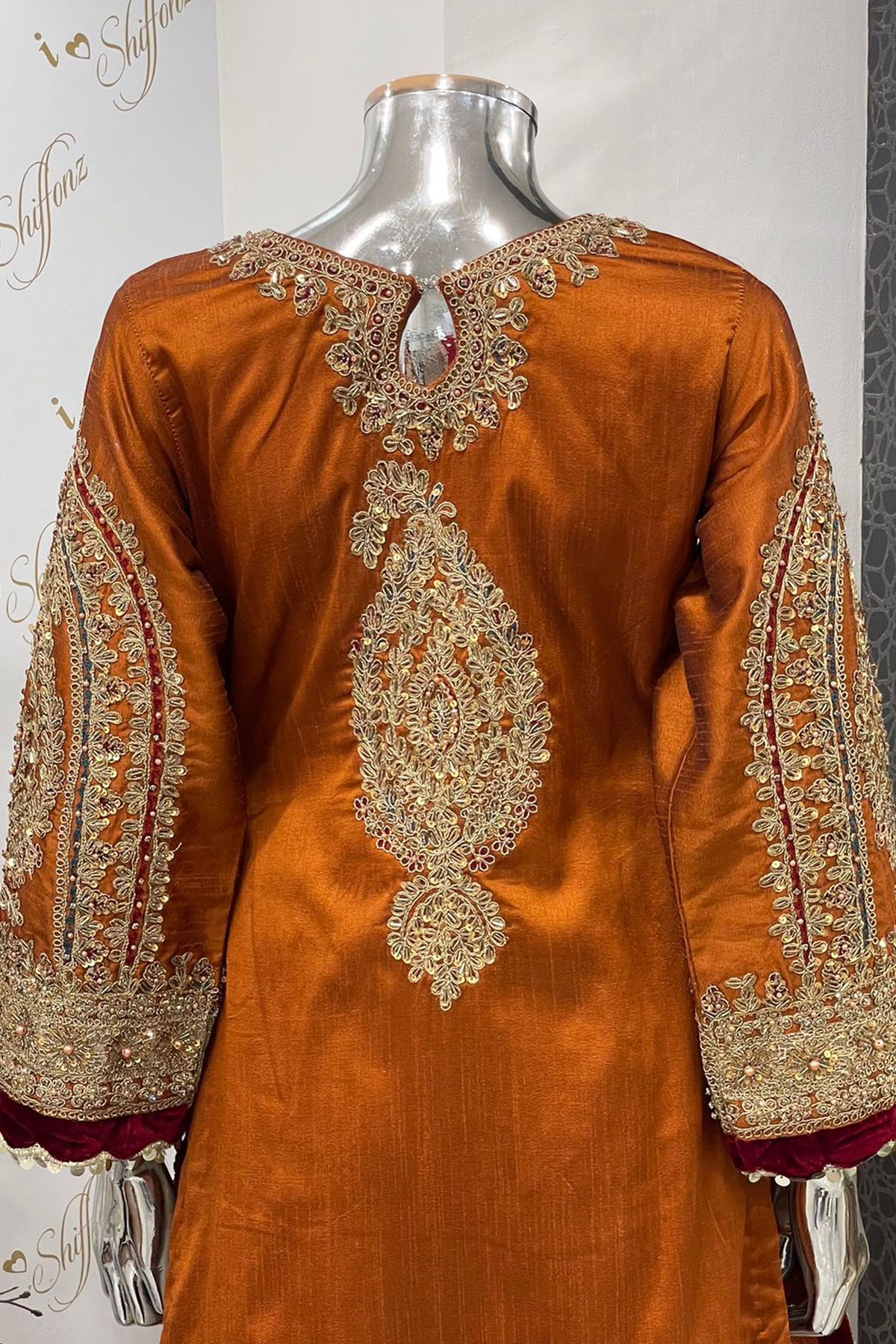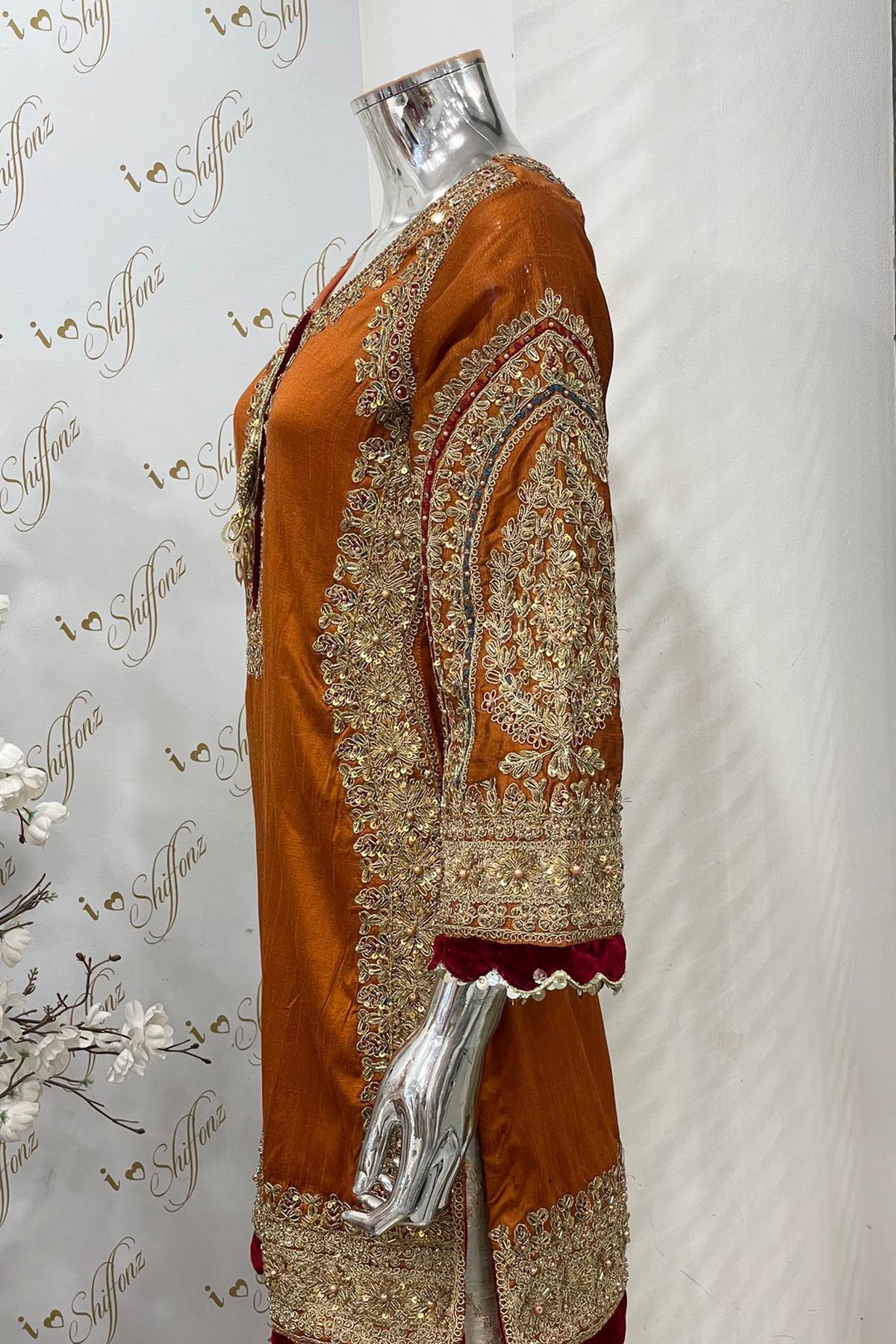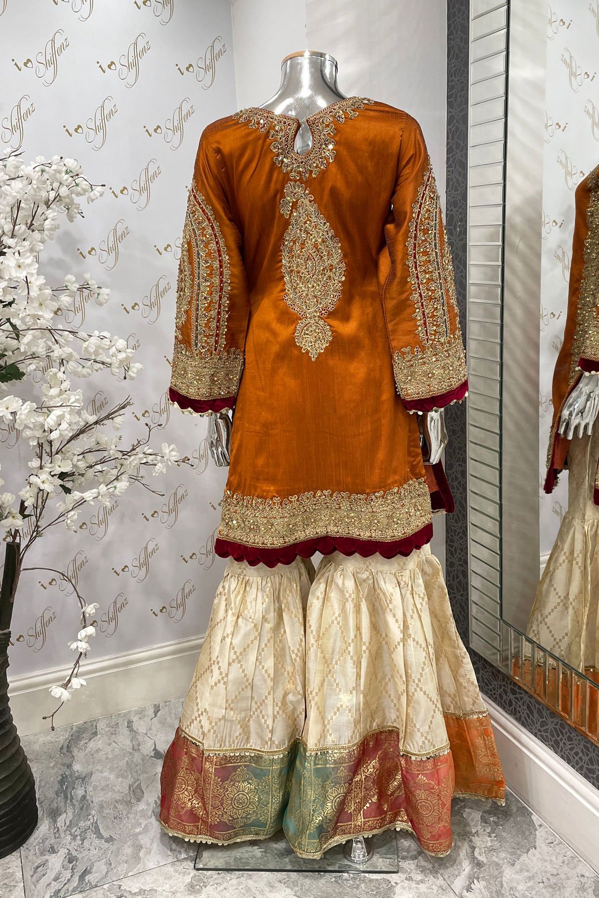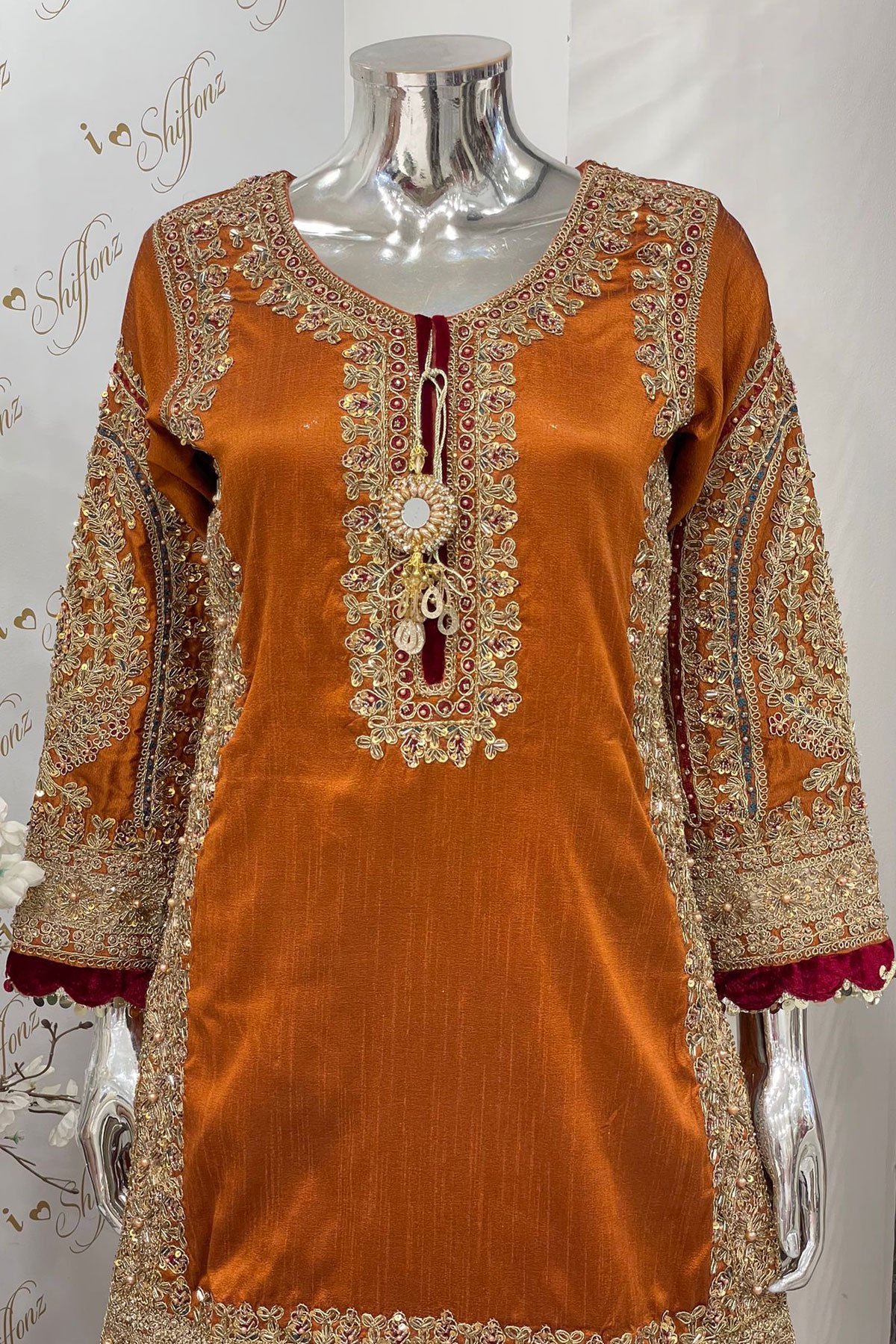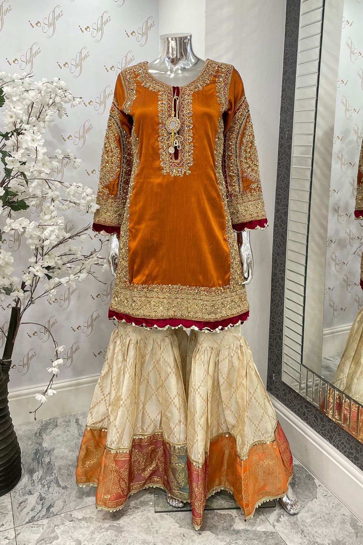 This beautiful 3 piece Abru collection features a straight raw silk shirt with dori thread work embroidery throughout with full length embroidered sleeves. It comes with a contrasted printed gharara and the look is finished with a contrasted embroidered organza dupatta. Perfect mother and daughter collection for wedding season.
