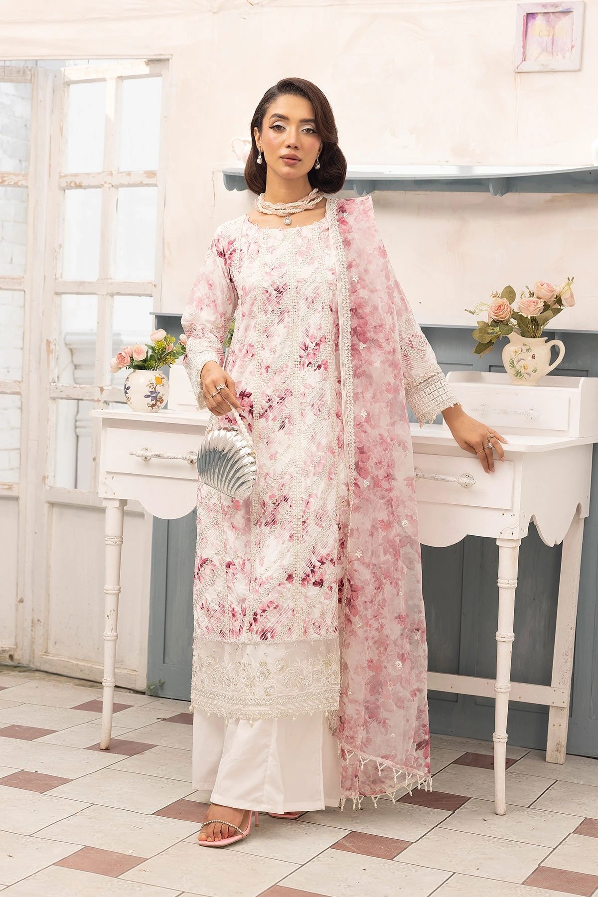 This beautiful 3 piece suit features a straight printed shirt with luxury thread work embroidery throughout, finished with an organza embroidered border. It comes with full length embroidered sleeves paired with viscose plain plazo trousers. The look is finished with a digital printed organza dupatta.