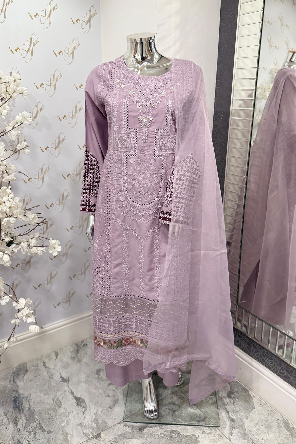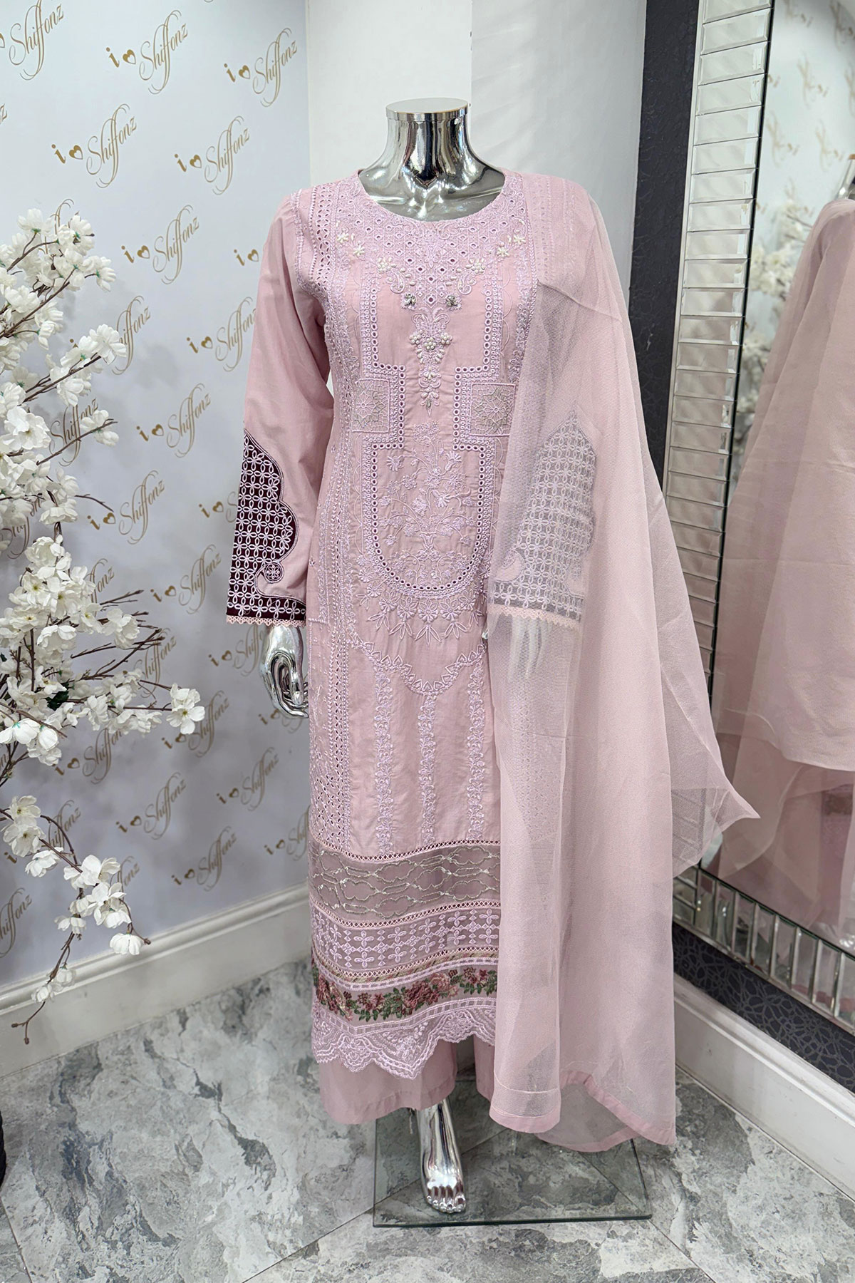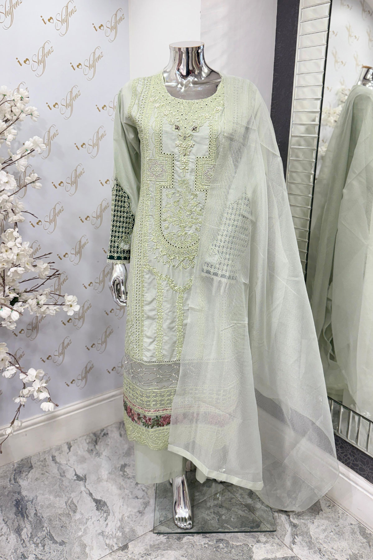 This beautiful 3 piece Afiya collection features a straight shirt with luxury thread work embroidery with pearl embellishments on the front, finished with full length embroidered sleeves with lace embroidered cuffs. Paired with plazo trouser. The look is finished with a khadi net dupatta. Perfect casual collection for this Eid for comfort and elegance,