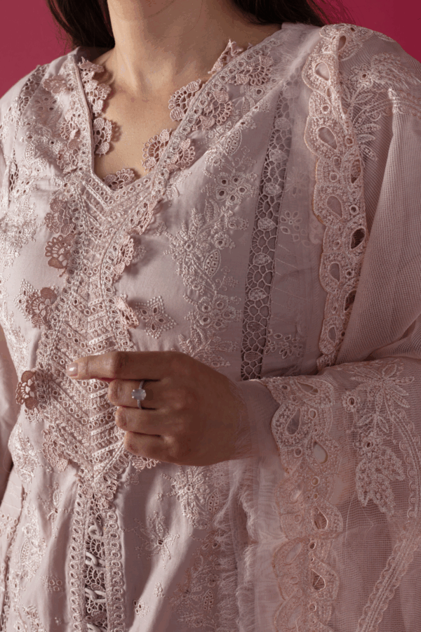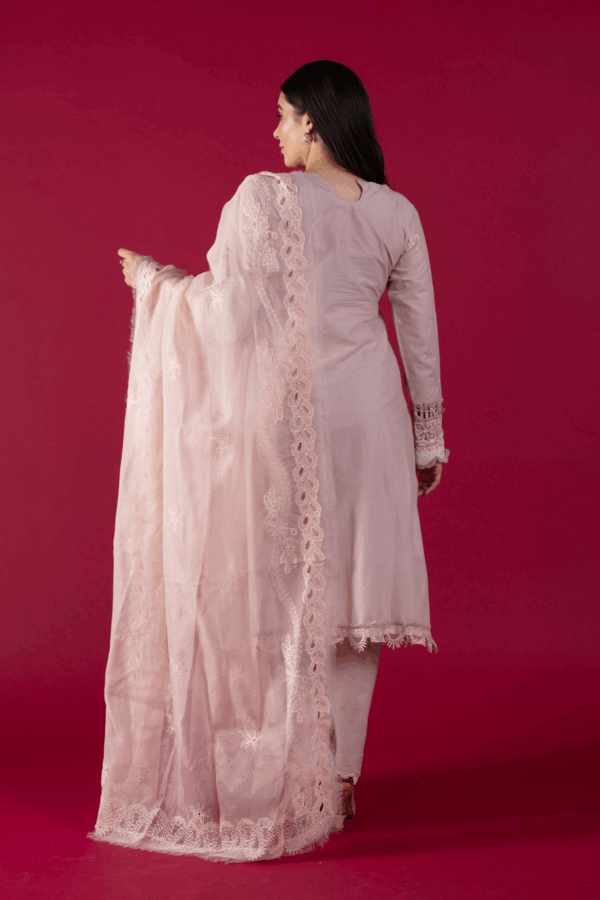 This beautiful 3 piece Qalamkar inspired collection features a straight shirt with chikan kari embroidery throughout with an open slit along the middle, finished with full length embroidered sleeves. Paired with straight leg lawn trousers and the look is finished with a chiffon embroidered dupatta. Note: Above catalogue pictures are for design reference. Stitching and embroidery patterns may vary.