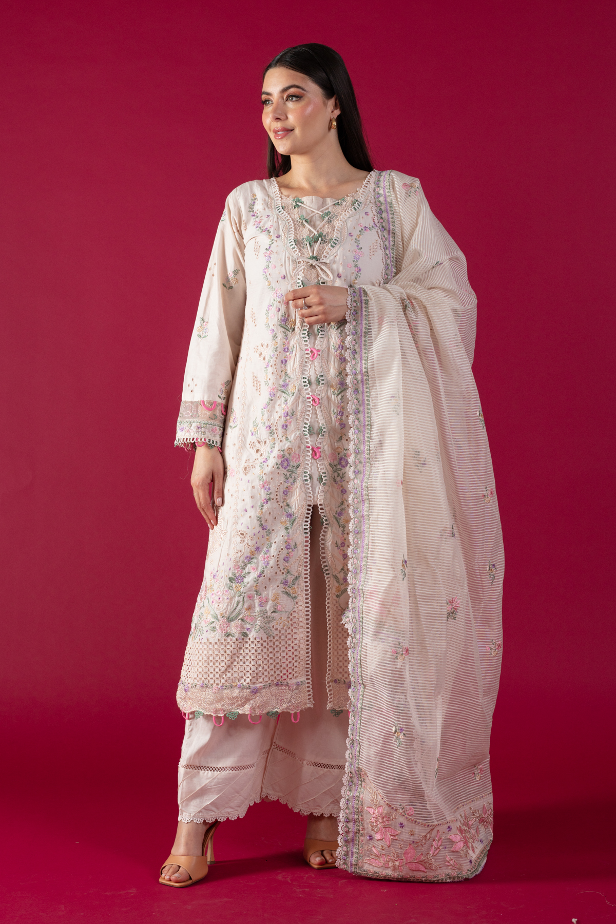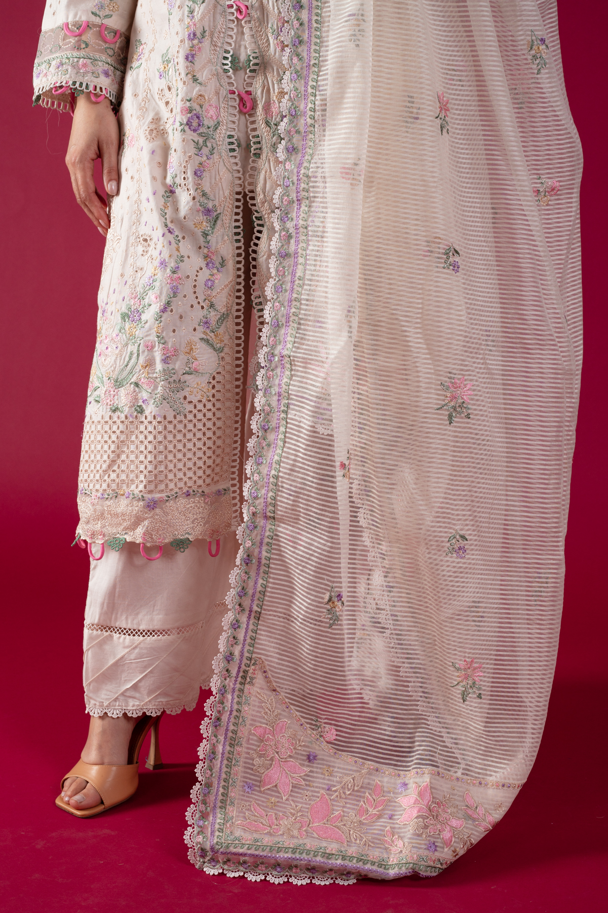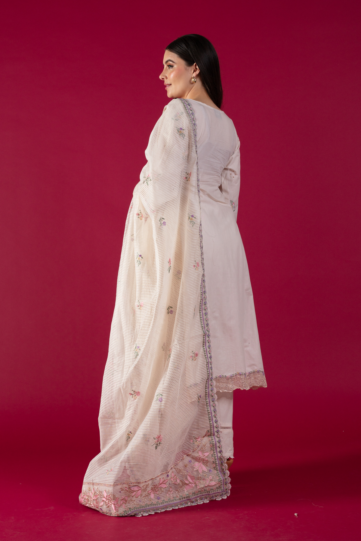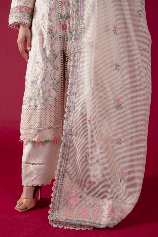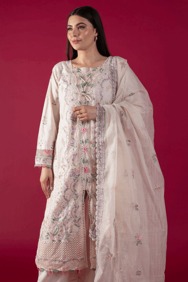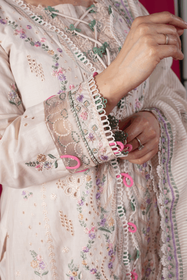 This beautiful 3 piece Qalamkar inspired collection features a straight shirt with chikan kari embroidery throughout with piping embellishment on the front neckline finished with full length embroidered sleeves. Paired with straight leg lawn trousers and the look is finished with a jacquard weaved embroidered dupatta. Note: Above catalogue pictures are for design reference only, the stitching, embroidery and embellishments may vary.