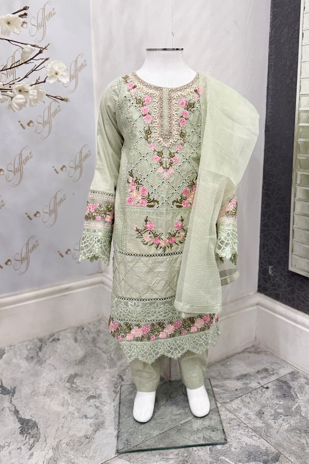 This beautiful 3 piece Afreen kids collection features a straight shirt with luxury chikan kari through out the front with thread work embroidered patterns,  finished with full length embroidered sleeves with lace embroidered cuffs. Paired with wide leg trousers. The look is finished with a khadi net dupatta. Perfect casual collection for this Eid for comfort and elegance.