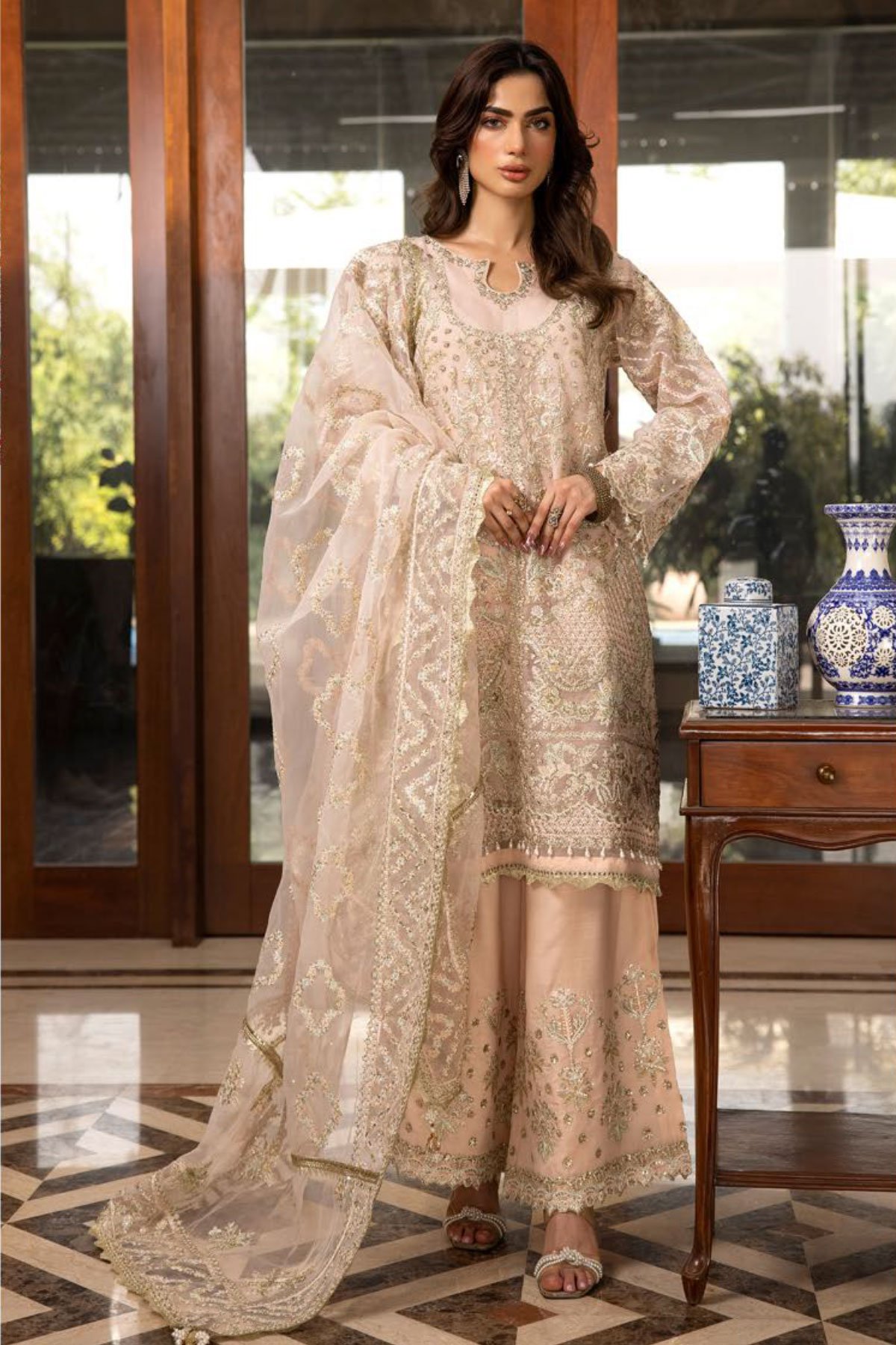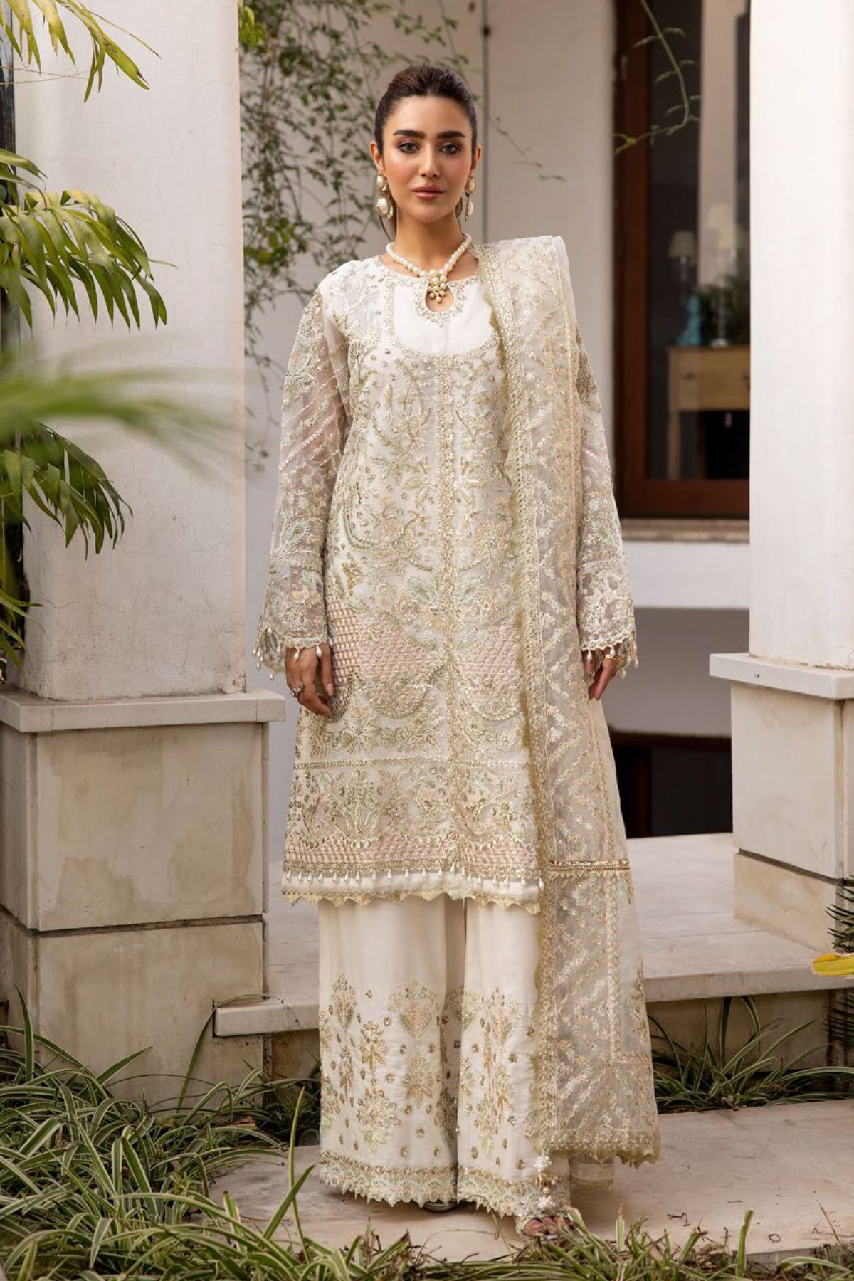 This beautiful 3 piece Afrozeh collection suit features a straight a-line shirt with luxury thread work embroidery throughout with full length embroidered sleeves. It comes with embroidered plazo trousers and the look is finished with an embroidered organza dupatta.