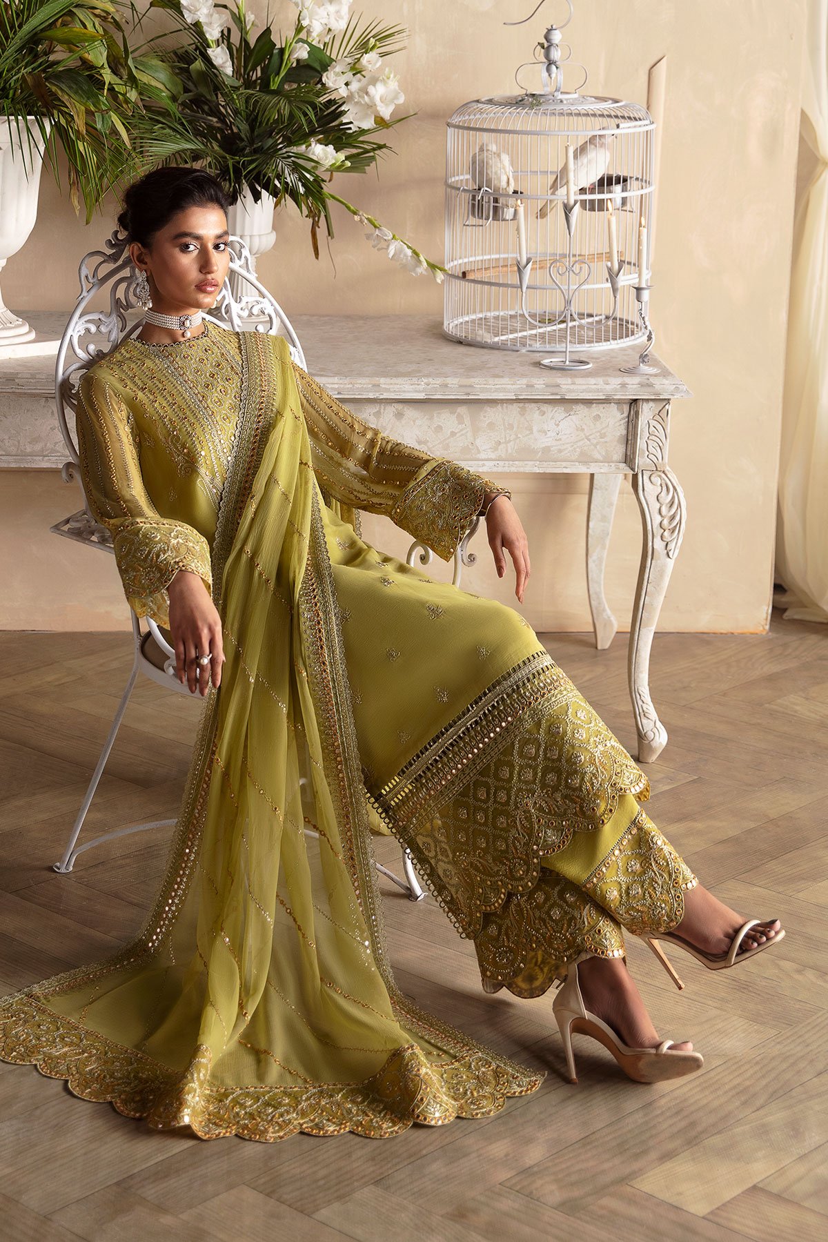 This beautiful 3 piece Afrozeh collection suit features a straight shirt with luxury thread work embroidered front finished with full length embroidered sleeves. It comes with wide leg crepe trousers and the look is finished with an embroidered chiffon dupatta. Note: Above catalogue pictures are for design reference only.