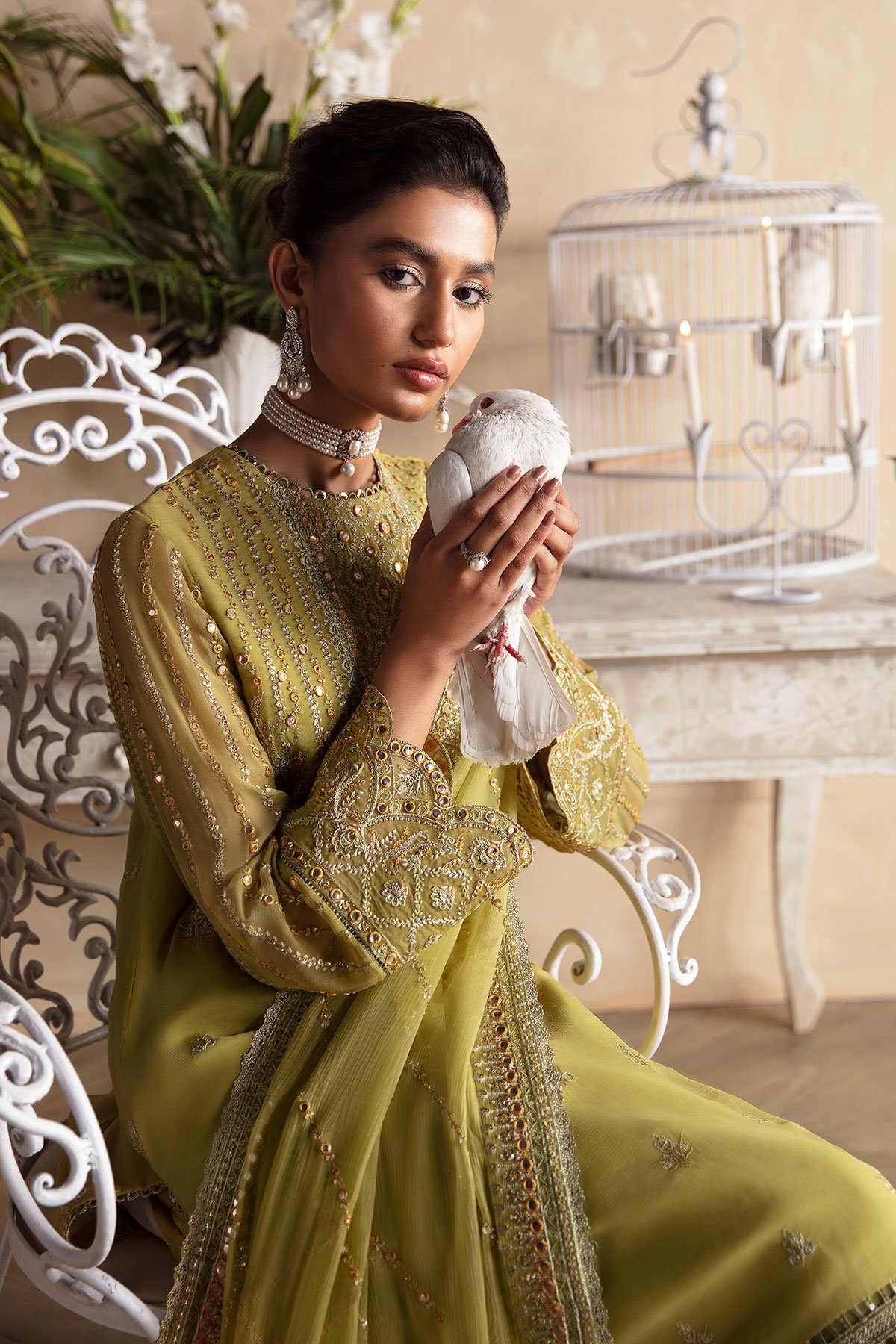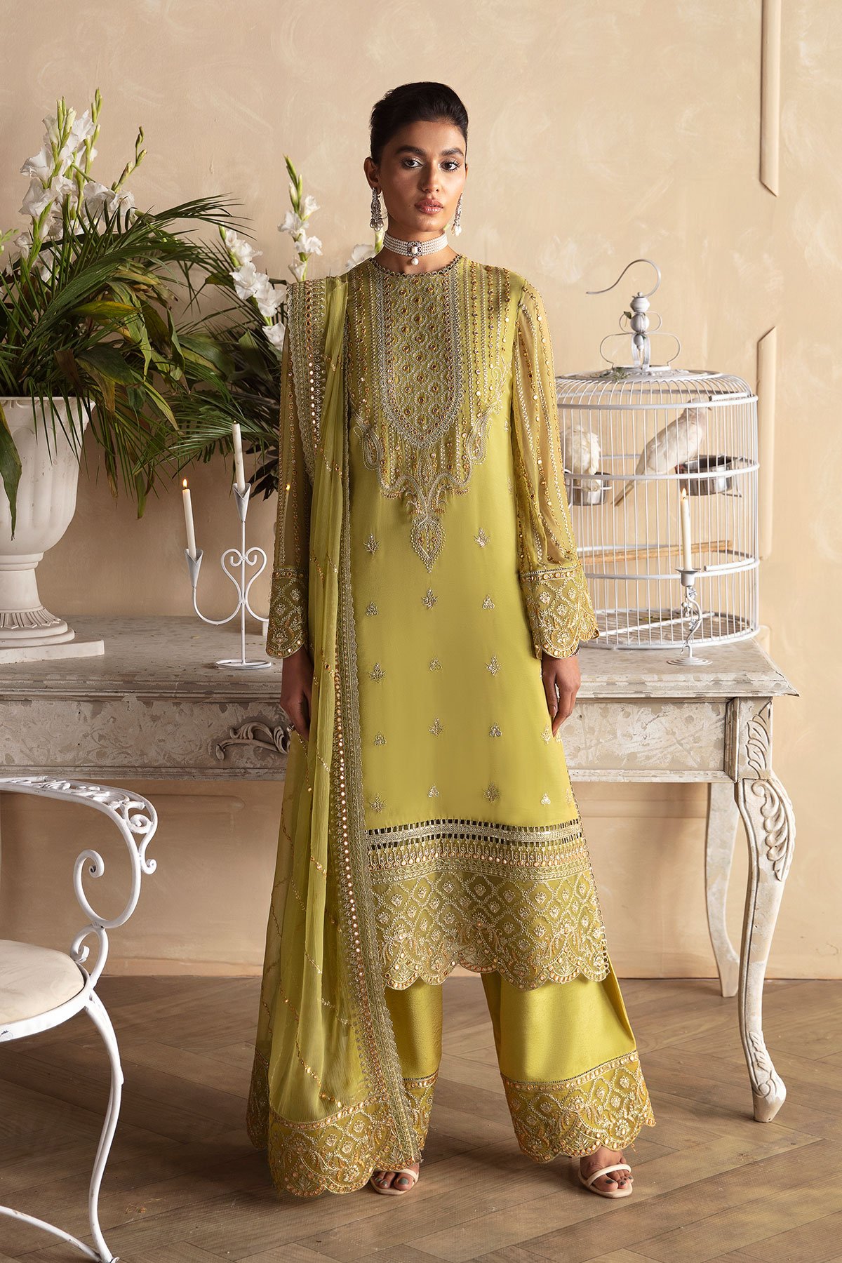 This beautiful 3 piece Afrozeh collection suit features a straight shirt with luxury thread work embroidered front finished with full length embroidered sleeves. It comes with wide leg crepe trousers and the look is finished with an embroidered chiffon dupatta. Note: Above catalogue pictures are for design reference only.