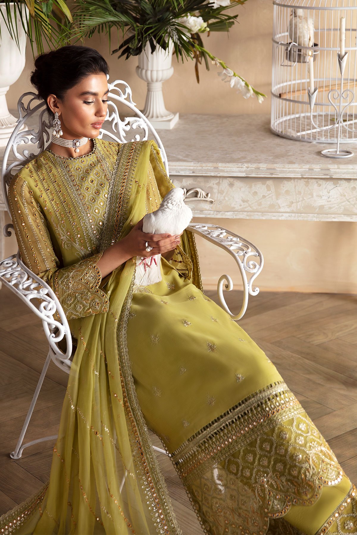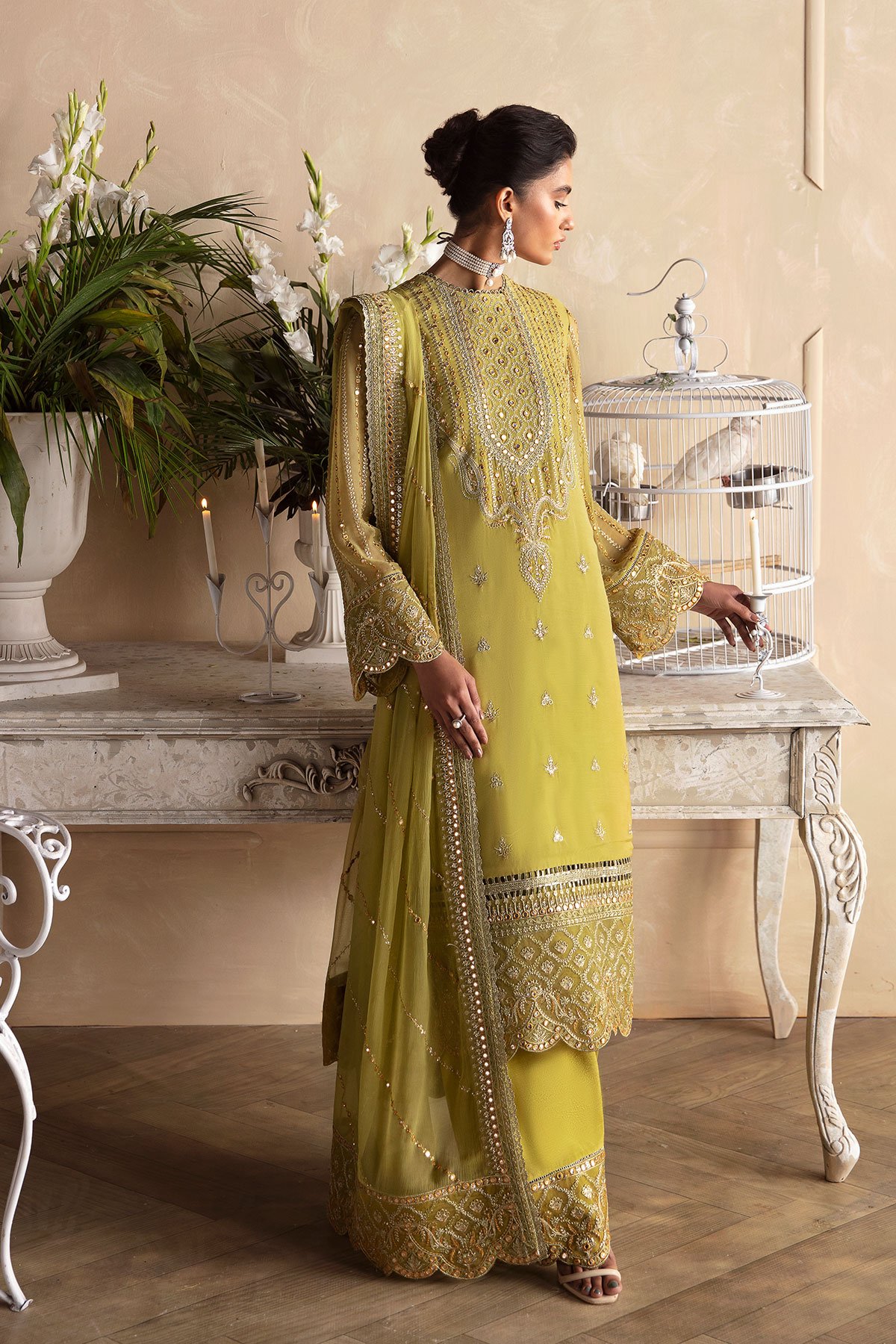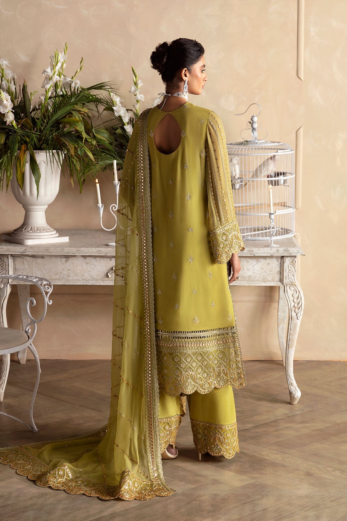 This beautiful 3 piece Afrozeh collection suit features a straight shirt with luxury thread work embroidered front finished with full length embroidered sleeves. It comes with wide leg crepe trousers and the look is finished with an embroidered chiffon dupatta. Note: Above catalogue pictures are for design reference only.