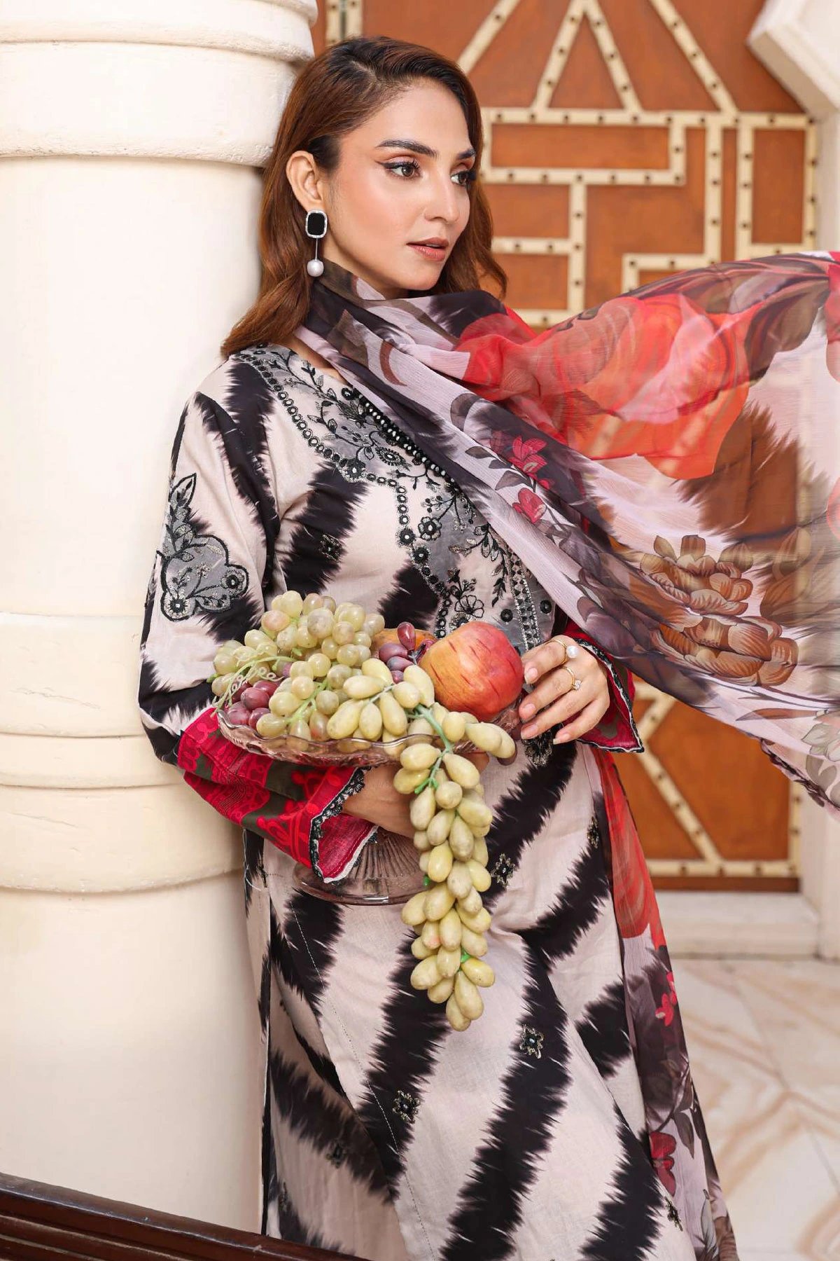 This beautiful 3 piece carishma inspired lawn suit features a straight shirt with luxury embroidered front, finished with full length sleeves. Paired with straight leg trousers with embroidered patches on the border. The look is finished with a digital printed chiffon dupatta. Perfect casual summer attire.