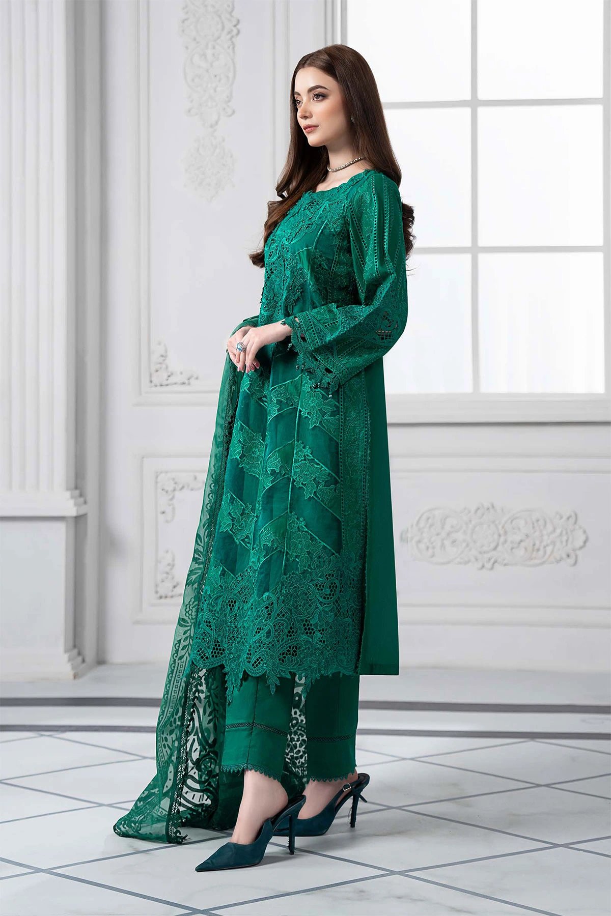 This beautiful 3 piece Maria b inspired suit features a straight shirt with luxury chikan kari embroidery with 3d lace embellished pattern, finished with full length embroidered sleeves. Paired with straight leg lawn plain trousers and the look is finished with an organza printed dupatta. Note: Above catalogue picture is for design reference only, embroidered patterns will vary. Trousers are also plain, not embellished as shown in picture.