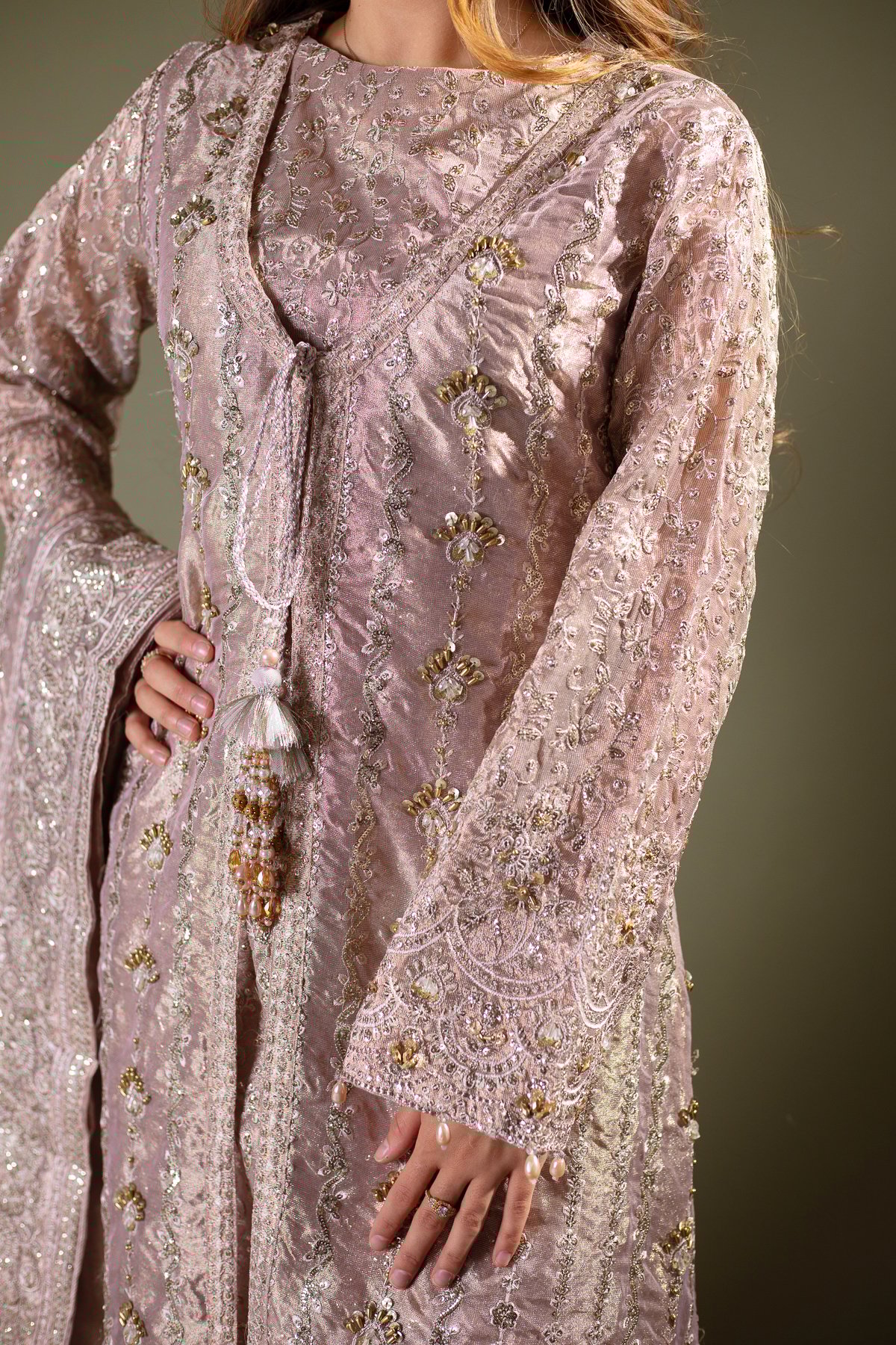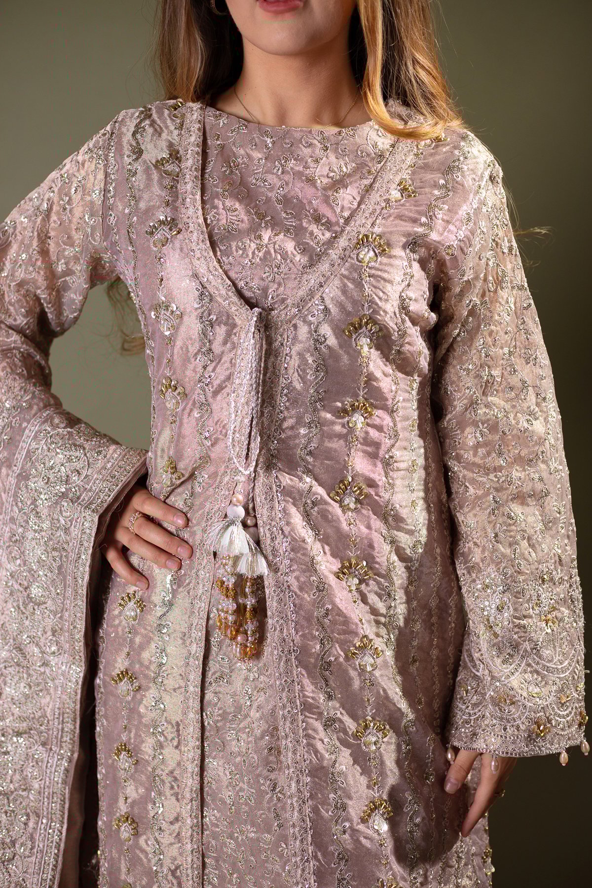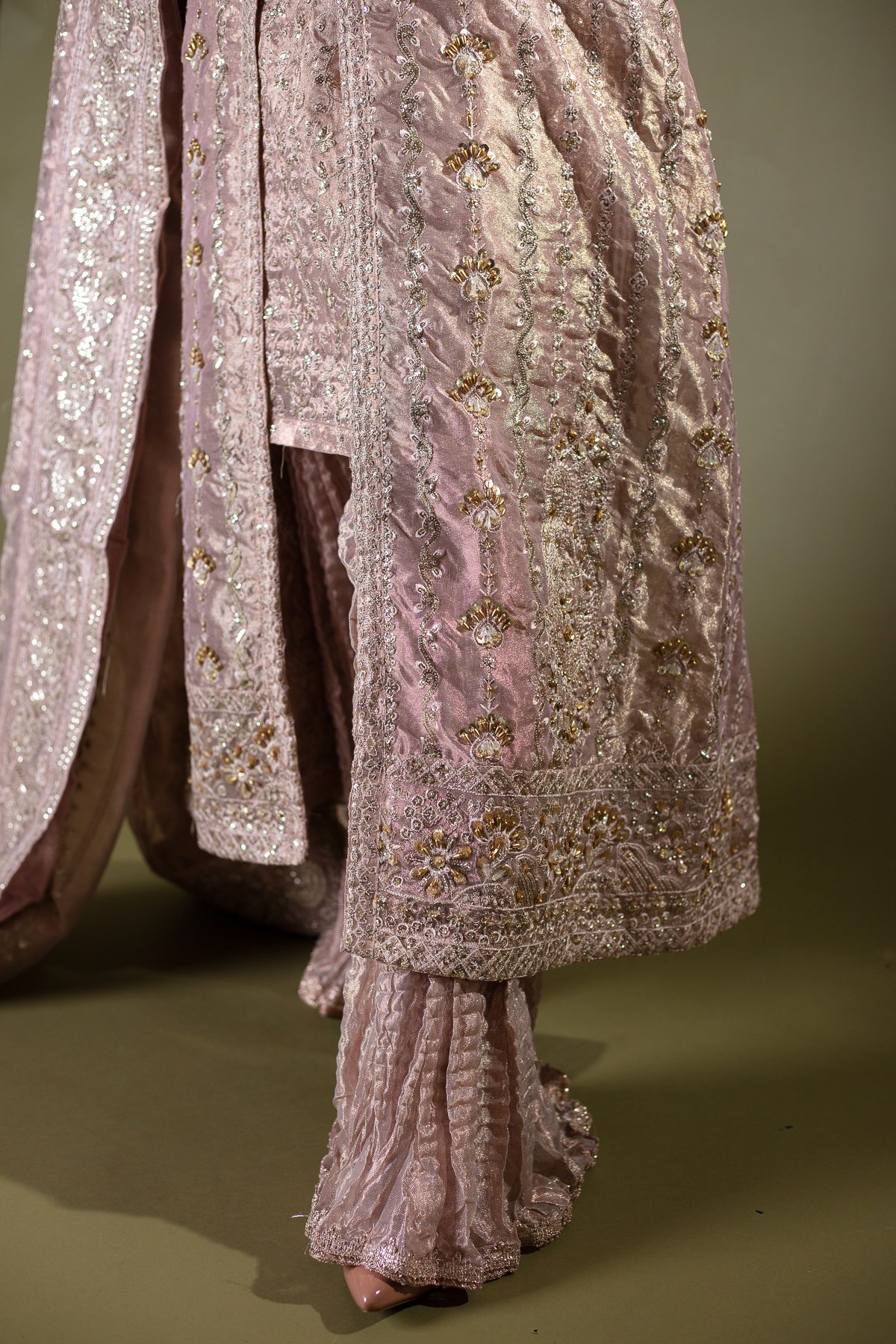 This beautiful 3 piece Aik Atelier wedding collection suit features a a luxury embroidered jacket with dori embellishment along the middle and an embroidered inner shirt. It comes with full length embroidered sleeves and crushed pleated plaza trousers. The look is finished with an embroidered organza dupatta.