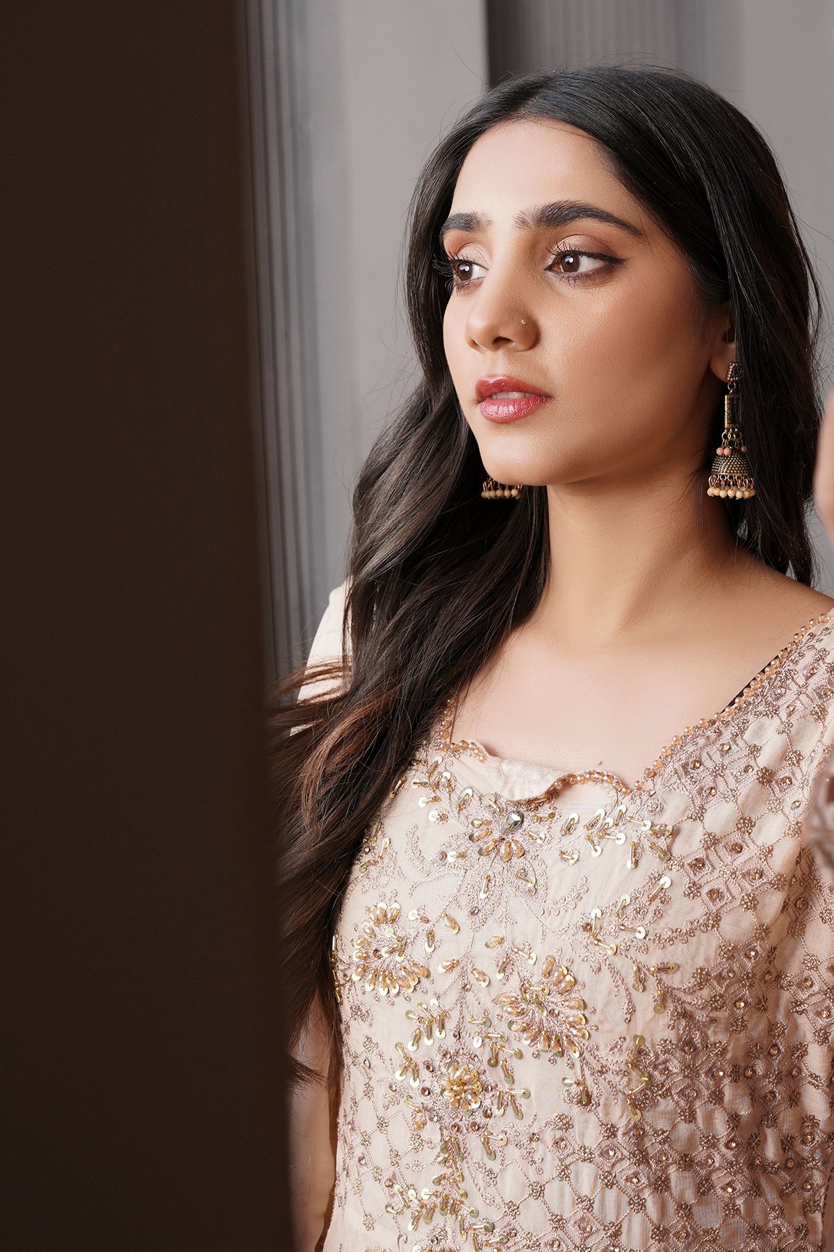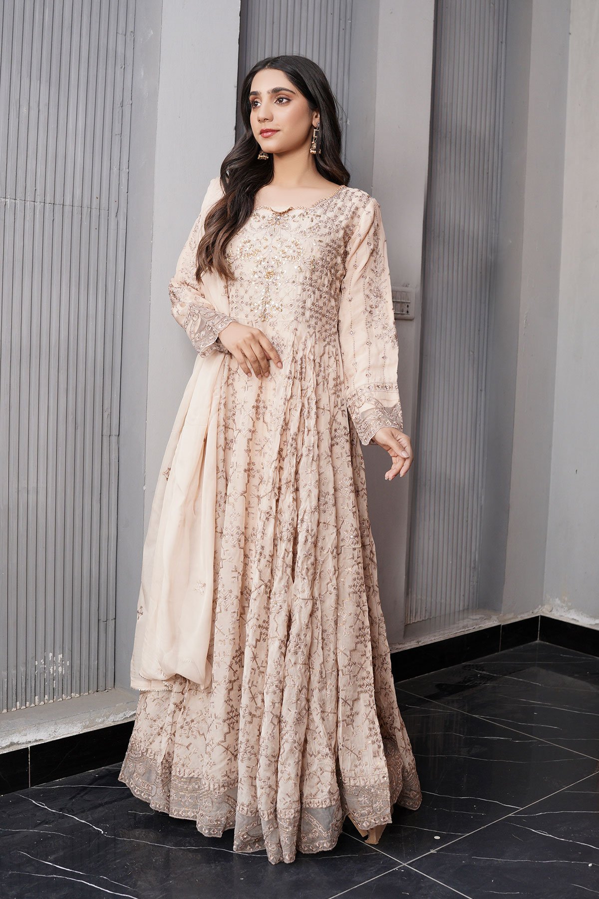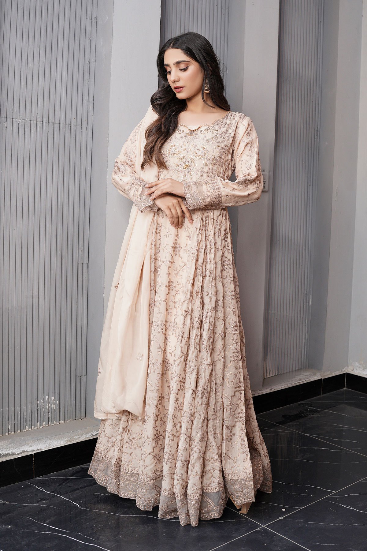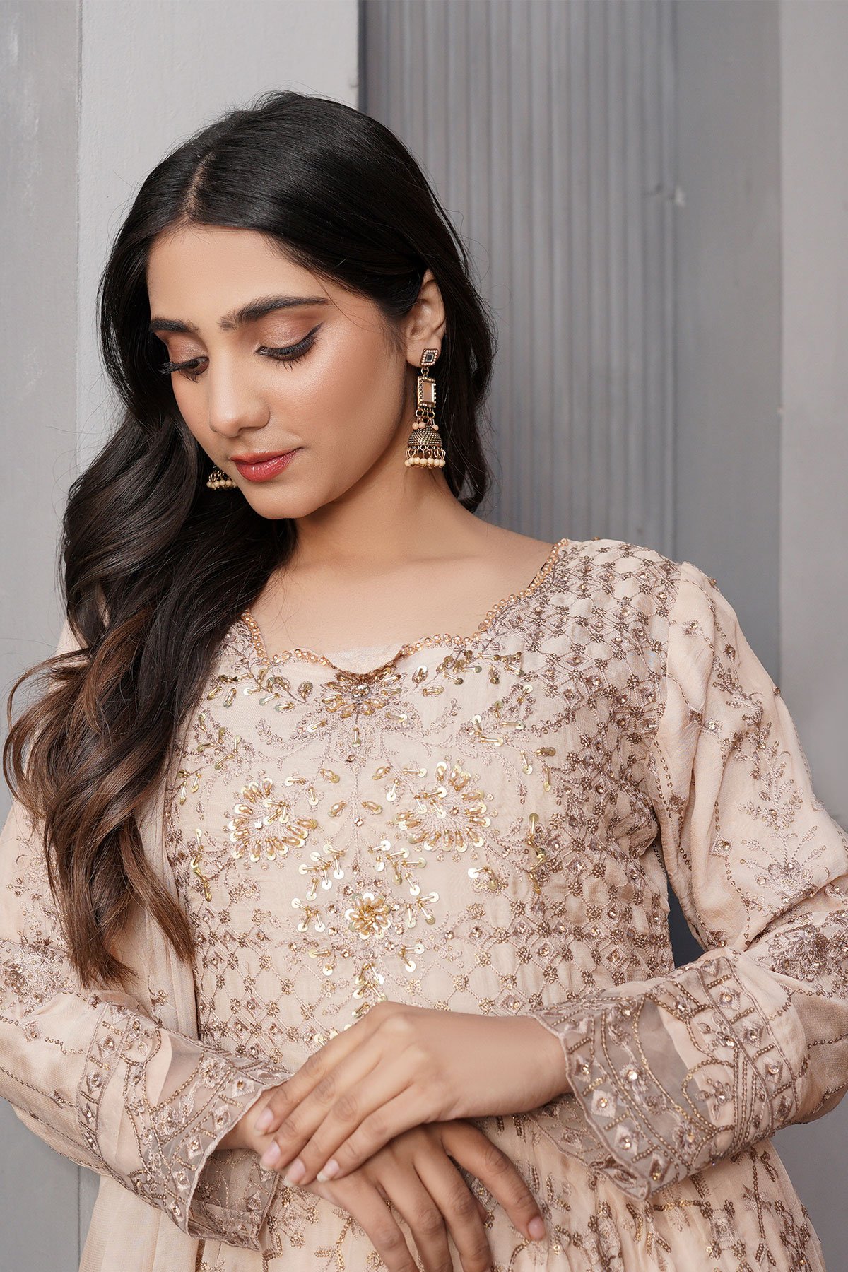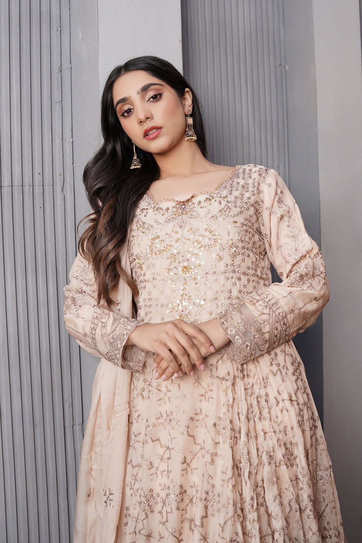 This beautiful 3 piece Aileen chiffon collection features a long peplum gown with luxury thread work embroidered patterns throughout the front and back with bead embellishments around the neckline, finished with a lace embroidered border as well as the cuffs of full length sleeves. It comes with straight leg crepe trousers and the look is finished with a chiffon dupatta.