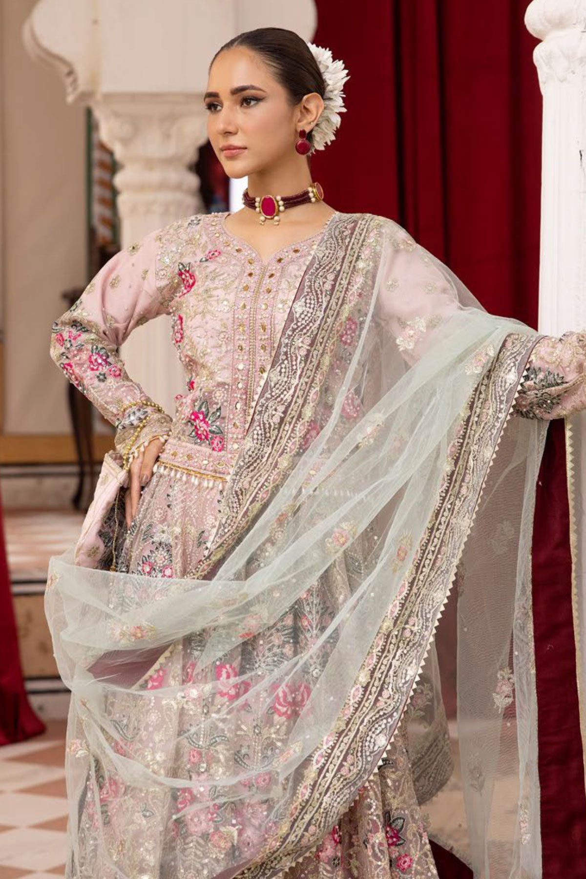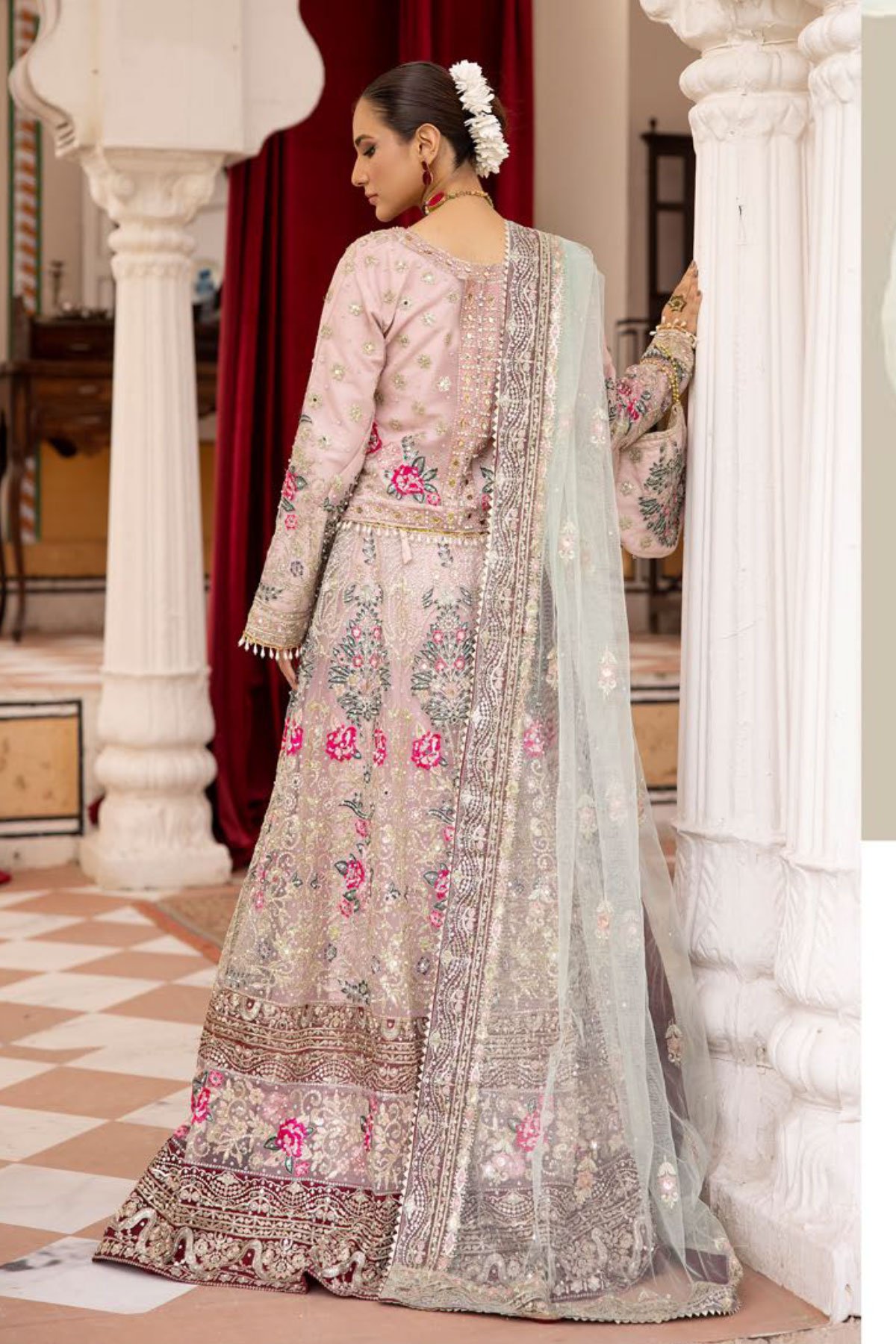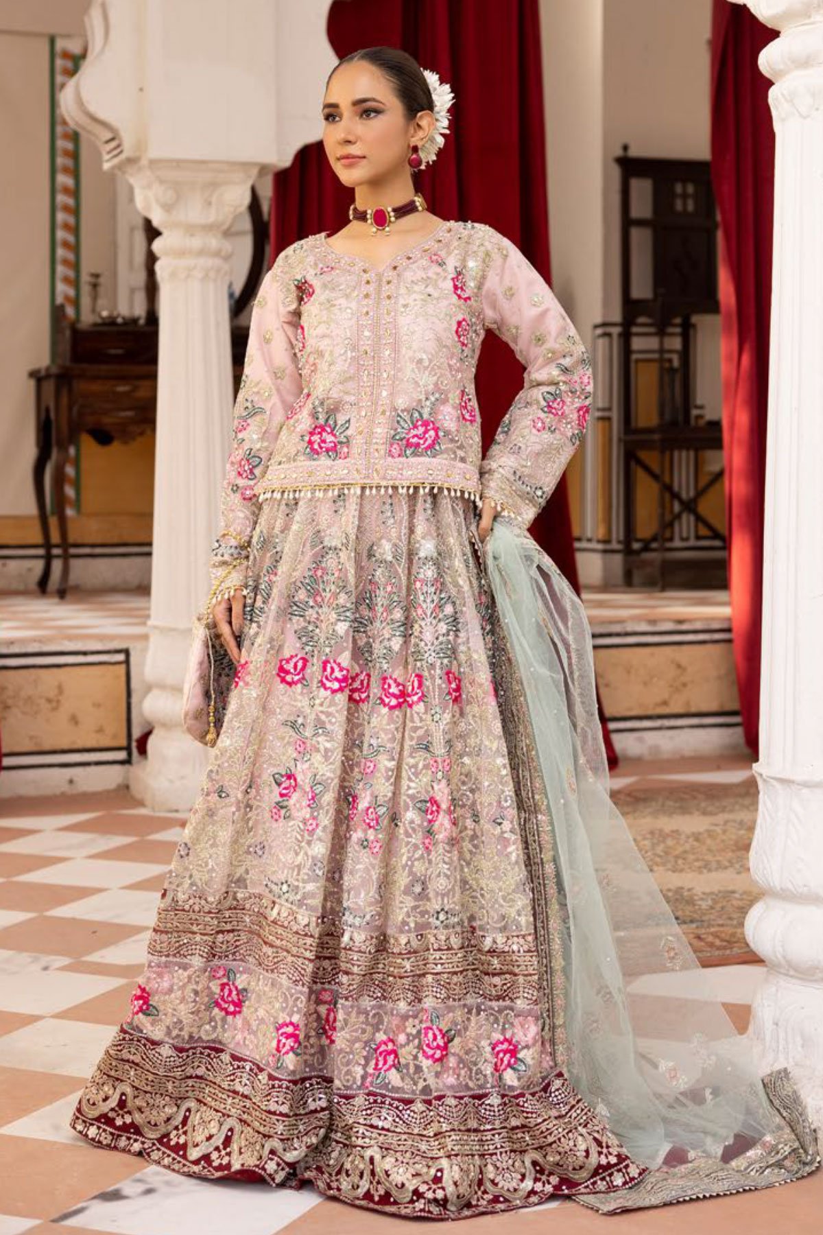 This beautiful 3 piece Alamzeb collection lengha choli features a short blouse with luxury thread work embroidery throughout with scattered diamantés along with sequin motif embellishments and dangling beads on the borders, finished with full length embroidered sleeves. It comes with a luxury embroidered lengha and a contrasted net embroidered dupatta. Embroidered belt is also included to enhance the waist along with a potli bag.